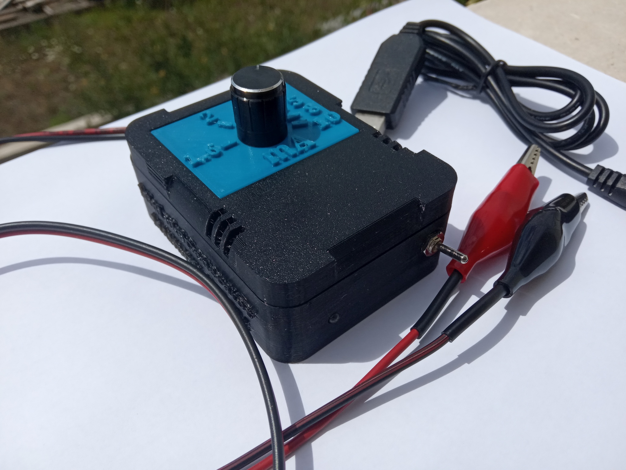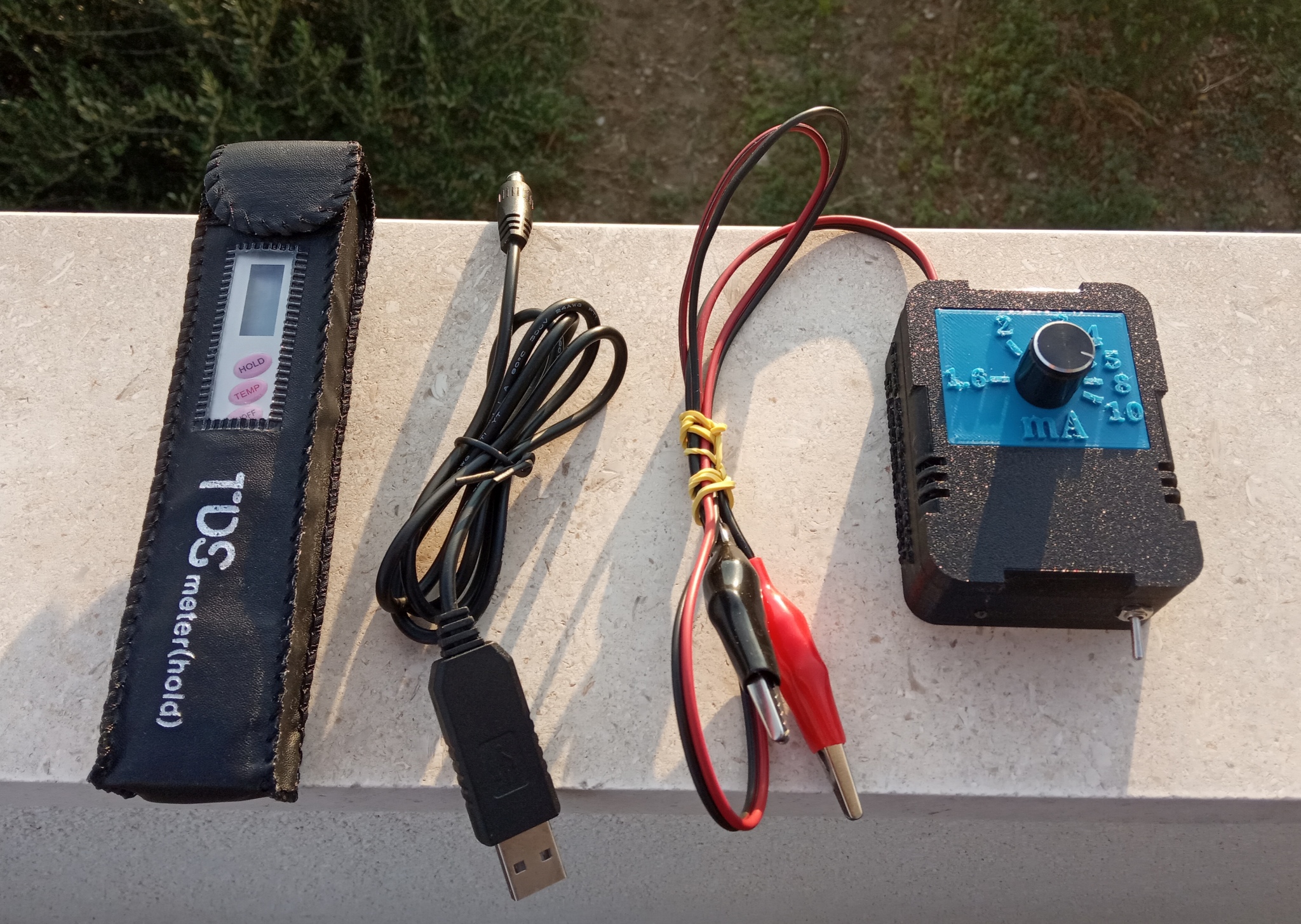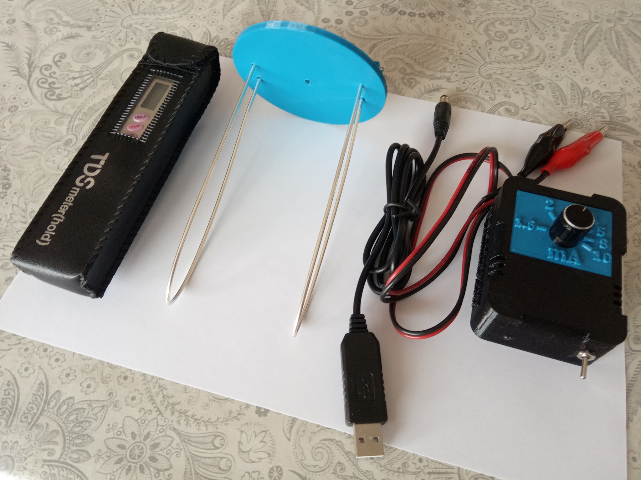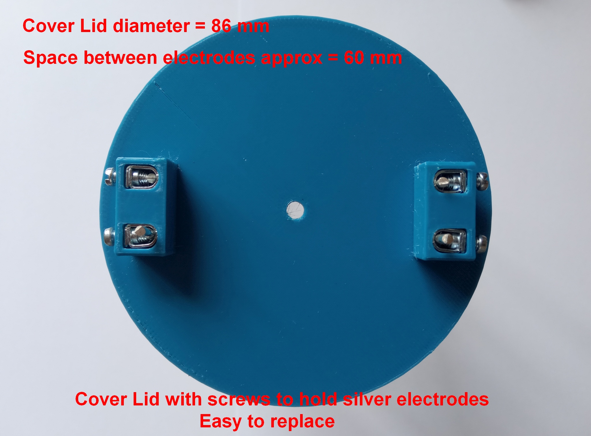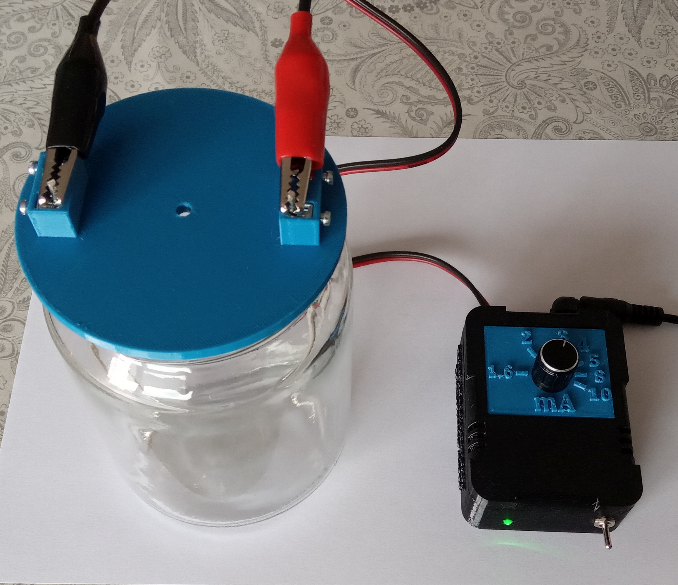 Ograničavanje struje se može obaviti u rasponu od 1.5mA do 10mA. Za manje tegle od 720 ili 750ml najpogodnije je ograničiti struju na 3mA. Posebno dizajnirani 3D isprintani plastični stalak omogućuje lagano učvršćivanje ili skidanje i promjenu elektroda (koje su učvršćene vijcima).