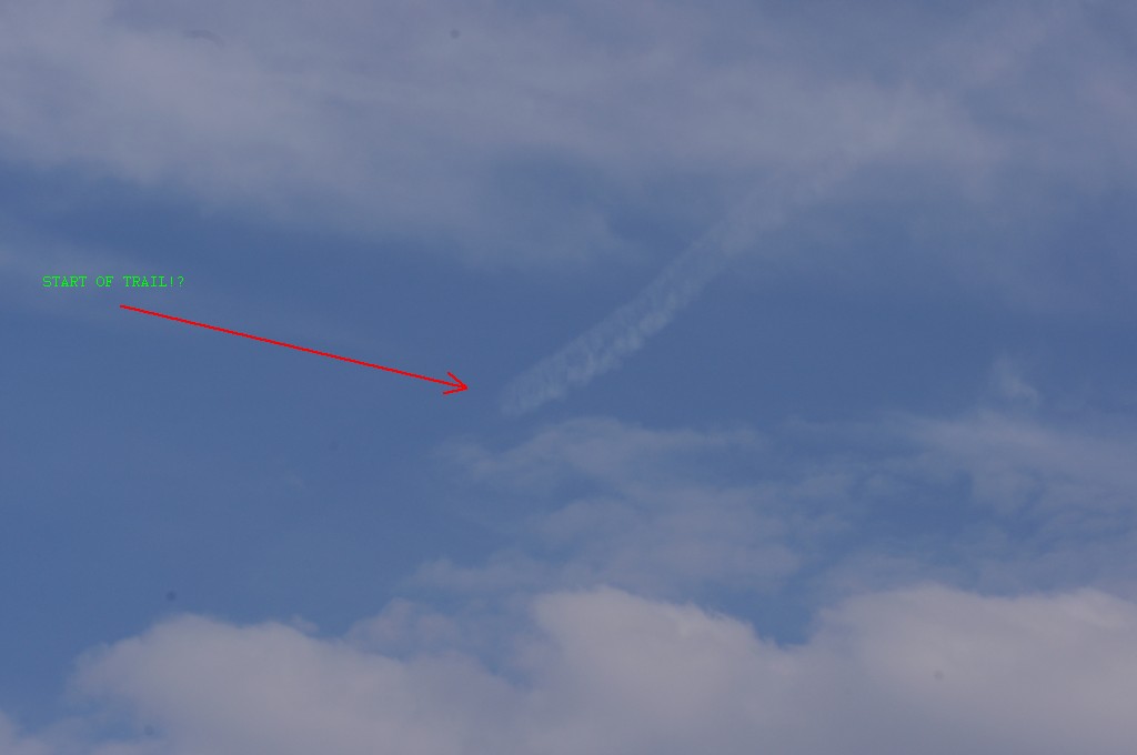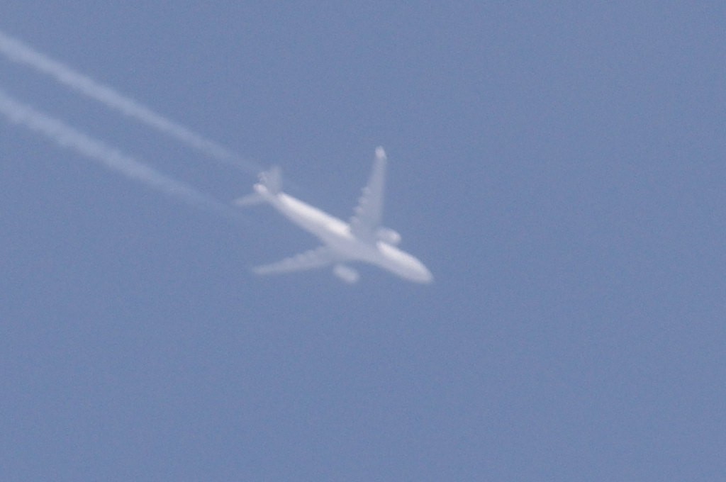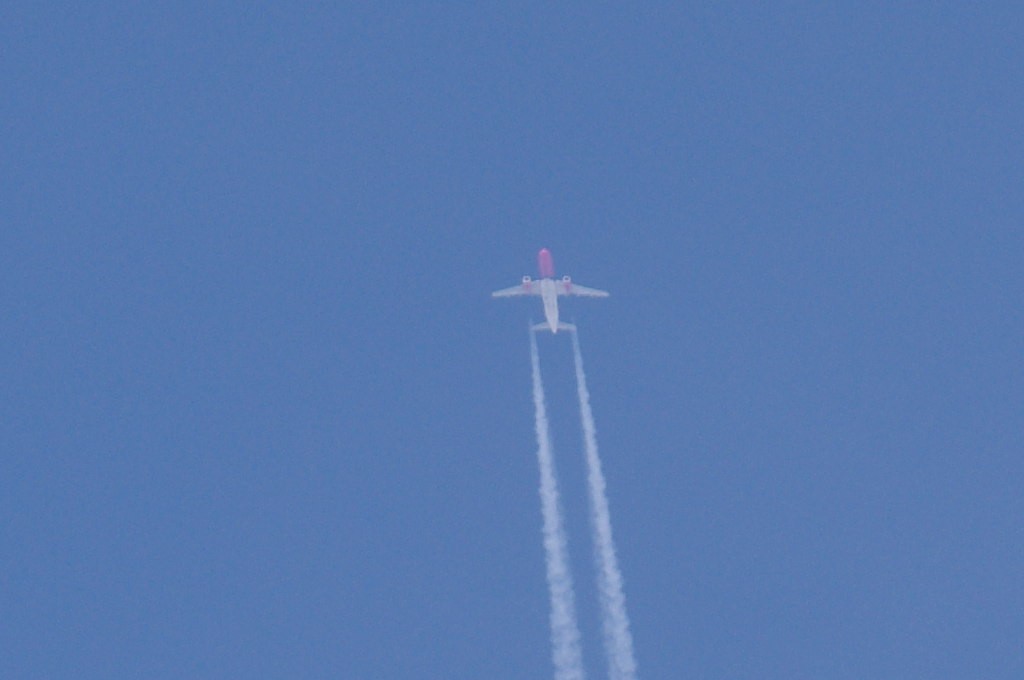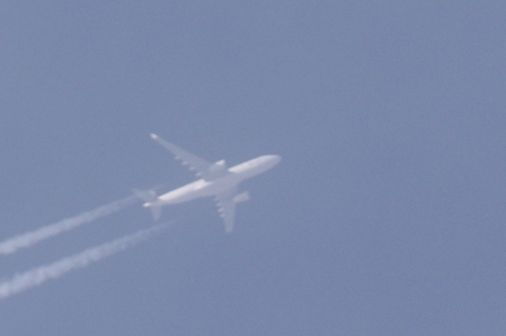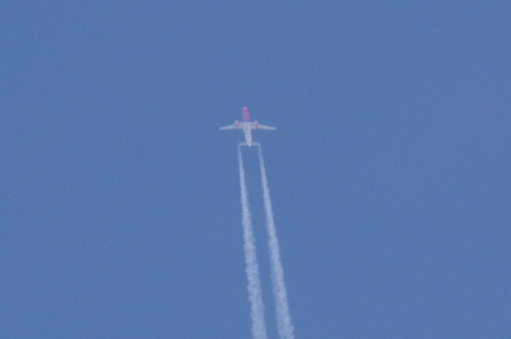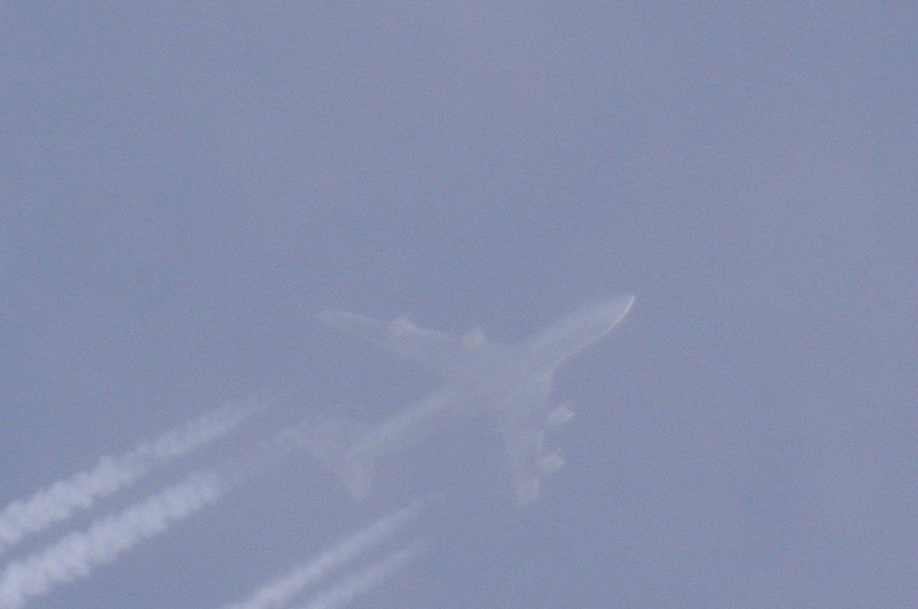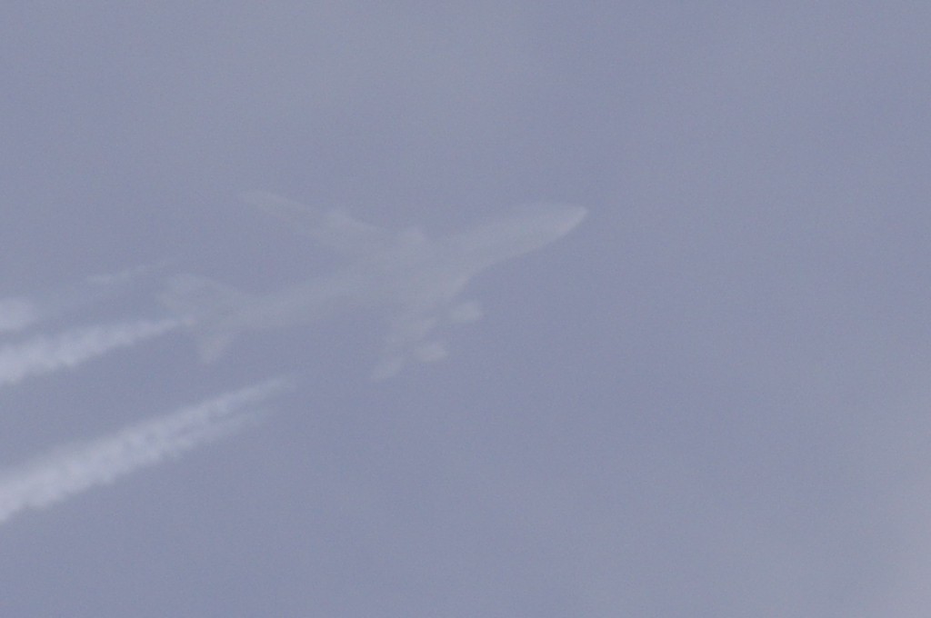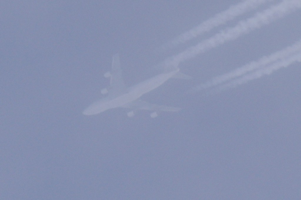 Iz suprotnog smjera, manje od jedne minute evo i drugog 4-motorca. Praši taman paraleleno s tragom od ovoga gore. Nažalost ne mogu raznazti ništa, tako da ga po defaultu stavljam u bijeli tim. Kako li samo praši. Kemikalije se raspršuju kao duhanski dim. Inače, trag ostavlja 'sjenu' na oblacima ili tzv. dark-beam, procijep.
