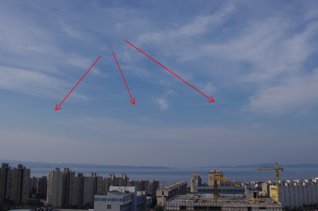 Odmah iza ovoga gore ide i talijanski prašinar. Po bojama mislim da je pripadnik ALITALIA. Fino prati trag ovoga gore. Zadnja slika pokazuje kako im se tragovi i nakon 10 minuta još naziru na horizontu, te kako se fino spajaju u fini kemijski pokrivač.