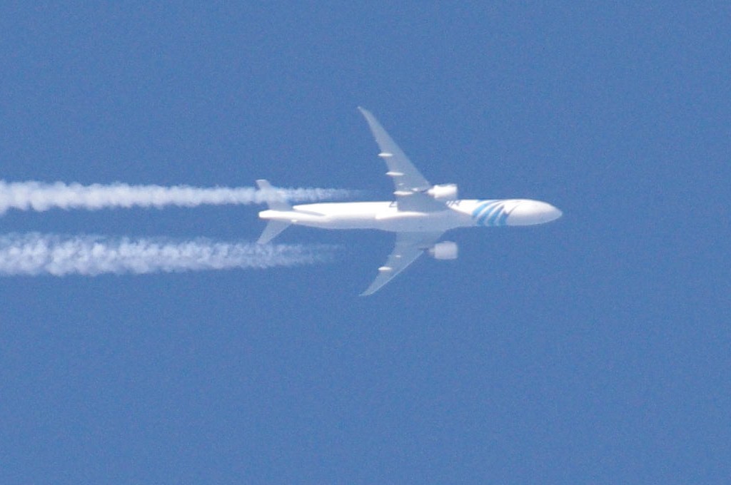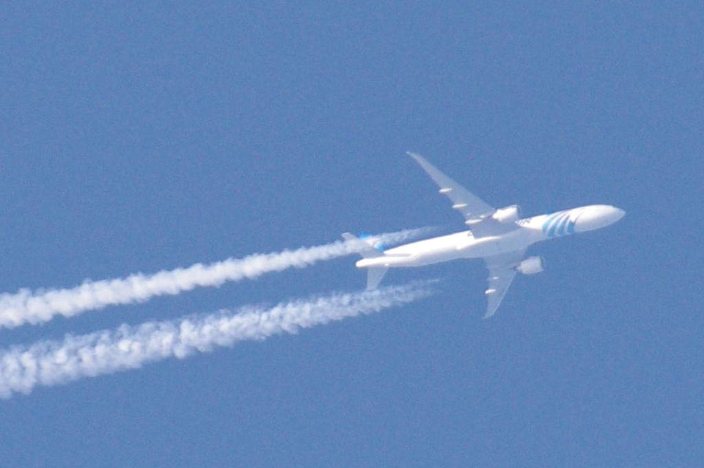 Danas je bilo vrlo prometno. Opet sam uhvatio BEZOLOVNI avion kako ide bez ikakva traga, a odmah iza njega prašinar na nižoj visini i to opet egipatski iz EGYPTAIR-a. Da ponovim: ovo je dokaz da civilne avio-kompanije sudjeluju u zaprašivanju s kemikalijama. Pa krenimo.