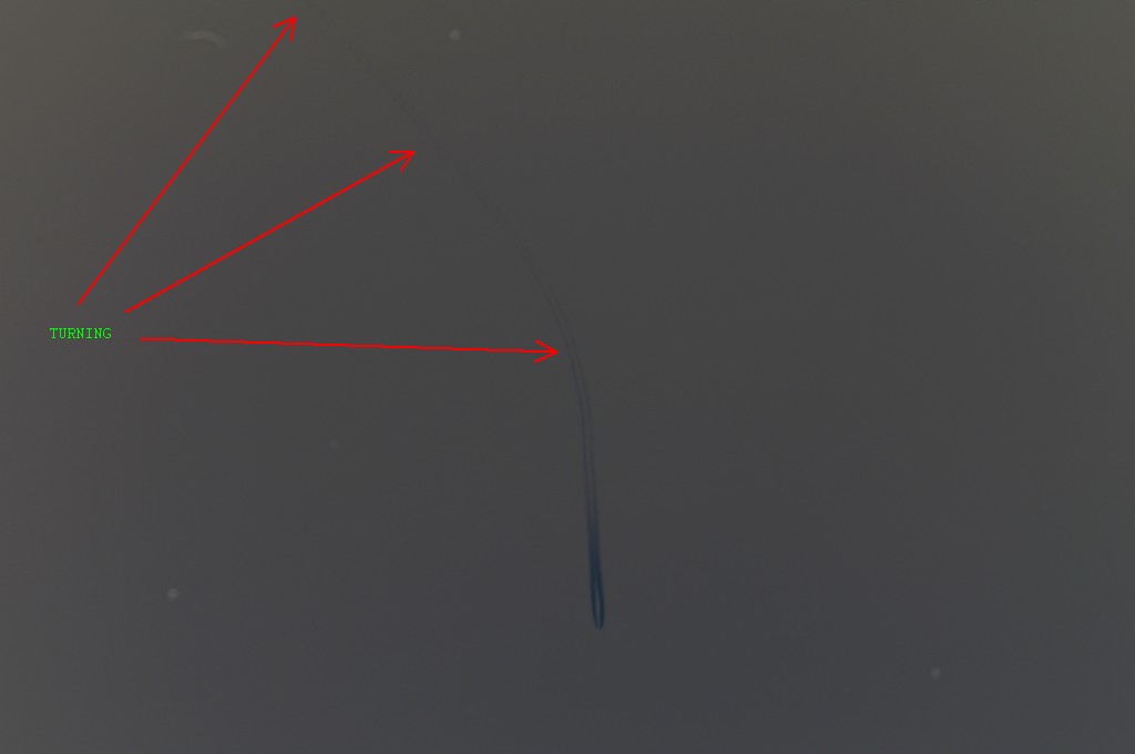 Smjer E->W. Vrijeme 18.56h. Brat blizanac ili isti avion kao i onaj pod rednim brojem 8. Isti smjer, znači da se okrenuo pa opet napravio đir. Ovo je moja sumnja, a to mogu potkrijepiti s dvije zadnje slike (zadnja je negativ) gdje se jasno vidi kemijski trag kako ga ostavlja i kako naglo zaokreće prema jugu kad je već izašao iz područja Splita i došao negdje iznad Šolte.