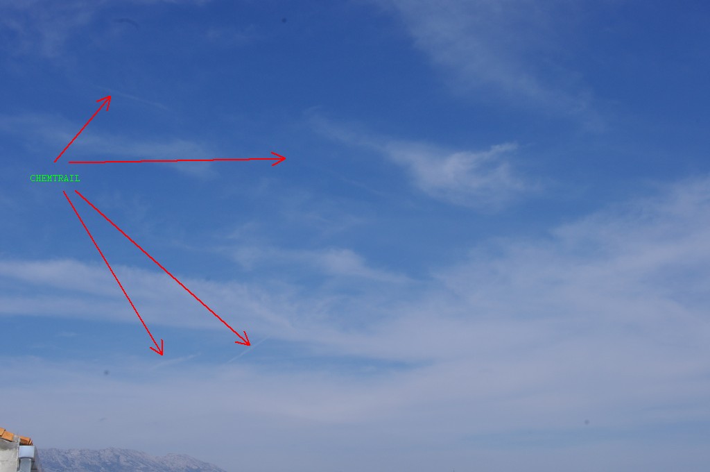 Smjer E->W i N->S. Vrijeme 18.35h. Dok sam pratio zlatno-guzog kako ide prema zapadu i pravi treći od tri savršeno paralelna kemijska traga, krajičkom oka sam primjetio ovoga prašinara kako direktno ide u susret zlatno-guzom na tzv. 'kolizijskom' kursu. E sada bi moj dežurni skeptik rekao da je ovo optička varka jer idu na različitim visinama, da je to sve sigurno i u skladu s putničkim propisima i ostale papazjane. Ja mislim da bi putnici u oba aviona doživili masovni infarkt kad bi vidili ovakvo što.