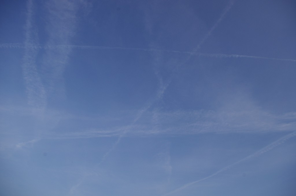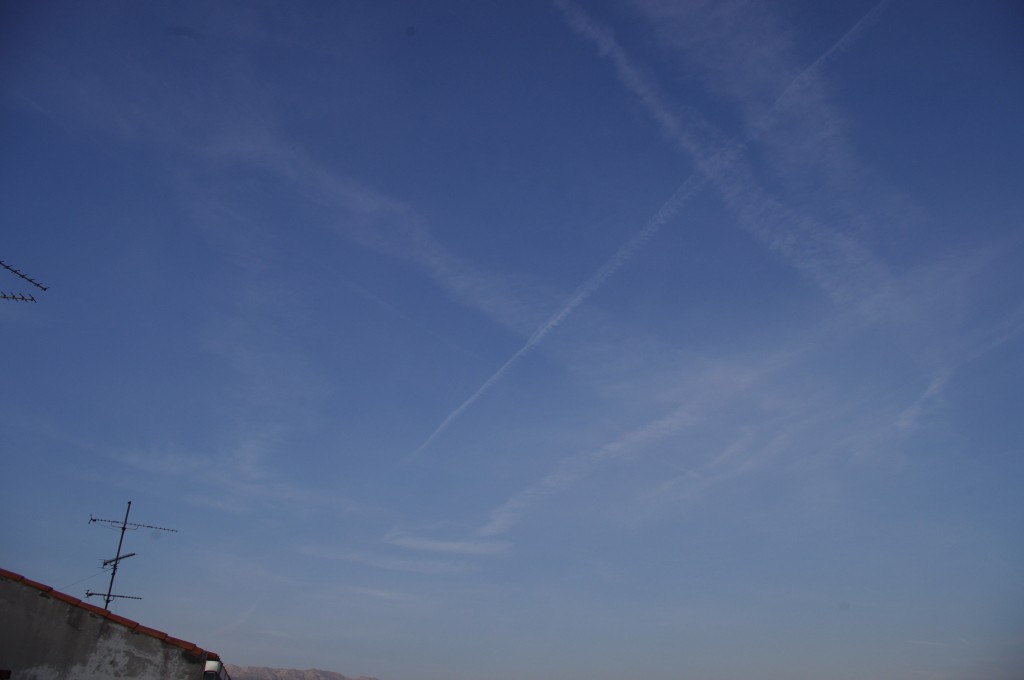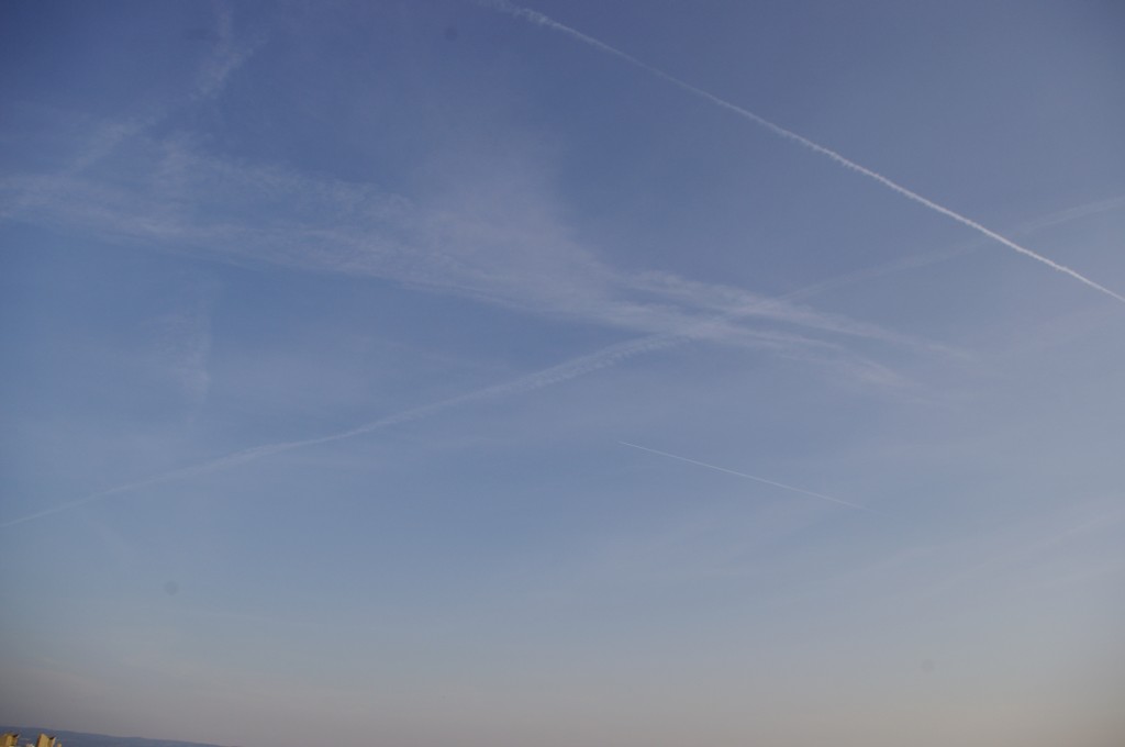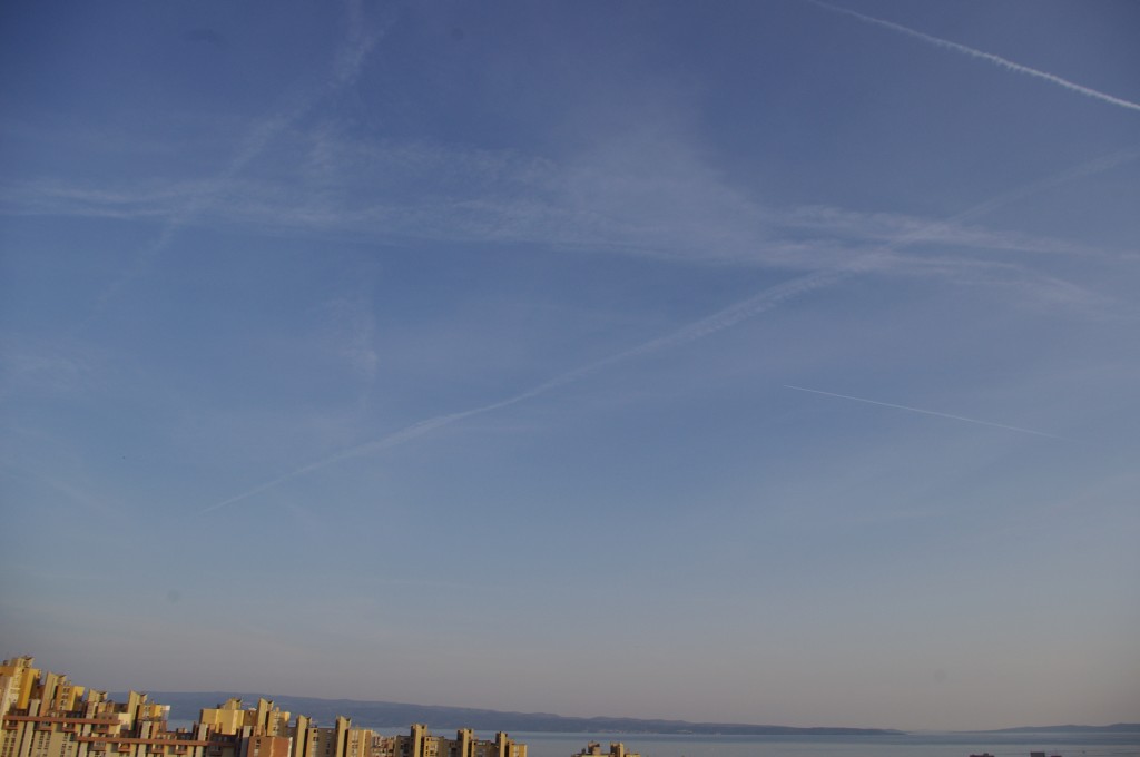 Izvukao sam 18mm objektiv, što inače izbjegavam, ali nebo je nakon ovih zadnjih 5 aviona bilo toliko zagađeno da sam jednostavno to morao uhvatiti s široko-kutnim objektivom. Pa evo panoramskog prikaza neba nakon djelovanja neprijateljske avijacije. Znači sve što se vidi na nebu je KEMIJSKI TRAG! Na sedmoj slici se jasno vide ukupno 6 tragova: 3 su E->W, a 3 su N->S, te tako tvore rešetkati pattern. Ja sam 'uhvatio' kako je nastalo 5 tragova, a ovaj jedan smjera N->S je očigledno malo stariji jer se već 'podebljao' i raširio, po debljini sudim da je star negdje oko 20-30 minuta.