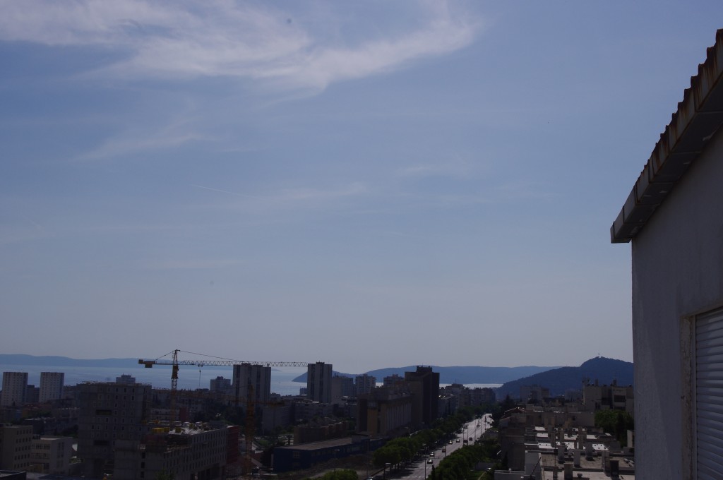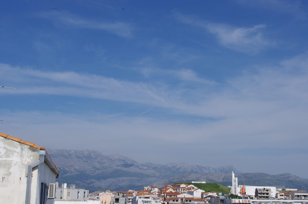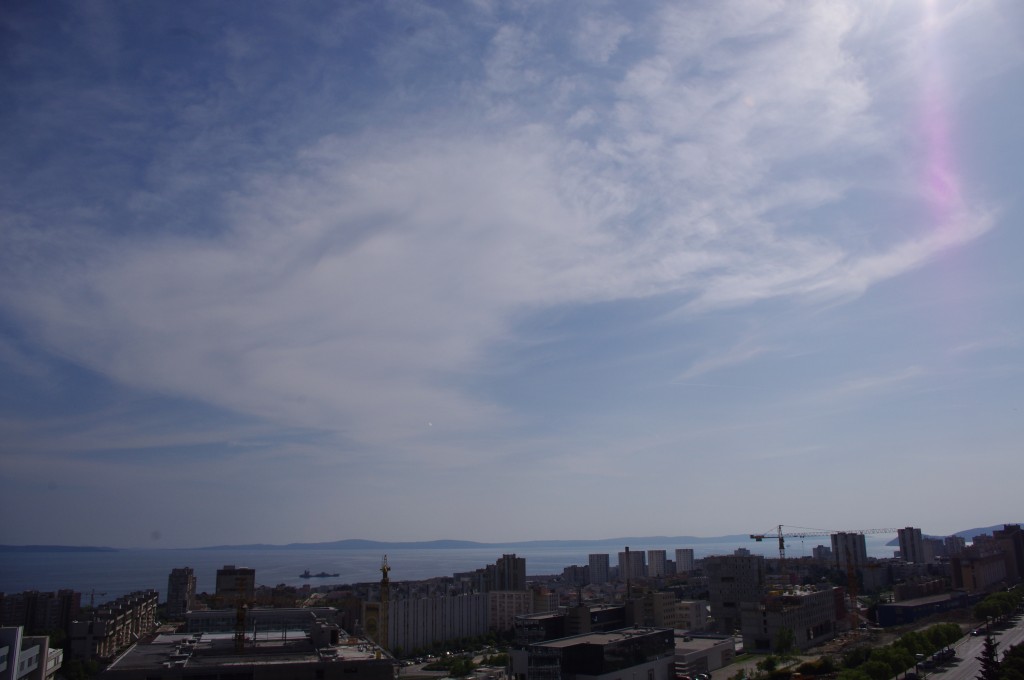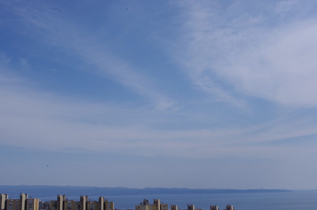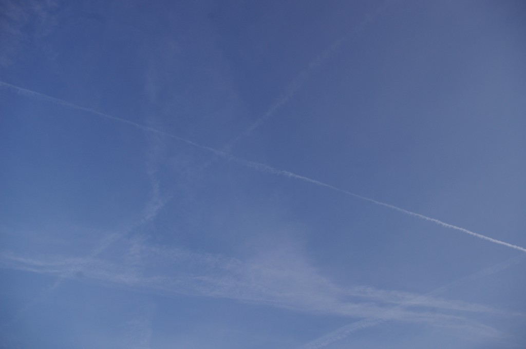 Izvukao sam 18mm objektiv, što inače izbjegavam, ali nebo je nakon ovih zadnjih 5 aviona bilo toliko zagađeno da sam jednostavno to morao uhvatiti s široko-kutnim objektivom. Pa evo panoramskog prikaza neba nakon djelovanja neprijateljske avijacije. Znači sve što se vidi na nebu je KEMIJSKI TRAG! Na sedmoj slici se jasno vide ukupno 6 tragova: 3 su E->W, a 3 su N->S, te tako tvore rešetkati pattern. Ja sam 'uhvatio' kako je nastalo 5 tragova, a ovaj jedan smjera N->S je očigledno malo stariji jer se već 'podebljao' i raširio, po debljini sudim da je star negdje oko 20-30 minuta.