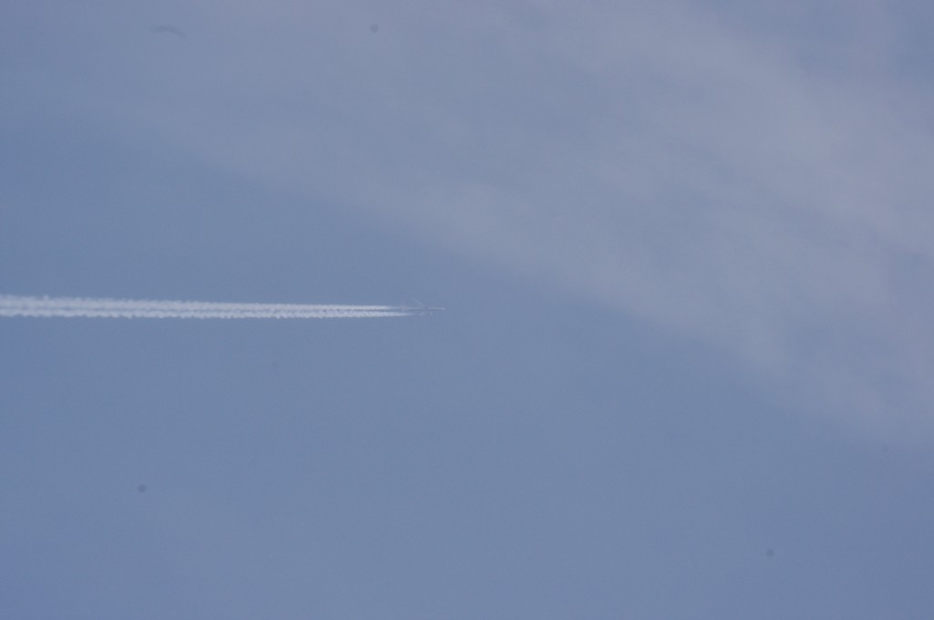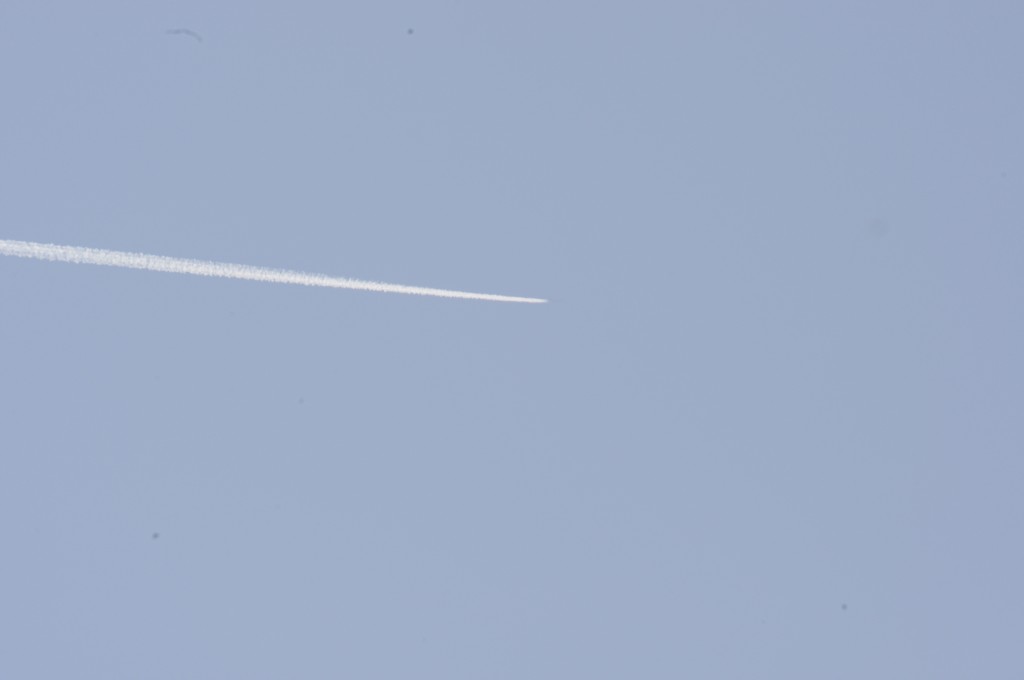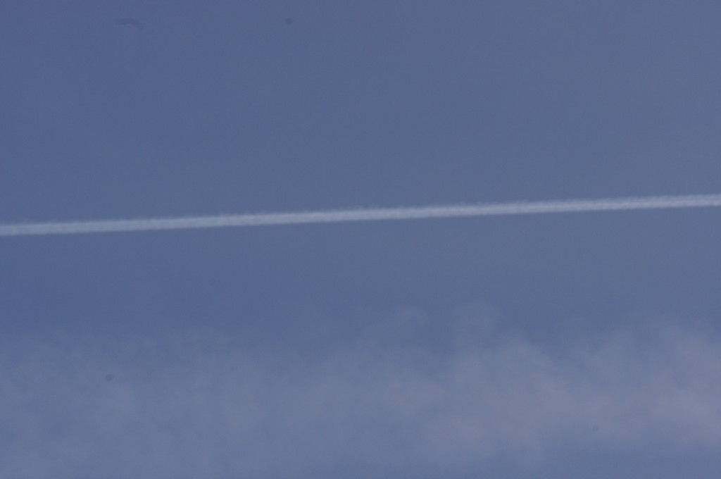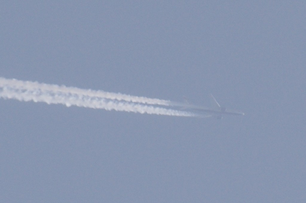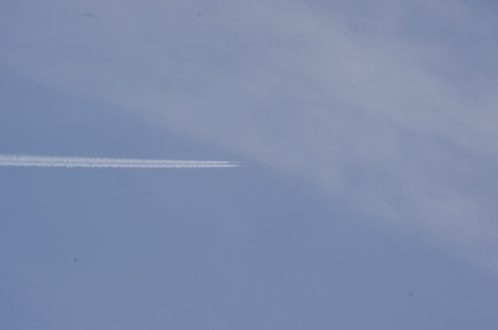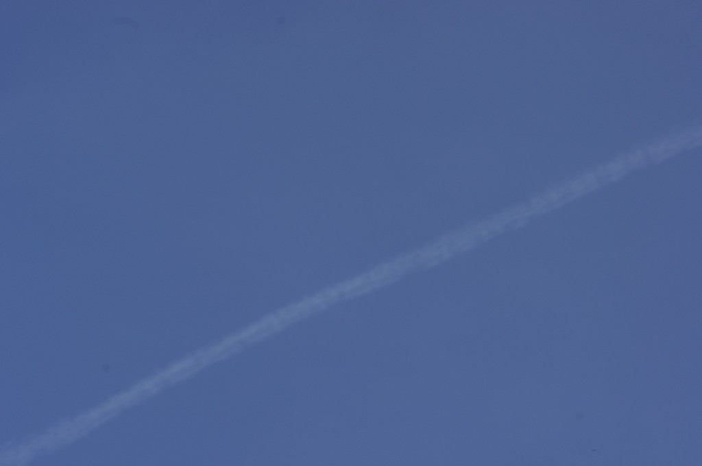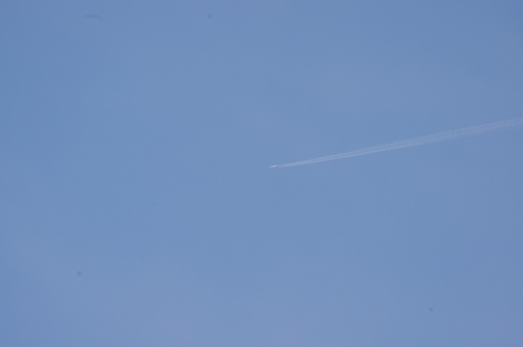 Smjer N->S. Vrijeme 16.36h. Po motorima na 'guzici' pretpostavljam da je neka verzija Douglasa. Ovo je tzv. BEZOLOVNI avion, tj. avion koji ne ispušta ama baš nikakav trag iza sebe. Ovakvi avioni su prava rijetkost na nebu, a pružaju 100% dokaz da svi ostali avioni koji praše, a lete na istima ili manjim visinama u perfektnim vremenskim uvjetima, ispuštaju iz sebe kemikalije. Drugog objašnjenja nema. Jedino je čudno zašto i ovaj ne praši, a to može biti: ova kompanija ne sudjeluje u operaciji zaprašivanja ili mu je nestalo kemikalija.