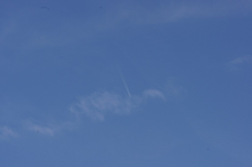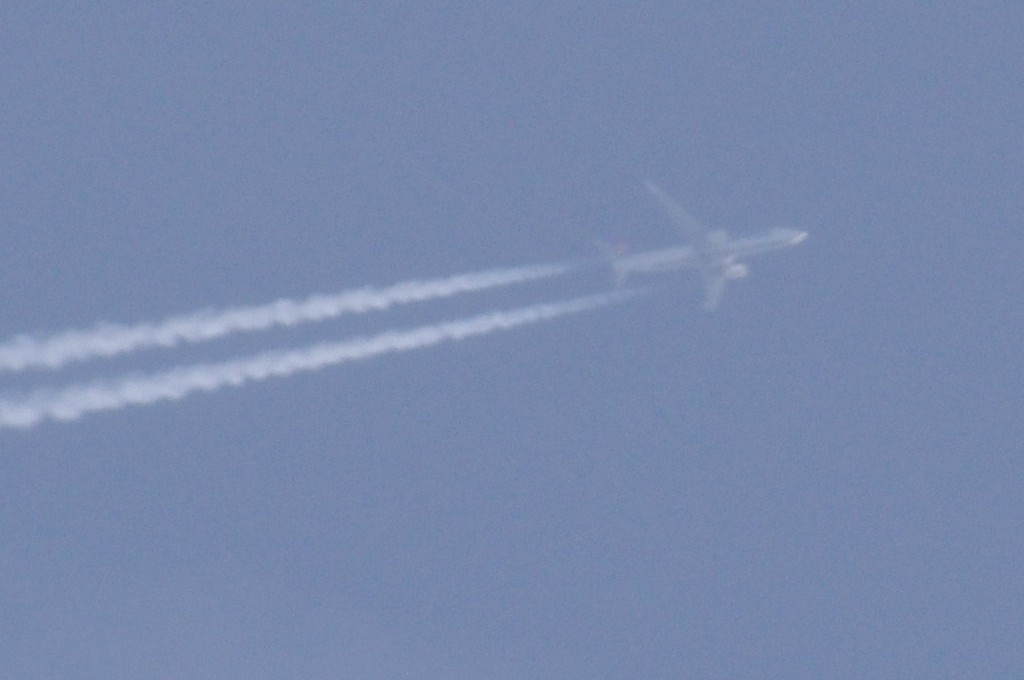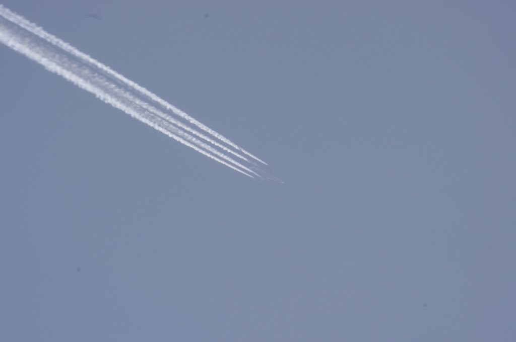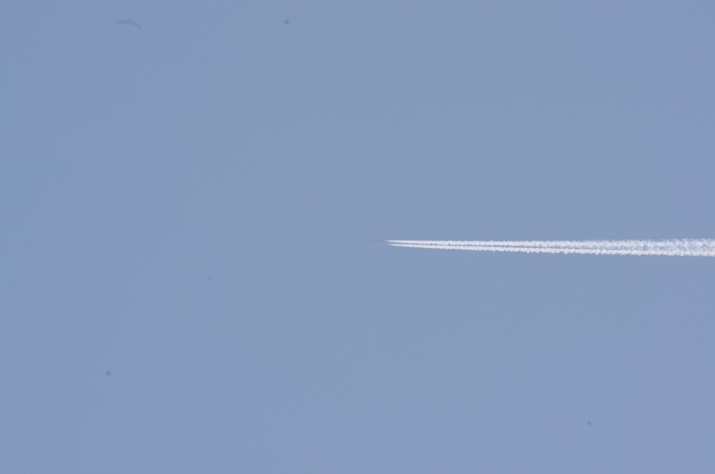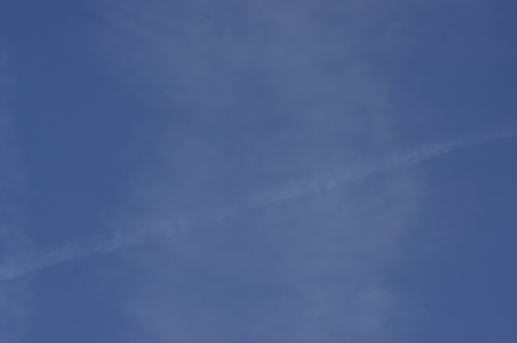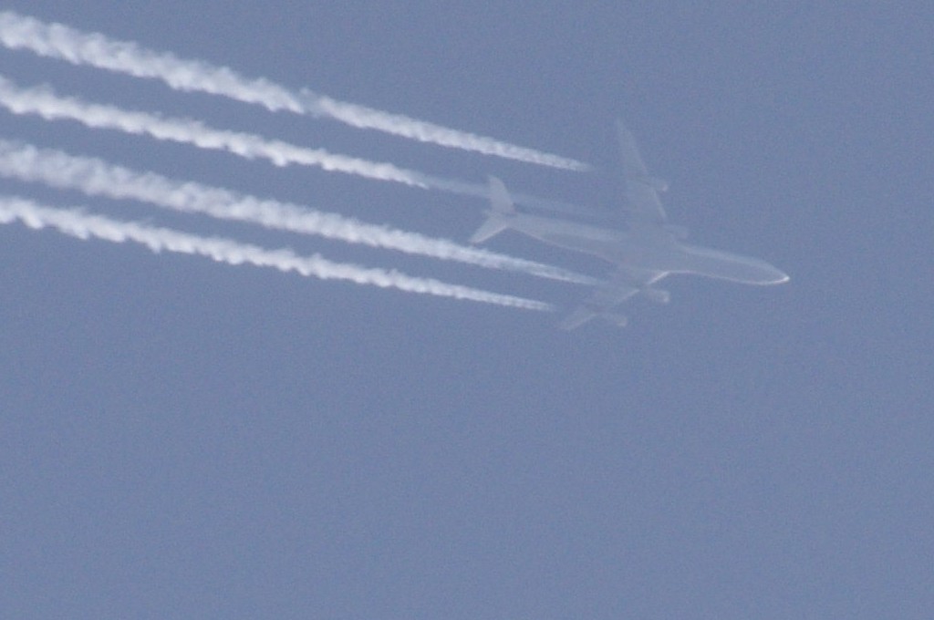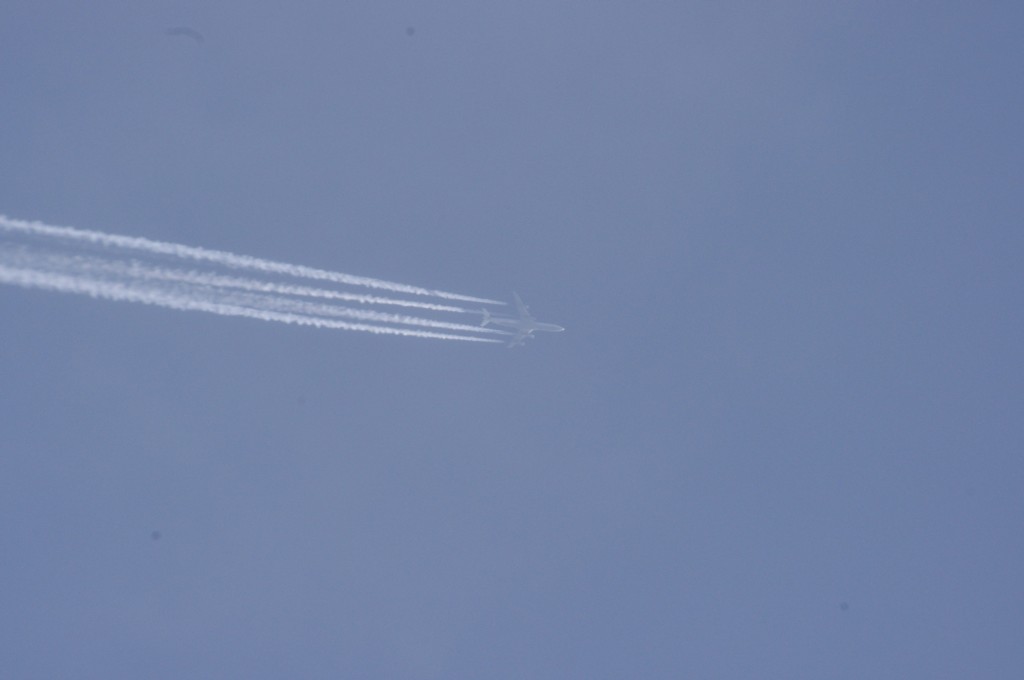 Smjer N->S. Vrijeme 16.36h. Po motorima na 'guzici' pretpostavljam da je neka verzija Douglasa. Ovo je tzv. BEZOLOVNI avion, tj. avion koji ne ispušta ama baš nikakav trag iza sebe. Ovakvi avioni su prava rijetkost na nebu, a pružaju 100% dokaz da svi ostali avioni koji praše, a lete na istima ili manjim visinama u perfektnim vremenskim uvjetima, ispuštaju iz sebe kemikalije. Drugog objašnjenja nema. Jedino je čudno zašto i ovaj ne praši, a to može biti: ova kompanija ne sudjeluje u operaciji zaprašivanja ili mu je nestalo kemikalija.