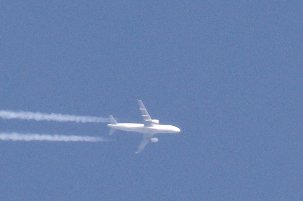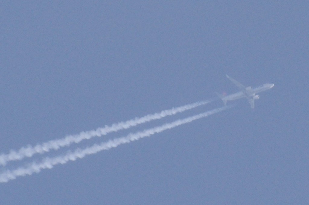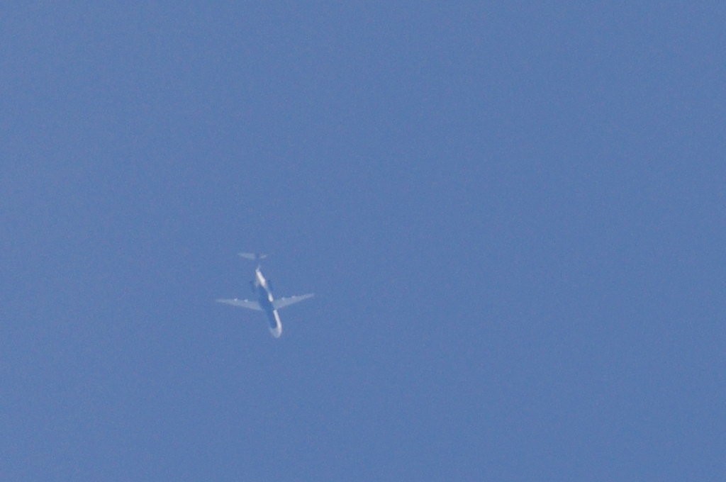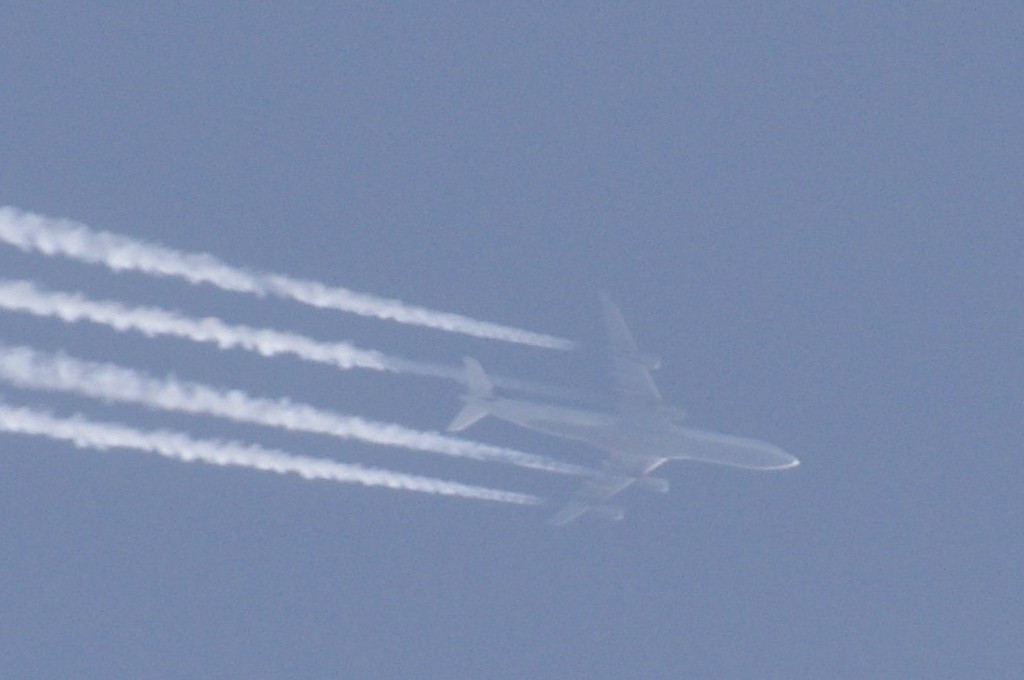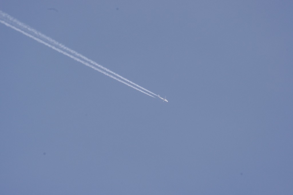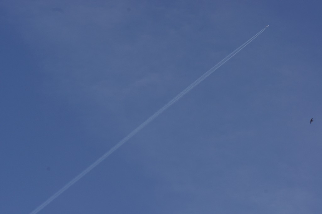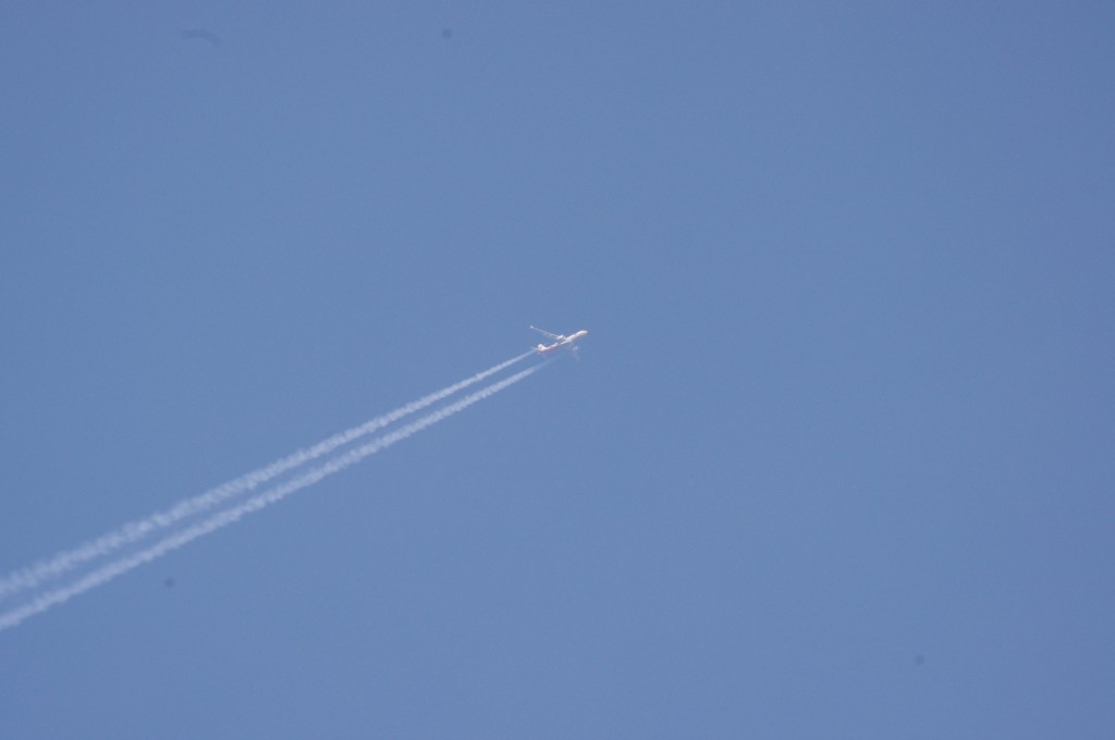 Smjer N->S. Vrijeme 16.36h. Po motorima na 'guzici' pretpostavljam da je neka verzija Douglasa. Ovo je tzv. BEZOLOVNI avion, tj. avion koji ne ispušta ama baš nikakav trag iza sebe. Ovakvi avioni su prava rijetkost na nebu, a pružaju 100% dokaz da svi ostali avioni koji praše, a lete na istima ili manjim visinama u perfektnim vremenskim uvjetima, ispuštaju iz sebe kemikalije. Drugog objašnjenja nema. Jedino je čudno zašto i ovaj ne praši, a to može biti: ova kompanija ne sudjeluje u operaciji zaprašivanja ili mu je nestalo kemikalija.