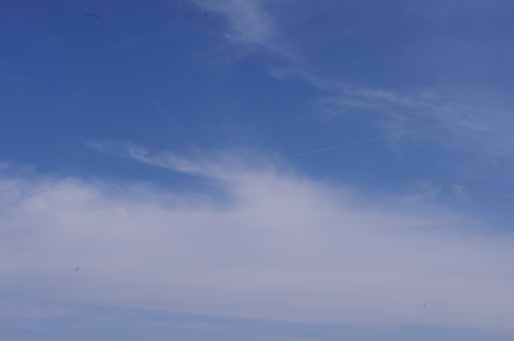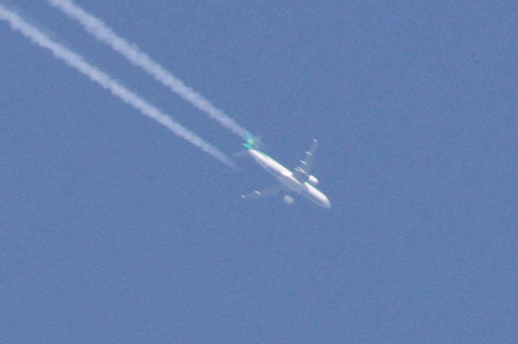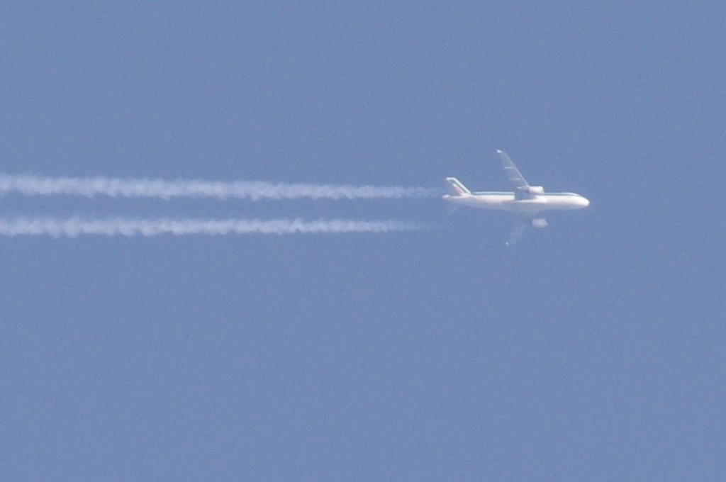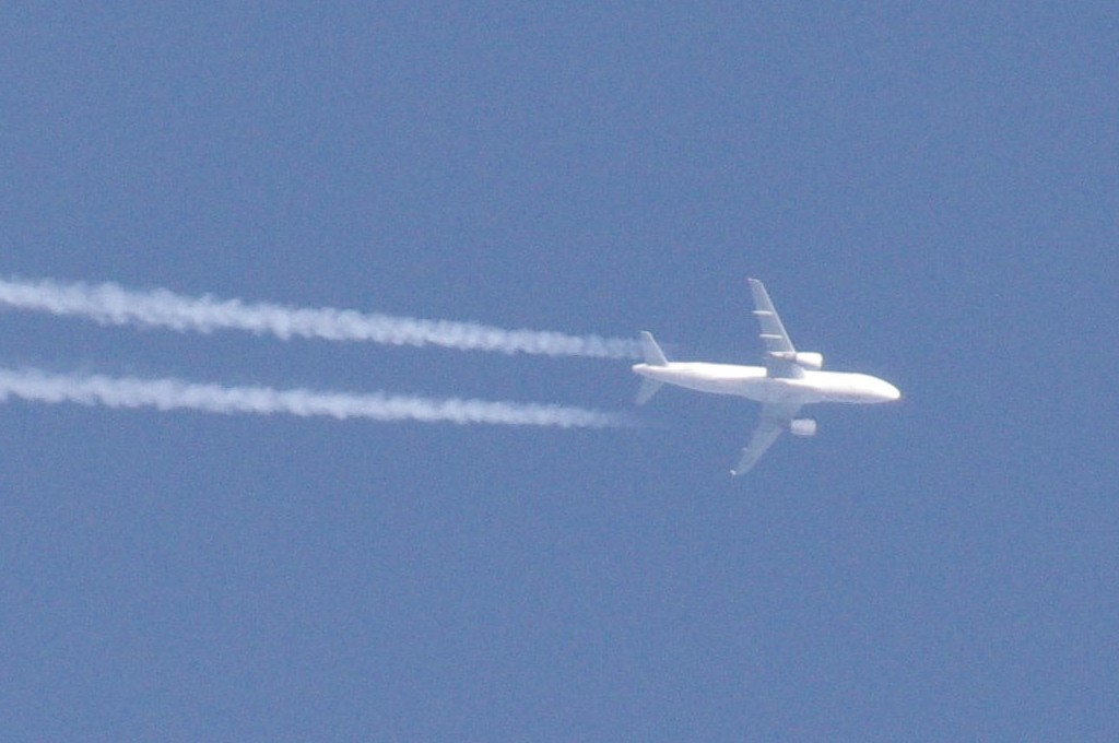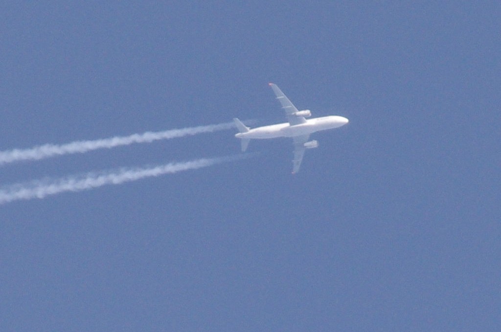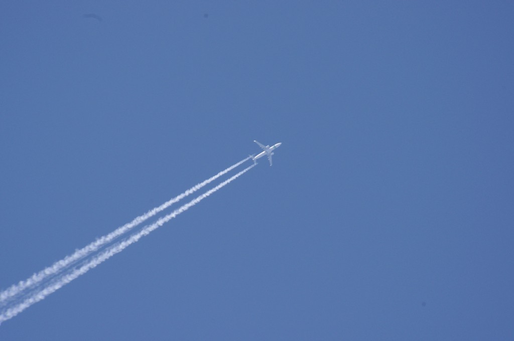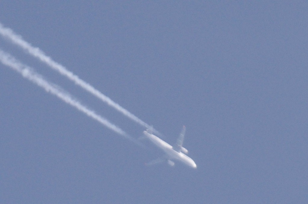 Smjer N->S. Vrijeme 16.36h. Po motorima na 'guzici' pretpostavljam da je neka verzija Douglasa. Ovo je tzv. BEZOLOVNI avion, tj. avion koji ne ispušta ama baš nikakav trag iza sebe. Ovakvi avioni su prava rijetkost na nebu, a pružaju 100% dokaz da svi ostali avioni koji praše, a lete na istima ili manjim visinama u perfektnim vremenskim uvjetima, ispuštaju iz sebe kemikalije. Drugog objašnjenja nema. Jedino je čudno zašto i ovaj ne praši, a to može biti: ova kompanija ne sudjeluje u operaciji zaprašivanja ili mu je nestalo kemikalija.