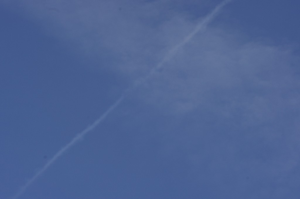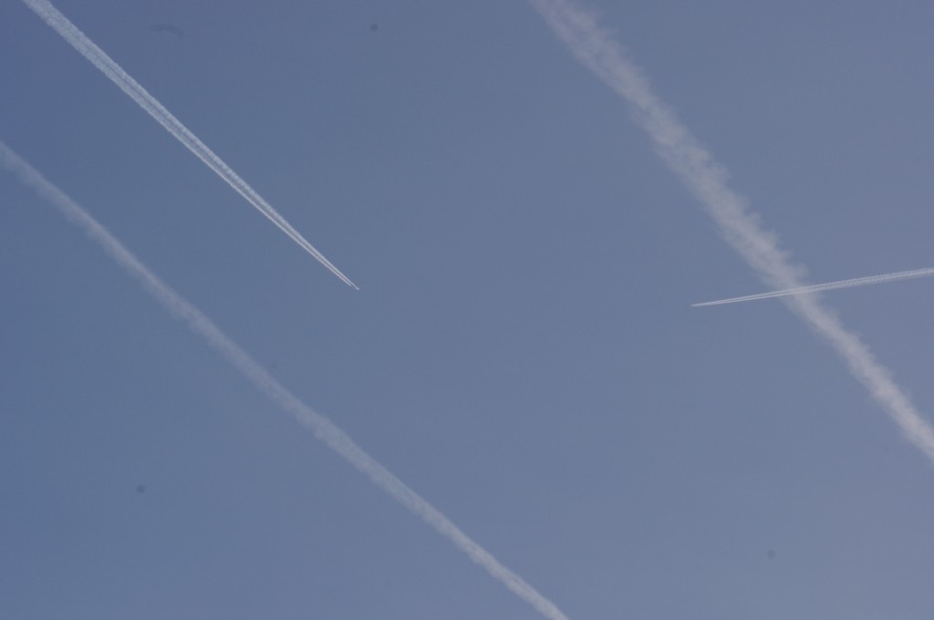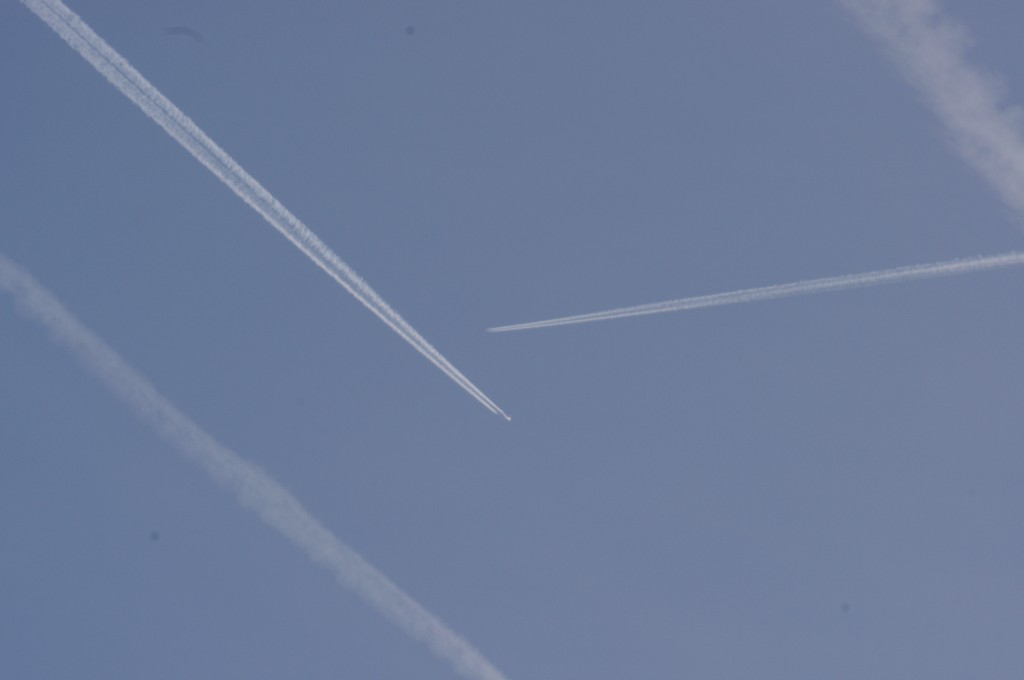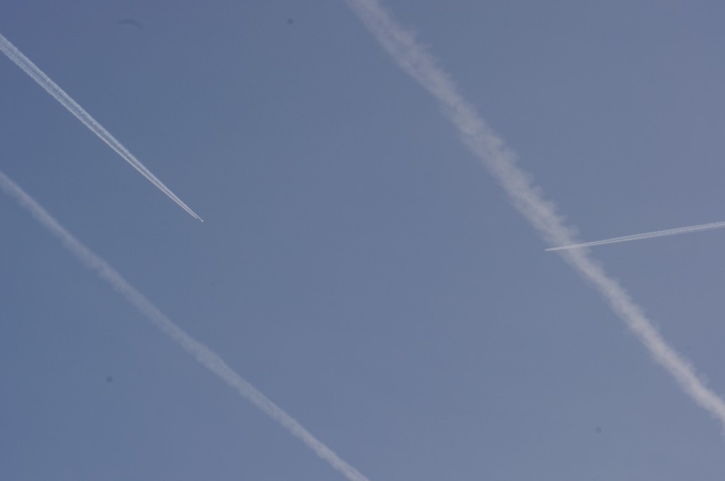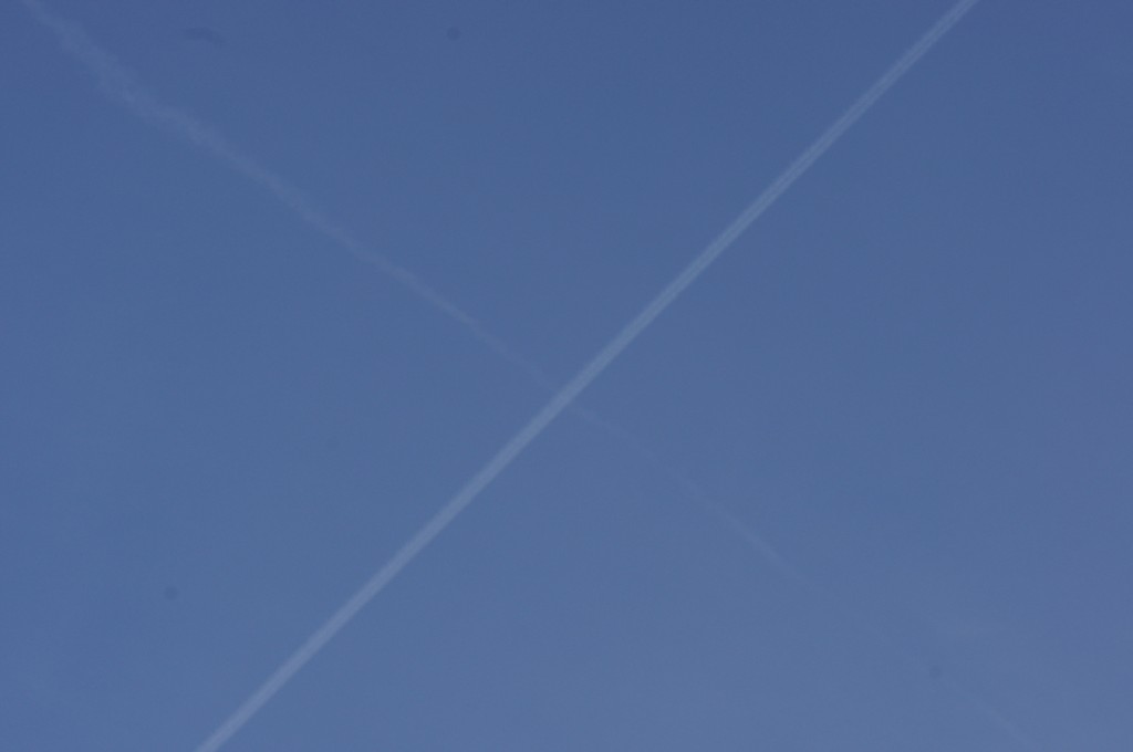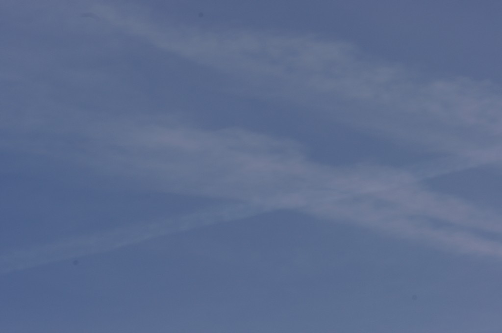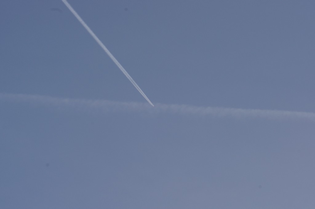 Ovo je moj dosada najbolje snimljeni križ uživo. Svaka im čast, ovi nisu pičkice, prošli su za dlaku jedan od drugoga unutar 1-2sekunde. Ova četiri traga: 3 paralelna od istoka k zapadu i ovaj križni od sjevera prema jugu će ostati do kraja dana i lagano se rasipati i potiho padati po nama, ubijajući nas jednog po jednog. Mamicu vam prašinarsku, sada sam vas uhvatio u nedjelu.