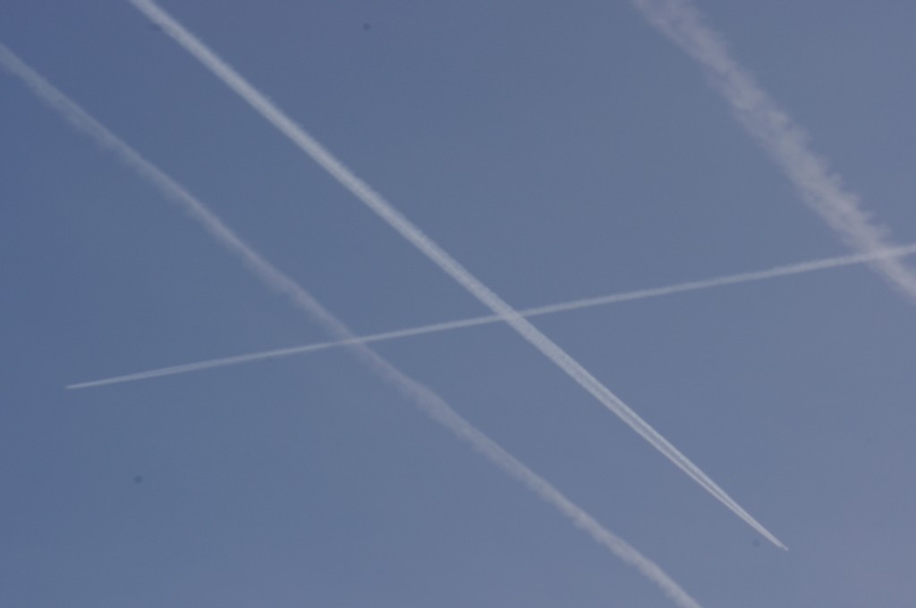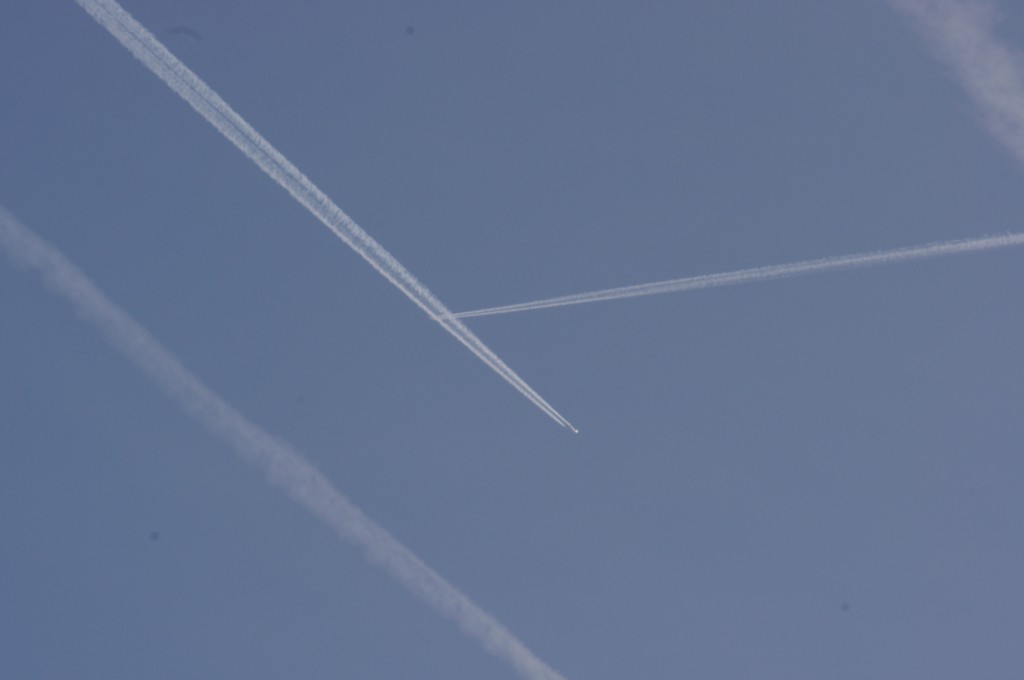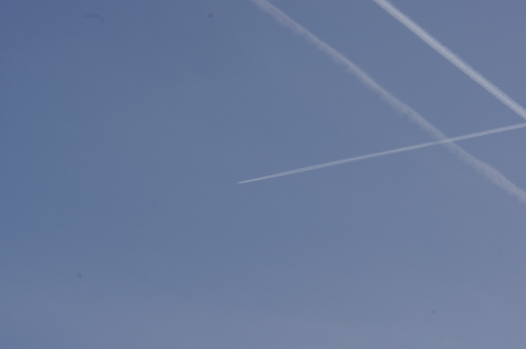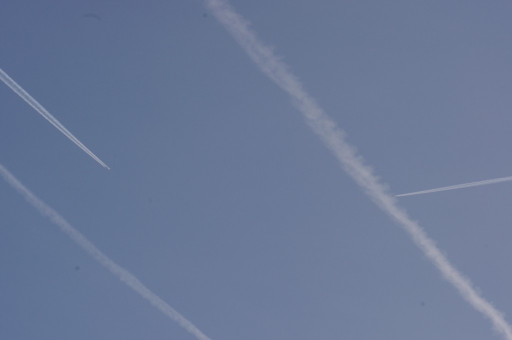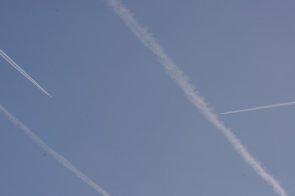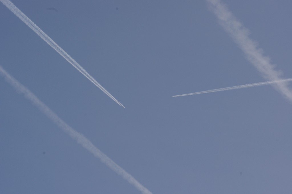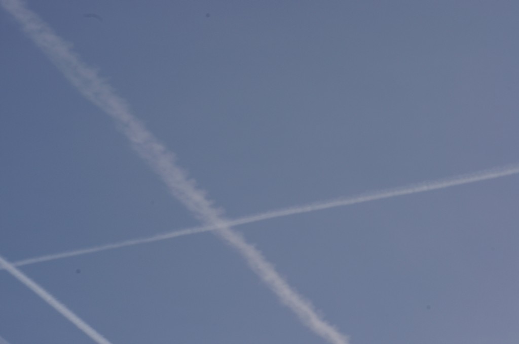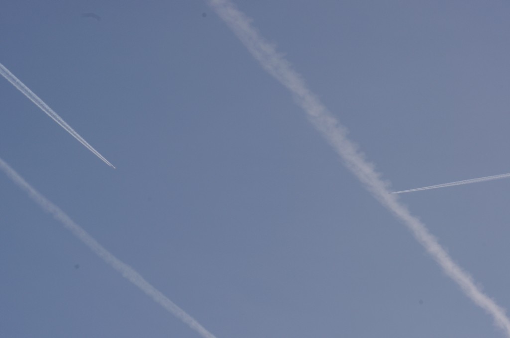 Ovo je moj dosada najbolje snimljeni križ uživo. Svaka im čast, ovi nisu pičkice, prošli su za dlaku jedan od drugoga unutar 1-2sekunde. Ova četiri traga: 3 paralelna od istoka k zapadu i ovaj križni od sjevera prema jugu će ostati do kraja dana i lagano se rasipati i potiho padati po nama, ubijajući nas jednog po jednog. Mamicu vam prašinarsku, sada sam vas uhvatio u nedjelu.