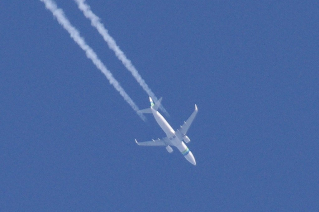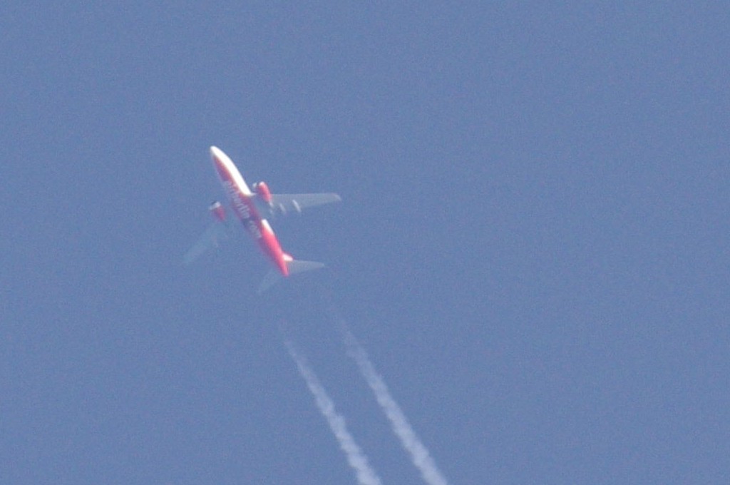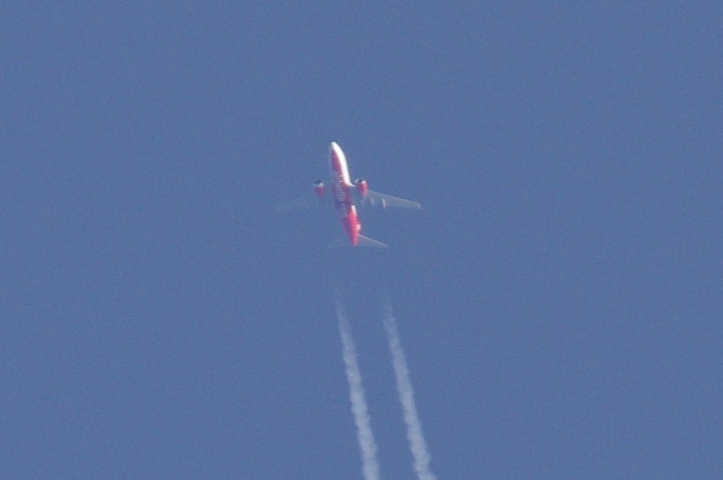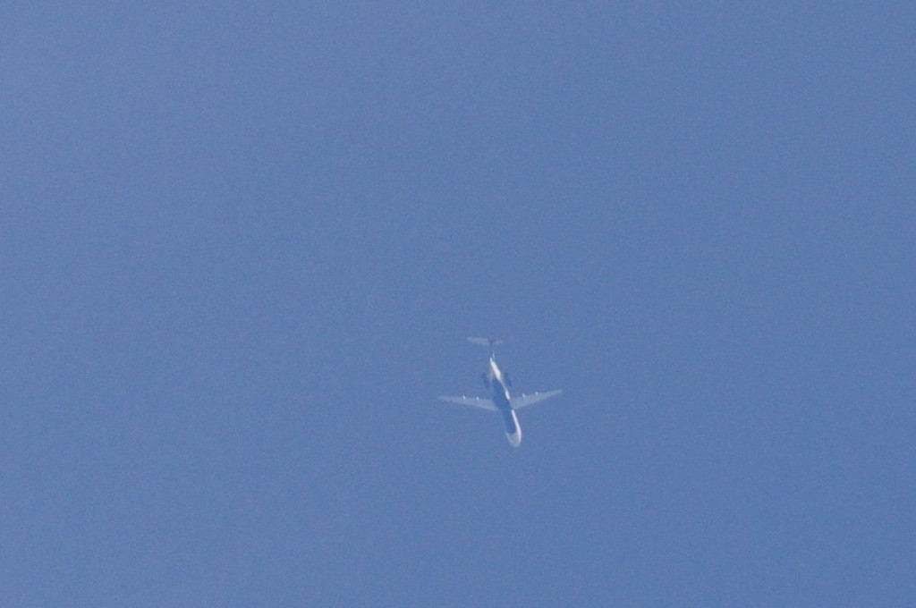Smjer NW->SE. Vrijeme 16.54h. Nakon malo više iskustva, s 99% sigurnošču mogu reći da je ovo Boeing 737, a najviše se razaznaje po okruglim crnim točkama na trbuhu koji su u biti uvučeni kotači. Praši li ga praši. 100% prašinar u to nema sumnje.