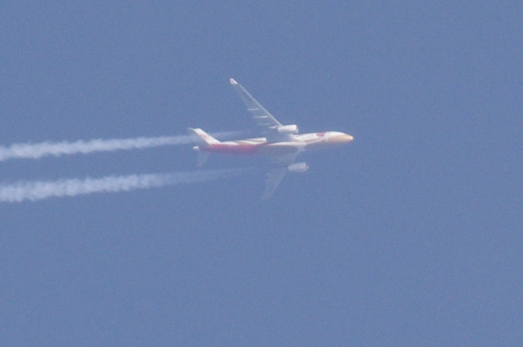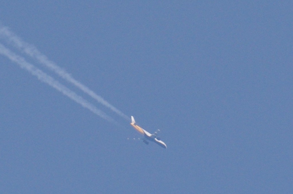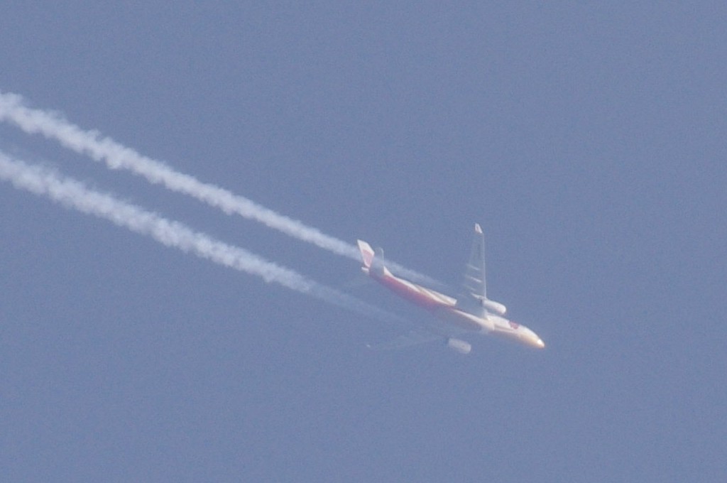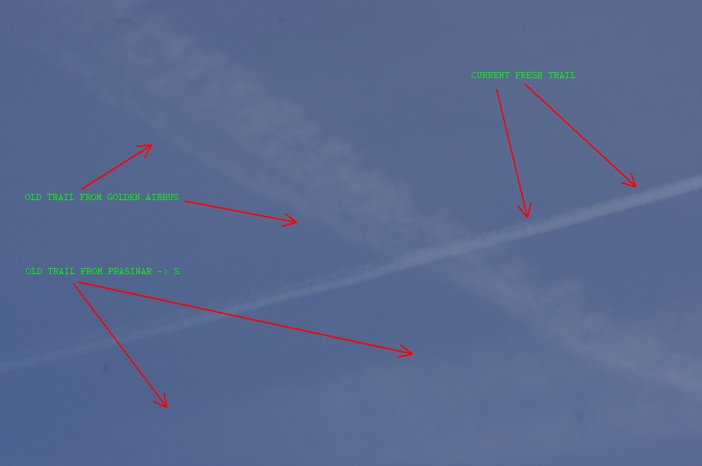 Smjer E->W. Vrijeme 18.33h. Odmah iza Talijanca, ide i ovaj prašinar. Mislim da je AirBus u pitanju, a prišio sam mu nadimak zlatno-guzi radi čudnih boja na trupu. Iskreno rečeno, prvi put ga vidim na nebu. Ide PARALELNO s tragom od prethodna dva aviona, dapače ide istom visinom i točno između tragova koje su ostavili njegovi prethodnici, tako tvoreći savršen prekrivač kemikalija.