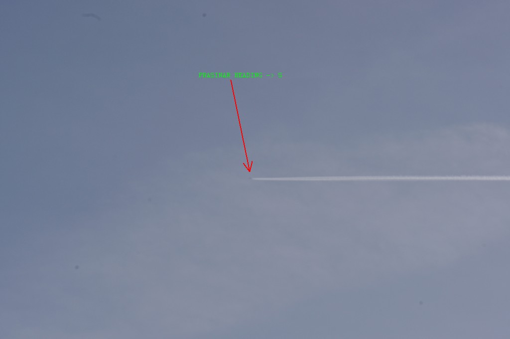 Smjer E->W. Vrijeme 18.55h. Stari poznanik. Odmah pravi križ na početku putanje s malo starijim tragom. Nastavlja prema zapadu i hvata starije kemijske tragove te opet pravi križeve. Mislim da ih je napravio tri sve skupa, bar s onim tragovima koje se naziru.