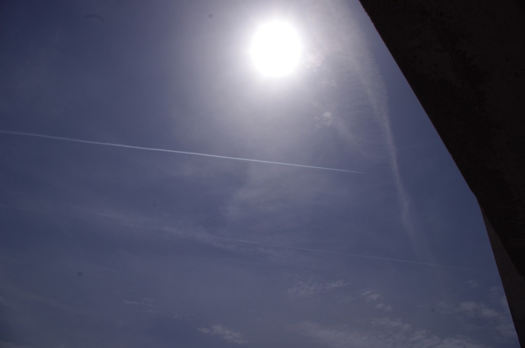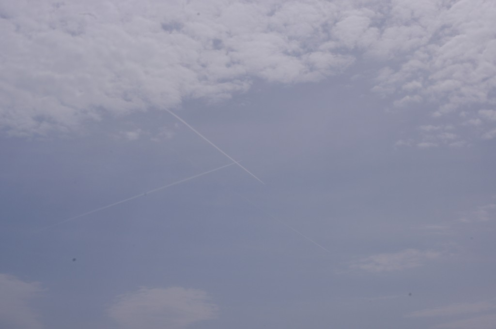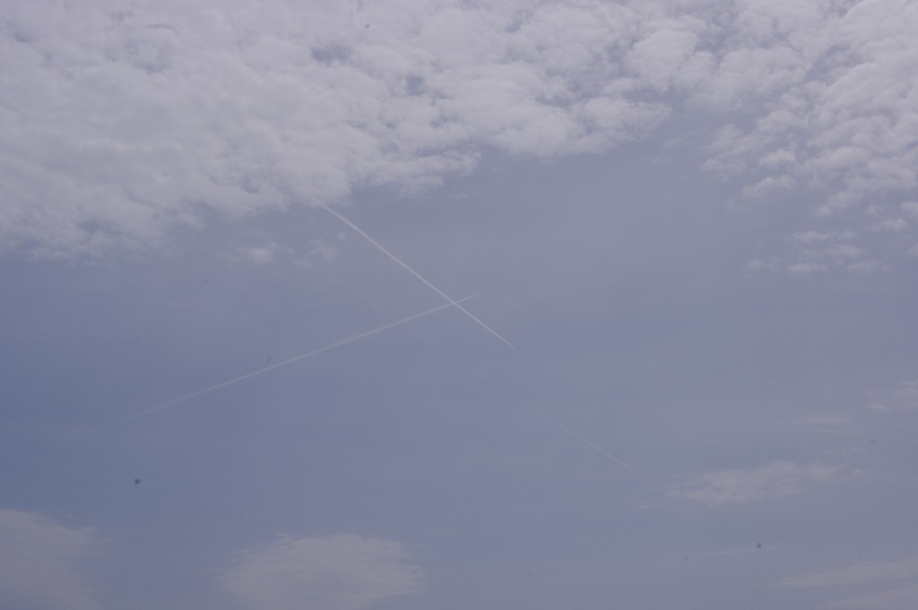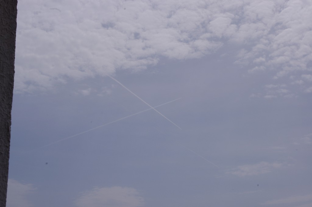 Prve tri slike su oko 6.30 ujutro snimane. Kao što se vidi zaprašivači rano počinju svoje ture, dapače, pitanje jeli uopće staju preko noći. Ostale snimke su nastale negdje oko 9-10sati, a zadnjih 8 oko 14-15h.Čak i u ovih par navrata što sam bezveze slikao nebo s kamerom, uhvatio sam stvaranje križa, probijanje procijepa po umjetnim oblacima (dark beam), te linijsko zaprašivanje ispod sunca koje zaprašivaćima očigledno najviše smeta.
