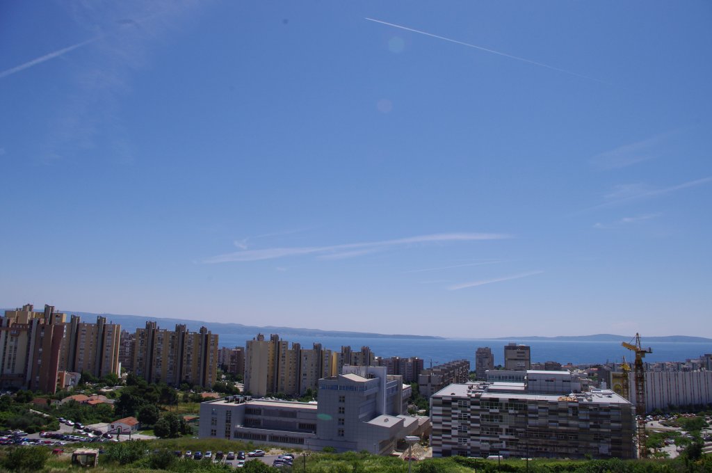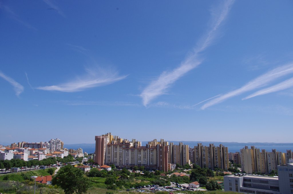 Smjer: W->E. Vrijeme: 17.30h. Evo prvi od dva bio-kemijska zaprašivaća. Na slikama se jasno uočava trag iz repa aviona. Međutim, detaljnijom analizom uočavam da trag ne ide iz samog vrha repa već s desne strane blizu repa. Ovo može biti optička varka, ali moguće je da osim APU ispuha, postoji joše neki otvor kroz koji se ispuštaju otrovi. Podsjećam: trag iz repa aviona ne bi smio postojati jer APU jedinica (rezervni generator) ne radi za vrijeme leta (osim u slučajevima nužde). Kako god bilo, ovo je 100% dokaz da avion ispušta sumnjive materijale, a trag iz motora neću ni spominjati jer se na prvoj slici jasno vidi kako ostavlja dugi i perzistentni trag kada se našao među oblacima. Kad je došao iznad grada, onda se prebacio na kratki kemijski trag, ali je zato upalio bio-kemijski ispuh na repu aviona. Očigledno da je stanovnike grada Splita potrebno dobro posprejati 'lijekovima', pesticidima, otrovima, parazitima i ko zna čime sve ne, da se ne bi previše bunili nego samo: posao, kuća, posao, kuća, posao, kuća...