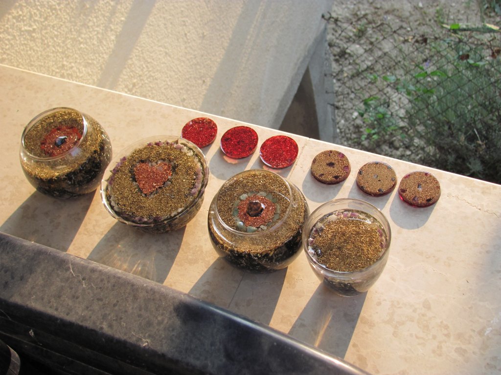 Nabavio sam fine staklene vazice i špice citrina i dao sam si truda da napravim tri HHG, jedan TB i da umijesim 6 epoksidnih botunčića. Ovaj put sam koristio silikonski kalup za epoksidne botune. A šečerne orgonite sam fino premazao epoksidom i moram priznati da je ovo najbolji premaz za šečerne orgonite koji im jamči dugovječnost, a i estetski su lijepi. Nažalost botuni su preveliki za mobitele, ali ja sam ipak jednog nalijepio na svoj, nije me briga, a druge botune sam raspodijelio po ruterima, televizijama, računalima, monitorima (zalijepio ih s dvostranom ljepljivom trakom).