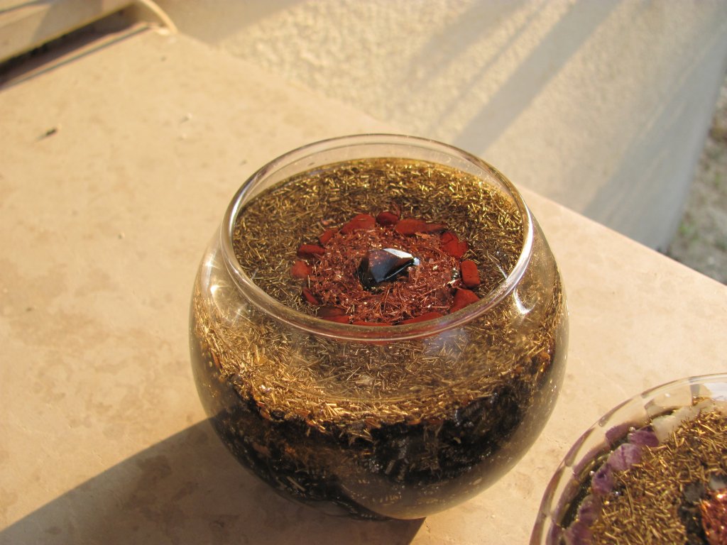 - Prvi HHG: citrin špica s ogromnim crvenim jaspisom u pozadini, optočen s malim jaspisima, gore je mesing i bakar piljevina, a dole svega pomalo, s dodatkom aromatske mješavine, korijandera, koromača, anisa, mente, nevena i ko zna čega sve ne (ovi dodaci su i u ostalim primjercima).