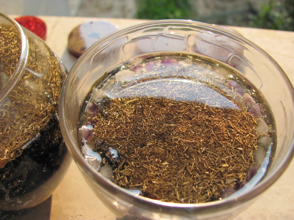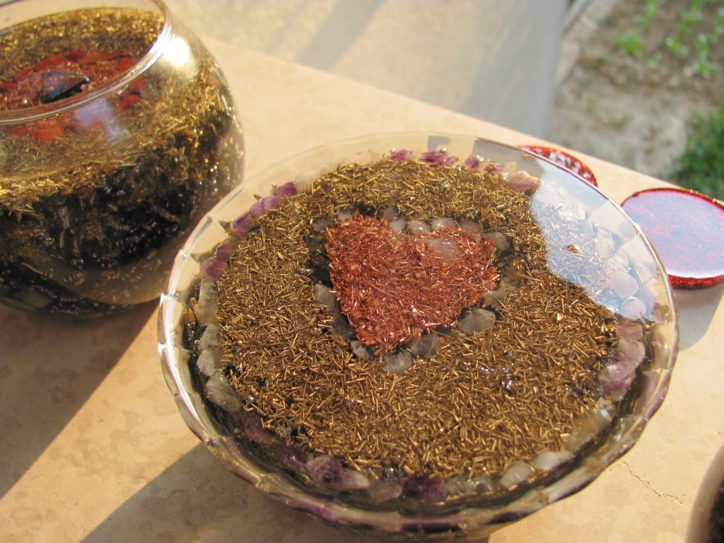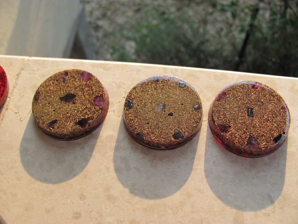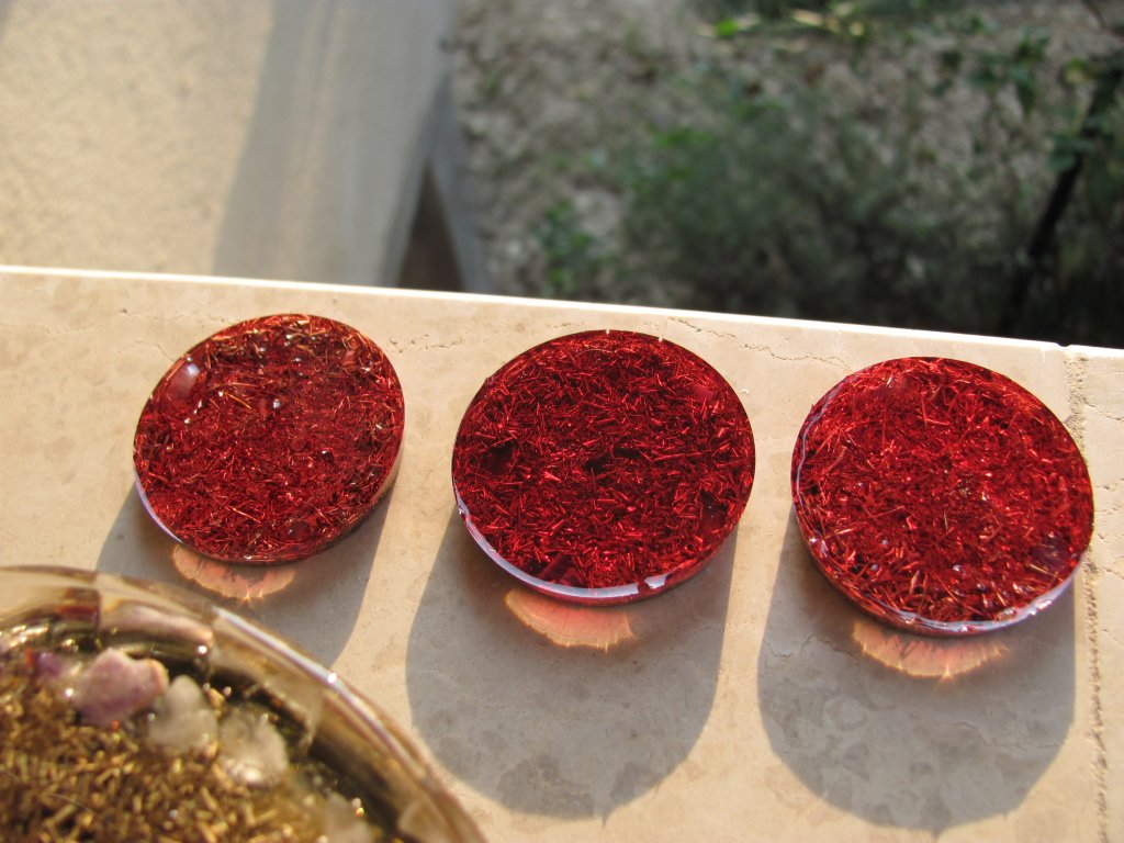 Ovdje sam prvi put iskoristio i prehrambenu boju za bojanje orgonita (crvena za crvene botune). Jednostavno se u epoksidnu mješavinu prije mješanja stavi par kapi tekuće prehrambene boje i nakon miješanja epoksidna smola fino poprimi tu boju. Epoksidna smola je zahvalna jer dobro 'prima' ove prehrambene boje, međutim poliesterske smole se teško bojaju s prehrambenim bojama, ali ima par trikova: