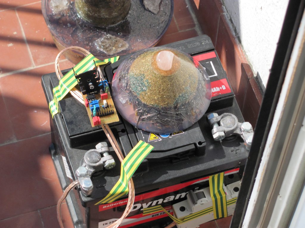 E sada ide konačni 'deploy' novih orgonitnih prinova. Naime, na alternativa forumu sam uočio da ljudi koji se intezivno bave orgonitima i imaju po kući dosta broadcastera ili orgonita s Mobius coilom da te uređaje rijetko pale i spajaju na zapper. S druge strane sam uočio da mobitelski tornjevi i ostali emiteri DOR-a rade 24/7, stoga je moja namjera bila očita: napraviti sustav koji će raditi 24/7. U tu svrhu sam iskoristio jedan akumulator, sklepao zapper i spojio orognit na nj. Međutim, kasnije sam akumulator zamijenio mnogo praktičnijm rješenjem u obliku adaptera.