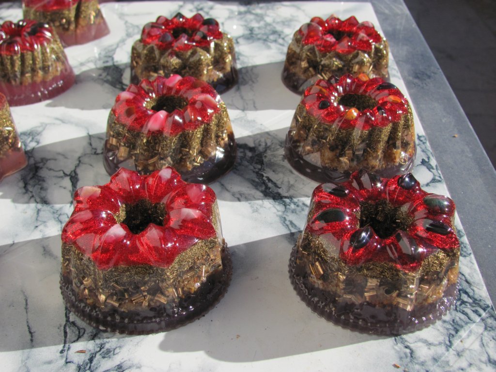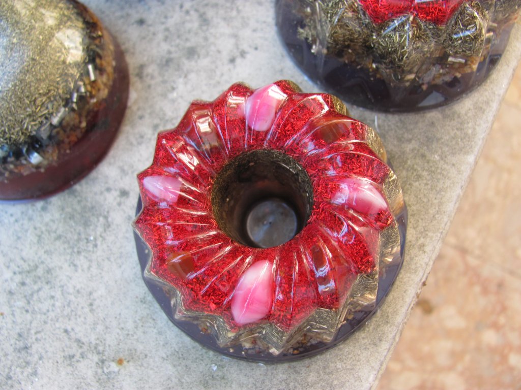 Opet sam pokrenuo sve proizvodne kapacitete i uposlio svih 5 kalupa za TB-ove, te četiri koktel čaše za HHG-ove. Crveni TB-ovi su napravljeni s glazurom od epoksida. Dan prije sam u kalupe ulio tanak sloj epoksidne smole i fino razmjestio kristalčiće, kako je epoksid fino proziran svi kristalići se lijepo vide. Crni TB-ovi su napravljeni od gize u prahu, a inače svi sadržavaju i mesing prah te krupniji metal uz dodatak raznih kristala.