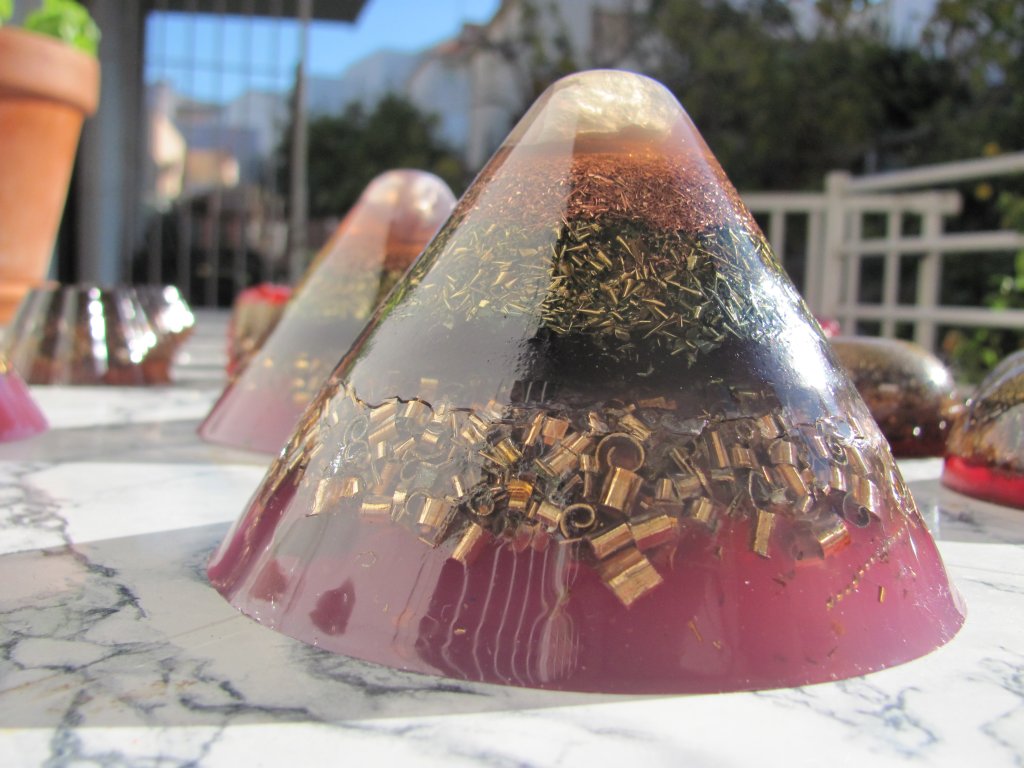 Posebnu pažnju sam posvetio izradi HHG-ova koje sam izradio u više slojeva: prvi sloj je samo kristal i smola. Drugi sloj je bakar i mesing prah ili prah od gize i zatim sam namjerno ostavio 'bufer' zonu čiste smole od 1 cm i utaknuo špice gorskog kristala s zalijepljenim posrebrenim botunima koji daju posebnu vibru srebra energetskom outputu orgona. Drugi dan sam nalio završni sloj s krupnim metalom koji je tako završio na dno HHG-a (kad se okrene) zajedno s obaveznim SSB zavojnicama koje usmjeravaju tok orgona put gore i horizontalno. Ako se želi dobiti čista i fina granica između slojeva metala u HHG onda se mora raditi postupno, odnosno naliti sloj po sloj, čekati da se osuši i stvrdne pa dalje, zato ovo može biti dosta naporno, naročito zimi kad poliesterskoj smoli treba i par sati da se stvrdne. Mislim da sam ove HHG-ove napravio u dva dana.