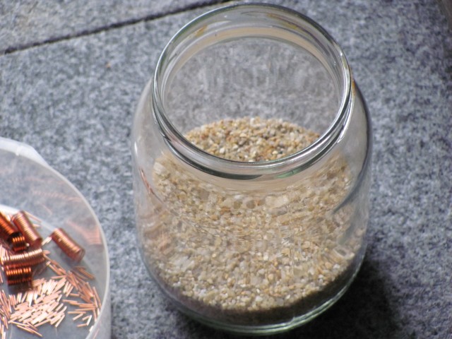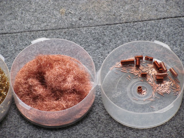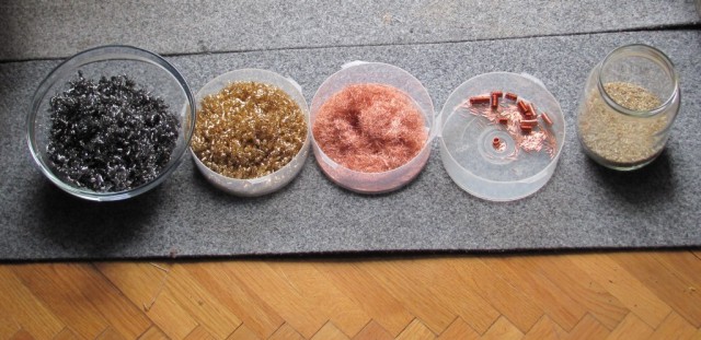Metal: metalne spužvice za kuhinju (bilo koji dućan) sam škarama usitinio koliko sam mogao. Ovdje treba biti oprezan i staviti odmah flastere na prste kako bi se izbjegla pojava žuljeva. Usitinio sam i bakrenu žicu iz kabele za zvučnike (Chipoteka). Od bakrene lak žice za namatanje motora sam napravio male zavojnice, jer navodno ove pomažu prilikom usmjeravanja energije. (prvih pet slika). Ubrzo sam počeo koristiti i čeličnu vunu (najgrublja) koju sam sitno isjeckao. Čelična vuna je dosta gusta i služi umjesto sitnog metala. A za krupni metal sam koristio i obične čavle. I dan danas koristim ovu kombinaciju za šečeraše. Naime zlatno pravilo za orgonite je da imaju malo sitnije 'špene' ili sitnog metala (pri vrhu), a krupnog metala na dnu, s tim da u omjeru može biti više krupnog metala. Ovaj kombinacija metala najbolje funkcionira u privlačenju i odbijanju orgonske energije.