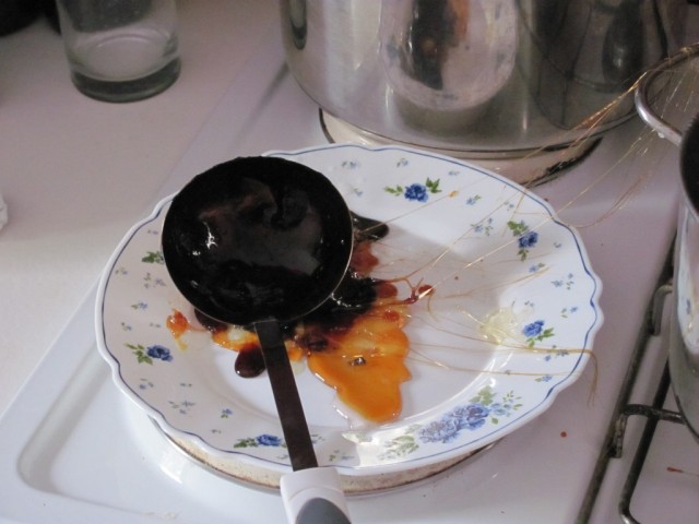 - Karamel smjesa je gotova kad poprimi tamnu jantarnu boju. Za provjeru izvadite drvenom kašikom/ kutlačom malo na običan tanjur i ako se smjesa relativno brzo stvrdne onda je to to.