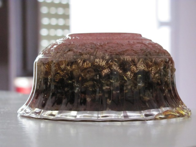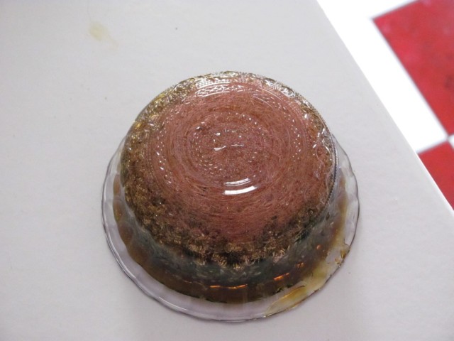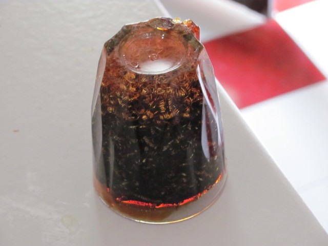 - Kad je smjesa gotova, ugasite kuhalo ili ga stavite na minimum, izvadite čaše/kalupe i lagano uljite prvi sloj karamela u svaku i tako radite serijski nad svim kalupima. Nemojte raditi jedan po jedan orgonit, već miješajte sloj po sloj karamela, sloj metala i kristala u svim orgontima. Ovo je vrlo bitno da se stavlja sloj po sloj, jer karamel nije 'tečan' kao poliesterska smola, pa često ne popuni dobro rupe između metala, stoga se uvijek radi sloj po sloj (1-2cm debljine). Pošto se karamel brzo stvrdnjava treba biti brz stoga ja nikad ne gasim kuhalo, već ga ostavim na minimalnoj vatri, ali zato smjesa lagano isparava, zato opet treba biti brz, ali ako se kvalitetno pripremi i ako su svi sastojci na dohvat ruke onda to ide relativno brzo. Pošto mi se uvijek između kalupa/čaša u koje ulivam prolije i sam karamel te mi stvori nered, kojega je teže čistiti, najbolje je kao podlogu koristiti karton i salvete naviše kartona, pa salvete bacite i očistite karton pa ga spremite za idući put, a radni stol i kuhalo budu relativno čisti. Pazite na opekotine kad rukujete s karamelom...