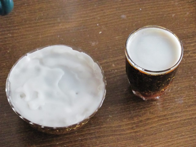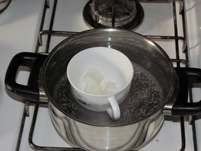 - Smiješati smjesu od 4 šolje šećera (nekih 400gr) (bijeli, rafinirani), 2 šolje vode (200gr) (po mogućnosti destilirane i informirane) i 45 ml bijelog octa te ostaviti preko noći da se šečer dobro rastopi (recept ovdje). Ja sam dosta eksperimentirao s ovom smjesom i došao do zaključka da flitrirana, energizirana i solarna voda nikako ne idu u karamel, jer se šečer iz nekog razloga nikako ne želi karamelizirati, stoga uvijek koristim običnu vodu s špine (gradsku). Nadalje 400gr+200gr je vrlo mala smjesa je otprilike 1/4 ili 1/3 ispari tijekom kuhanja karamela, stoga danas koristim omjer: 600gr obične vode, 1200gr šečera i 60ml bijelog octa i potrebno mi je oko jedan sat kuhanja na plinu, na najjačoj vatri da se smjesa karamelizira.