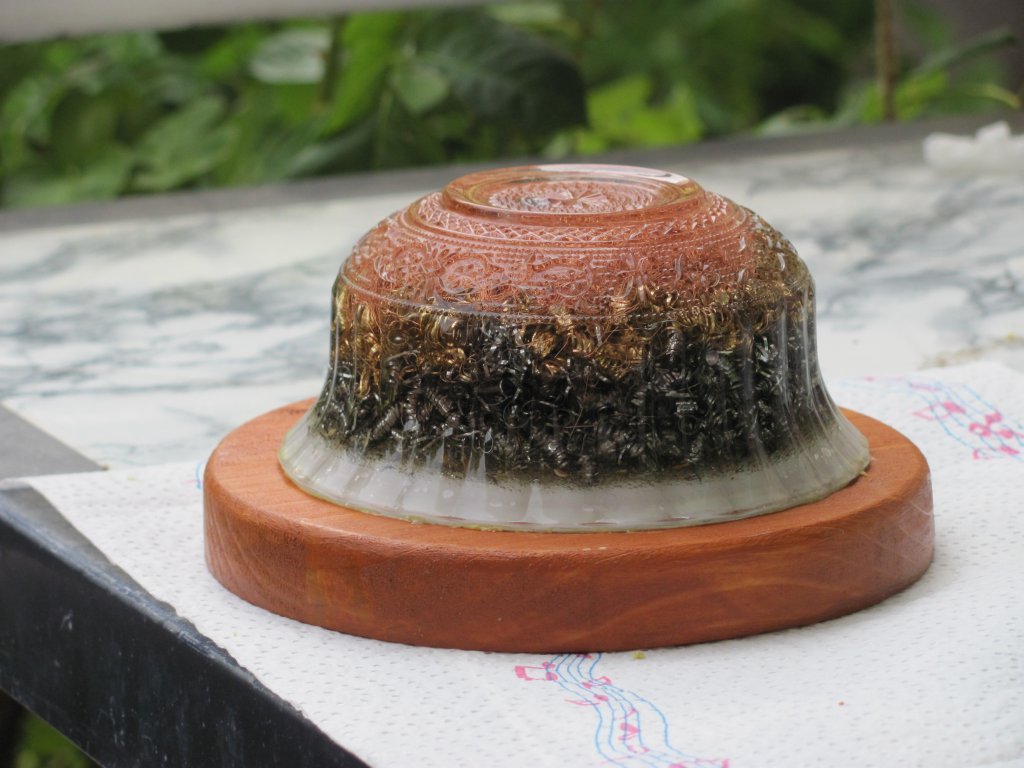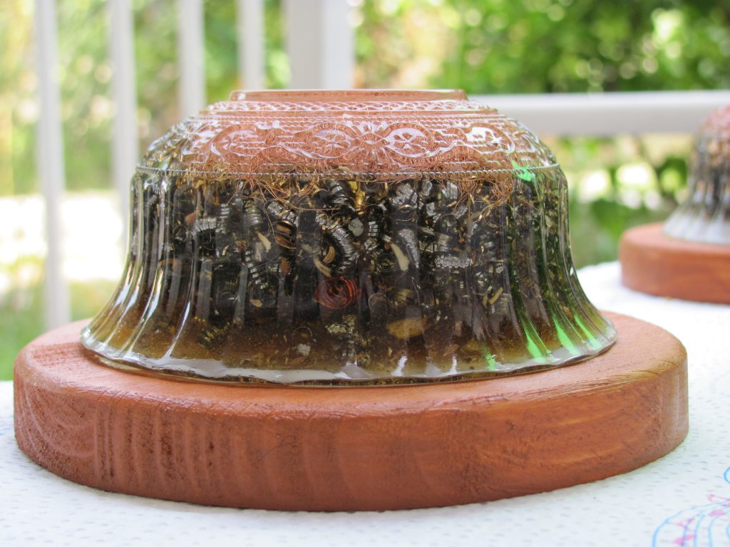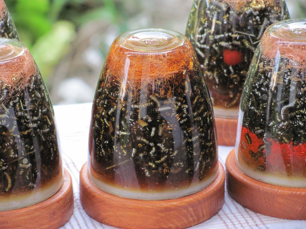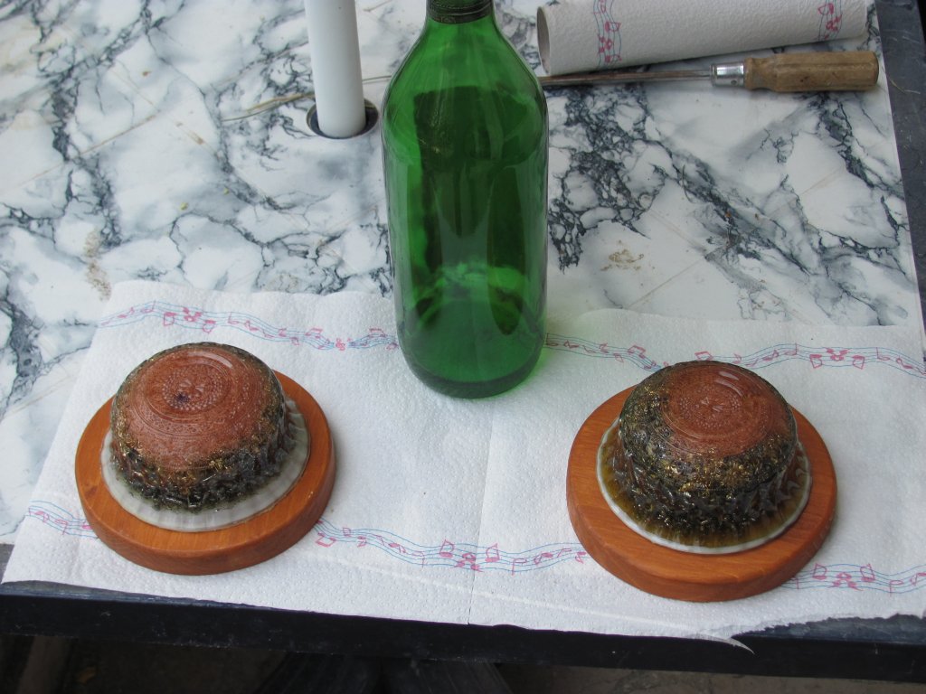Napokon sam dobio špice gorskog kristala pa sam se upustio u izradu i prvih Holy Hand Grenada ili HHG orgonita. Pošto sam vidio da nikako ne mogu spriječiti curenje šečera dao sam si extra truda i s ubodnom pilom iz komada drva, napravio krugove, male drvene stakle koje sam obojao s nekim lakom, te na stalke zalijepio voskom začepljene orgonite. Moram priznati da je ova kombinacija odlična za ukrasne orgonite za u kuće, ali treba dosta truda i posla za sastaviti jedan komad, danas to više ne radim, stoga su ovo moji rijetki unikatni primjerci.