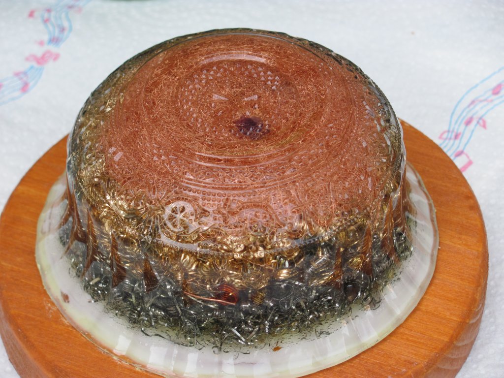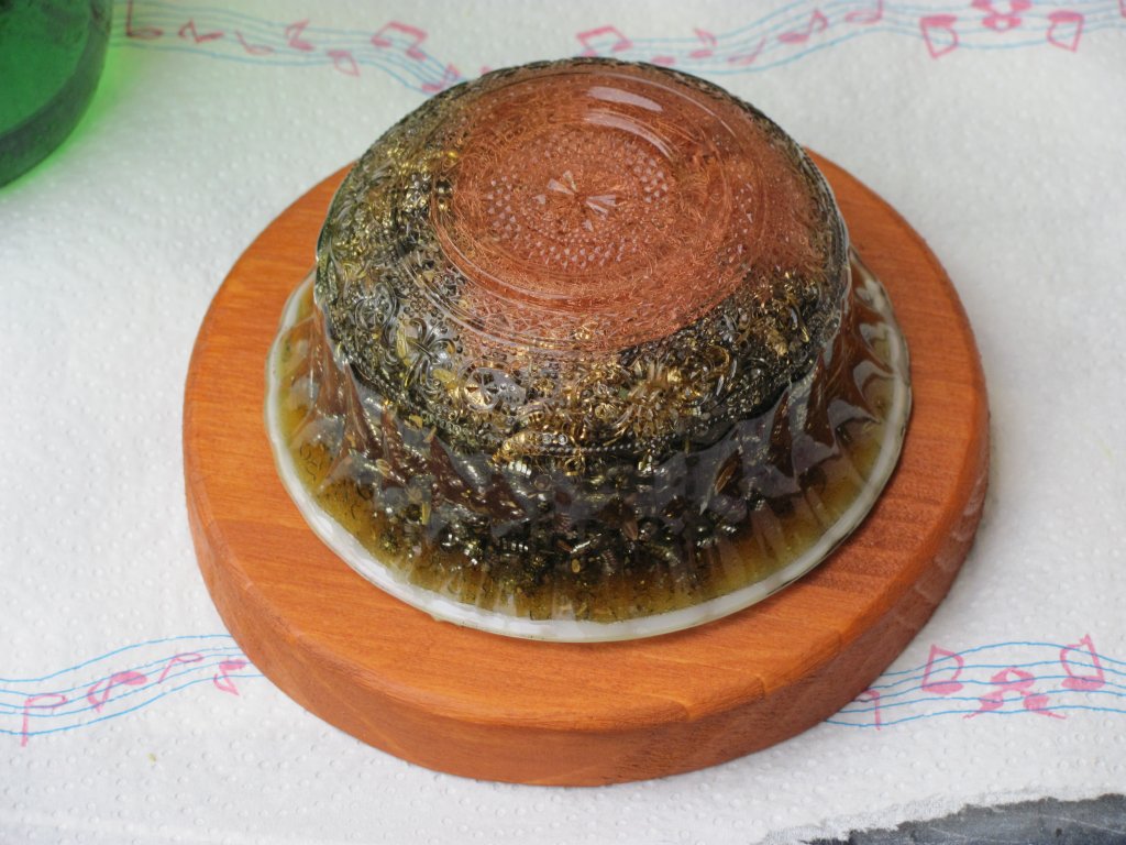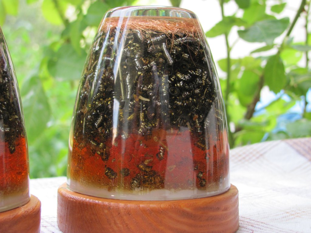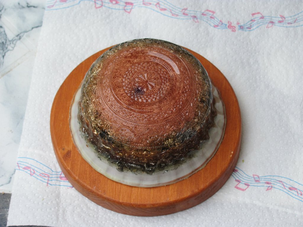 Napokon sam dobio špice gorskog kristala pa sam se upustio u izradu i prvih Holy Hand Grenada ili HHG orgonita. Pošto sam vidio da nikako ne mogu spriječiti curenje šečera dao sam si extra truda i s ubodnom pilom iz komada drva, napravio krugove, male drvene stakle koje sam obojao s nekim lakom, te na stalke zalijepio voskom začepljene orgonite. Moram priznati da je ova kombinacija odlična za ukrasne orgonite za u kuće, ali treba dosta truda i posla za sastaviti jedan komad, danas to više ne radim, stoga su ovo moji rijetki unikatni primjerci.