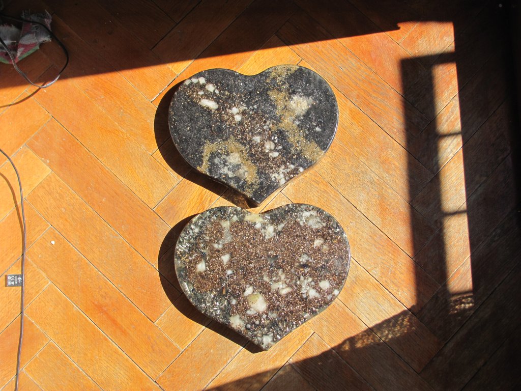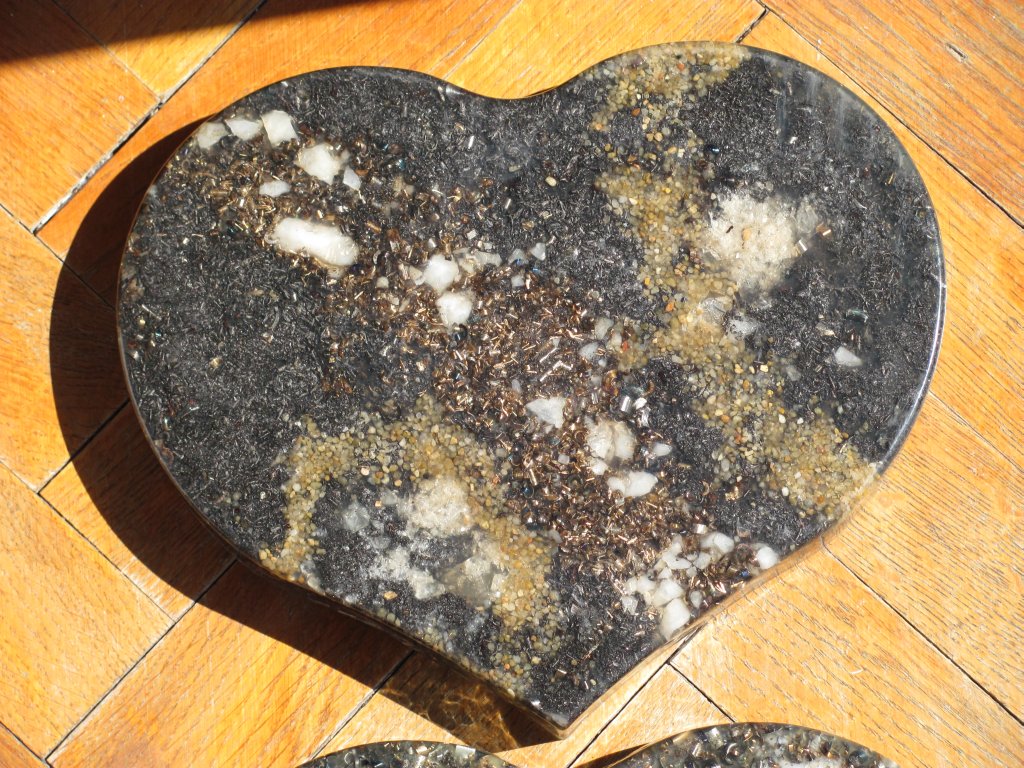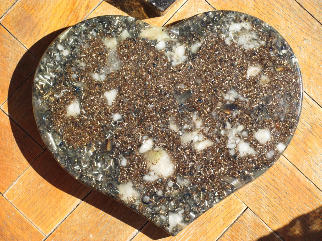 Malo su mi dosadili moji šečeraši, ali nikako da se odlučim na udisanje isparavanja plastičnih smola i počnem praviti 'plastične' orgonite, pa sam kupio gotove orgonitne podloške od plastične smole u obliku srca. Osim tri srca dobio sam i tri TB-a i tri mala botuna za mobitel ili ruter. Večinu sam razdiijelio, a jedno sam srce zadržao za sebe. I to jedno srce još i danas koristim za orgoniziranje vode. Četvrta slika prikazuje kako orgoniziram destiliranu vodu za koloidno srebro s srcem.