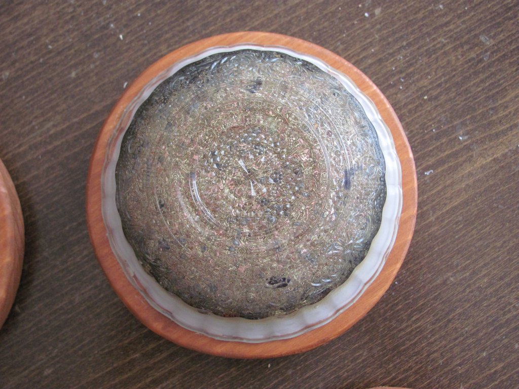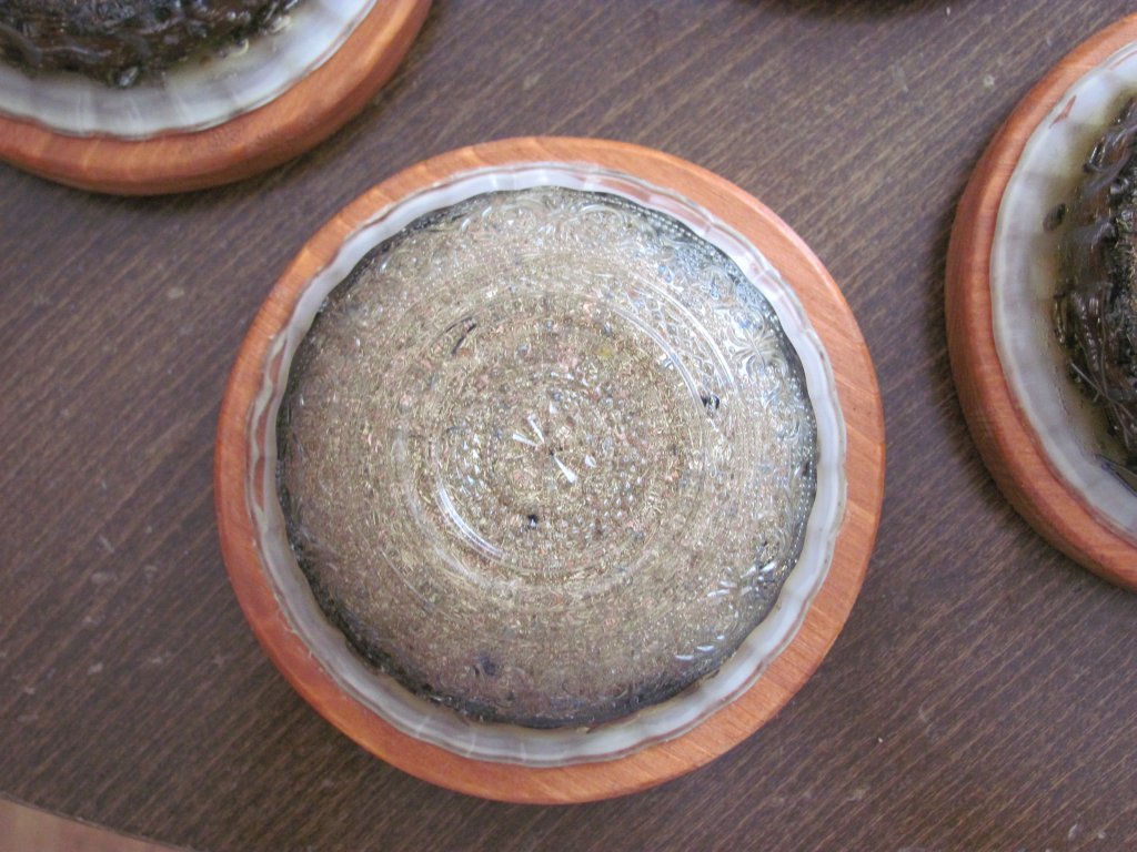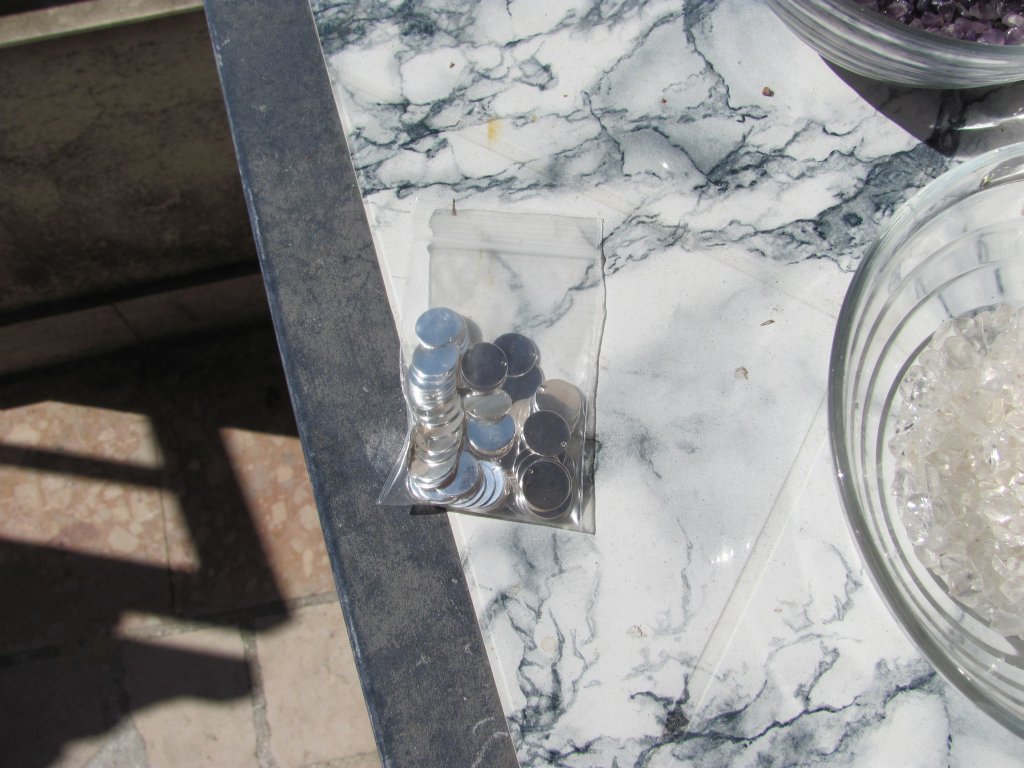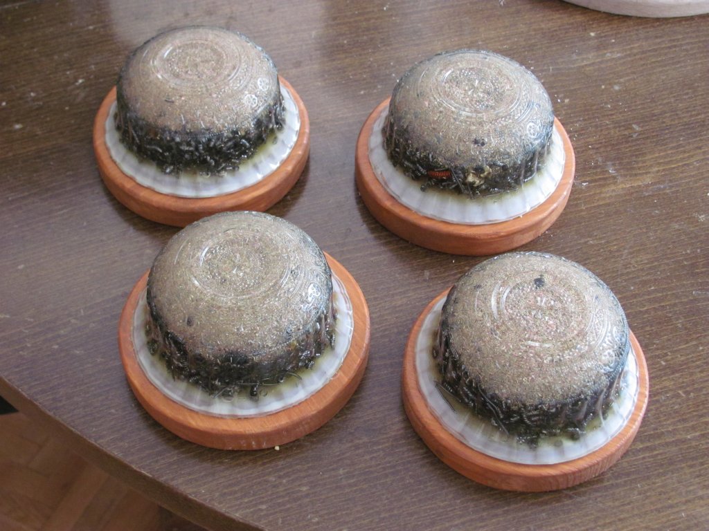 Nova četiri šečerna HHG. Srebro i zlato daju posebno kvalitetnu energiju orgonitima. Međutim pošto su skupi dovoljno je koristiti i posrebrene ili pozlaćene metalne dijelove. Ja sam nabavio posrebrene mesing botune za nakit što je po meni najbolja kombinacija. Ove botune bi trebalo staviti u centar HHG (ispod ili iznad špice kristala) gdje je fokus energije najjači ili ih pak zalijepiti za sam kristal.