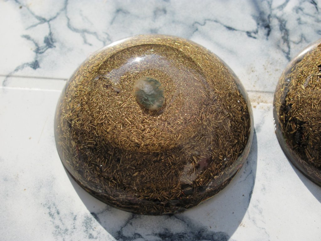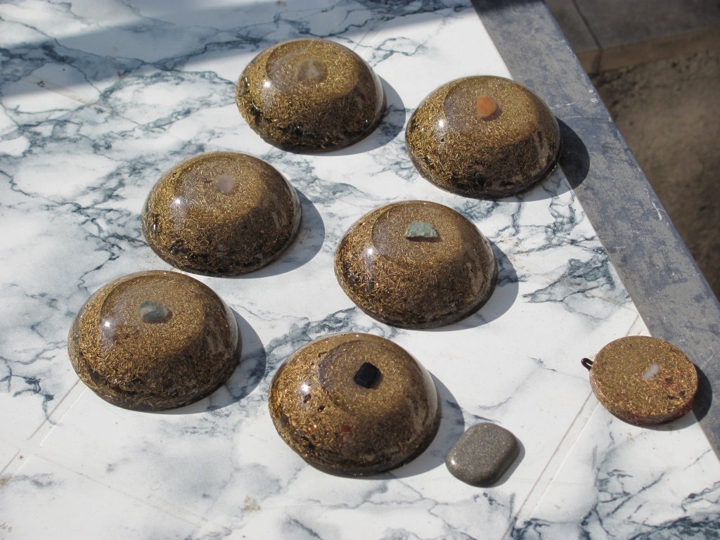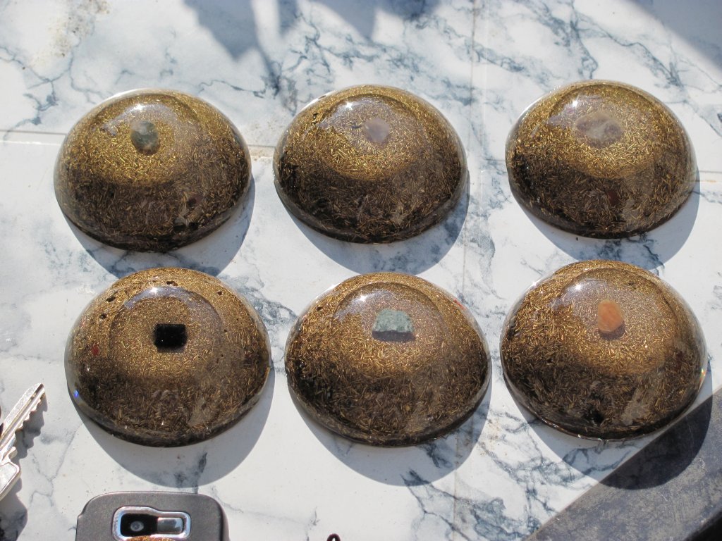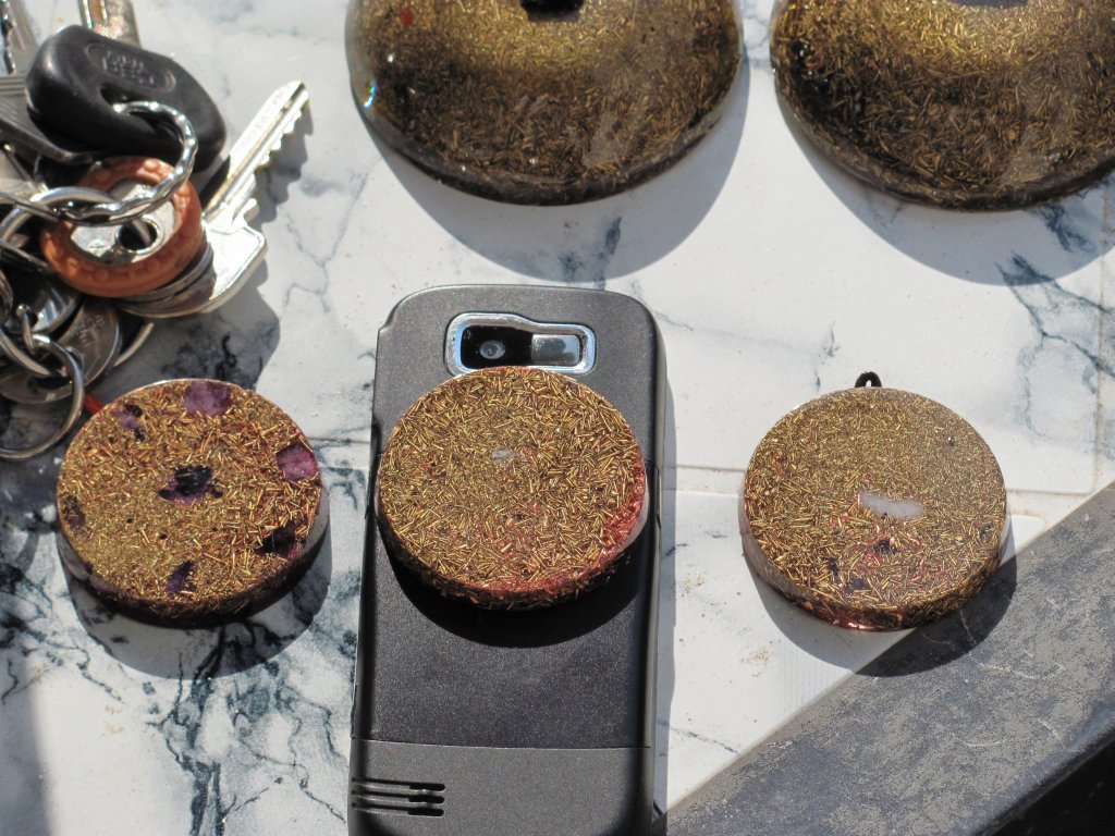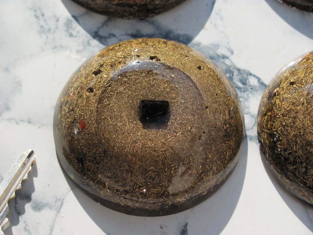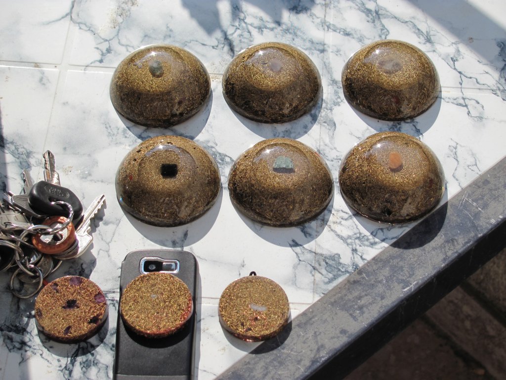Napomena: medaljoni s kristalom na vrhu se rade iz dva puta: prvi dan se stavi samo malo smole i kristal. Drugi dan kad se stvrdne ovaj dio, nastavlja se izradom ostatka orgonita. Ovdje sam opet pogriješio jer skoro svaki orgonit ima male rupice od mjehurića zraka, znači uvijek se prvo treba naliti tanak sloj smole, a zatim stavljati metal i kristal, nikako ne obrnuto, ako se žele izbjeći ove male rupice, jer bez obzira na utiskivanje i miješanje smjese, uvijek ostanu neki džepovi.