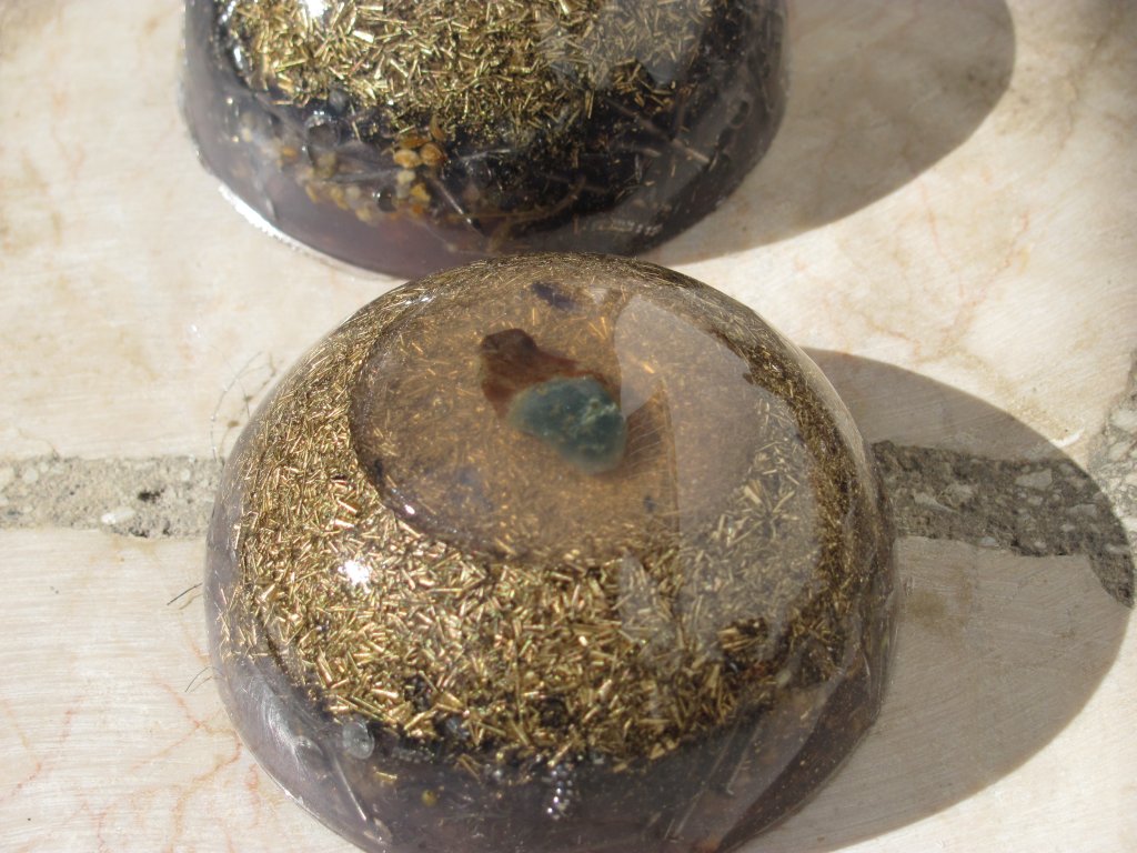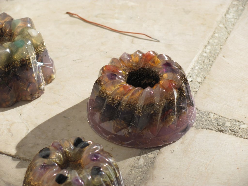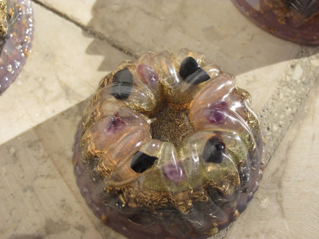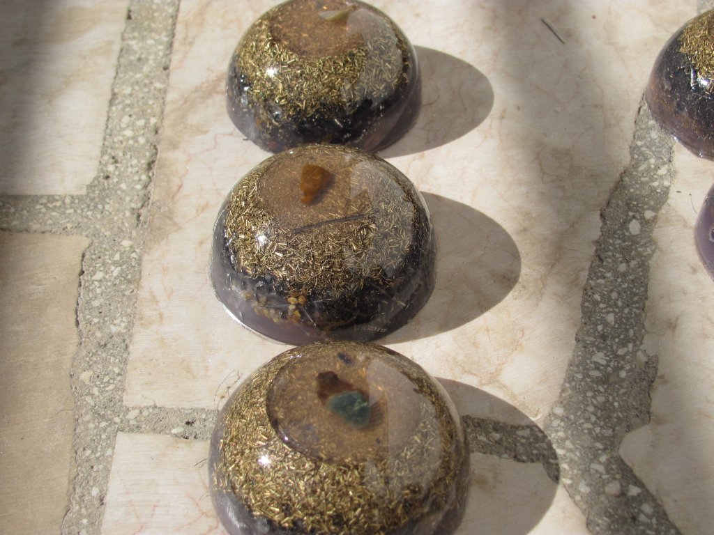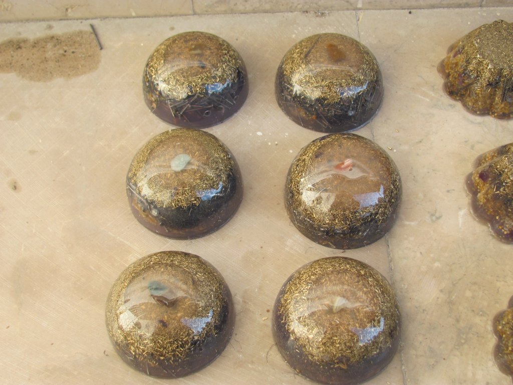 Neveni su zasjali na suncu, a meni je sinula ideja da stavim latice u TowerBustere i da ih tako malo uljepšam. U 12 TB-ova sam stavio sam latice nevena, kadulje i ostalih cvjetova s kristalićima na vrhu. Međutim, usljed topline koja se stvara kad smola stvrdnjava, izgubila se boja latica, a poliesterska smola se inače dosta zamuti i nije tako prozirna kao epoksidna, tako da nije ispalo baš naj naj, ali svakako bolje nego 'obični' TB. Ovih 12 sam namijenio za po kući, međutim, danas kad gledam, ostalo mi je 6 komada što hoće reći da sam ih pola dao. Inače skoro 80%, ako ne i više orgonita dajem rodbini, prijateljima, susjedima, tako da i na taj način 'giftam' okolinu.