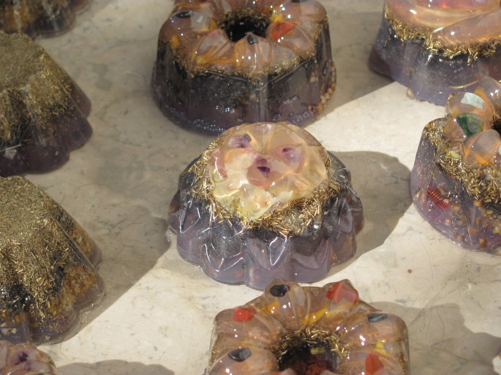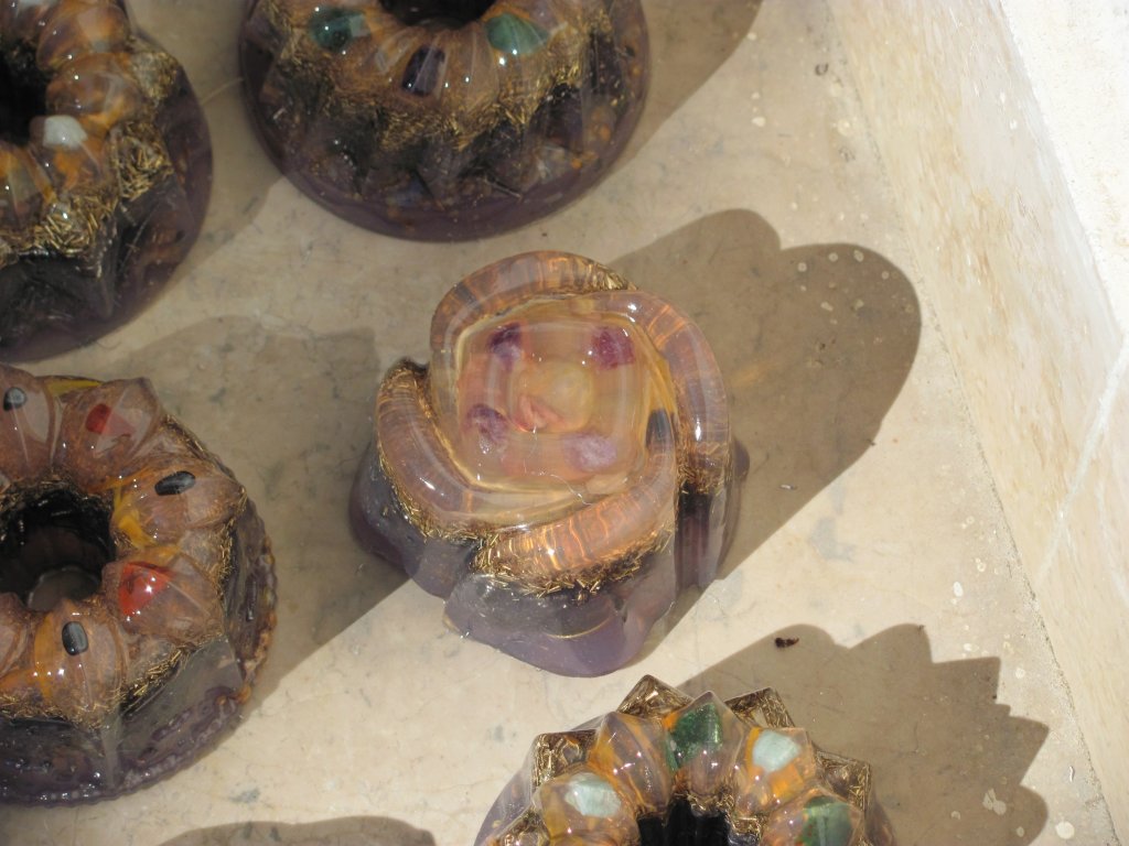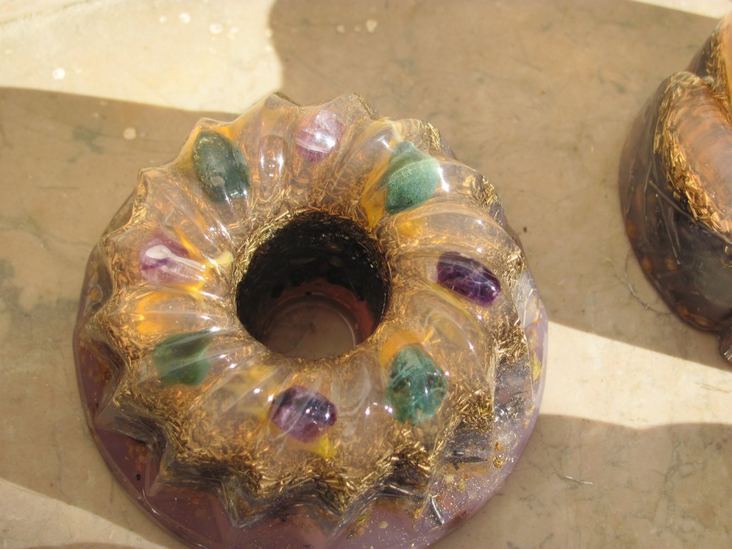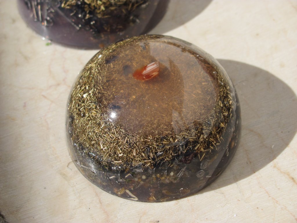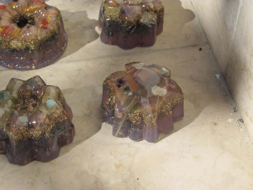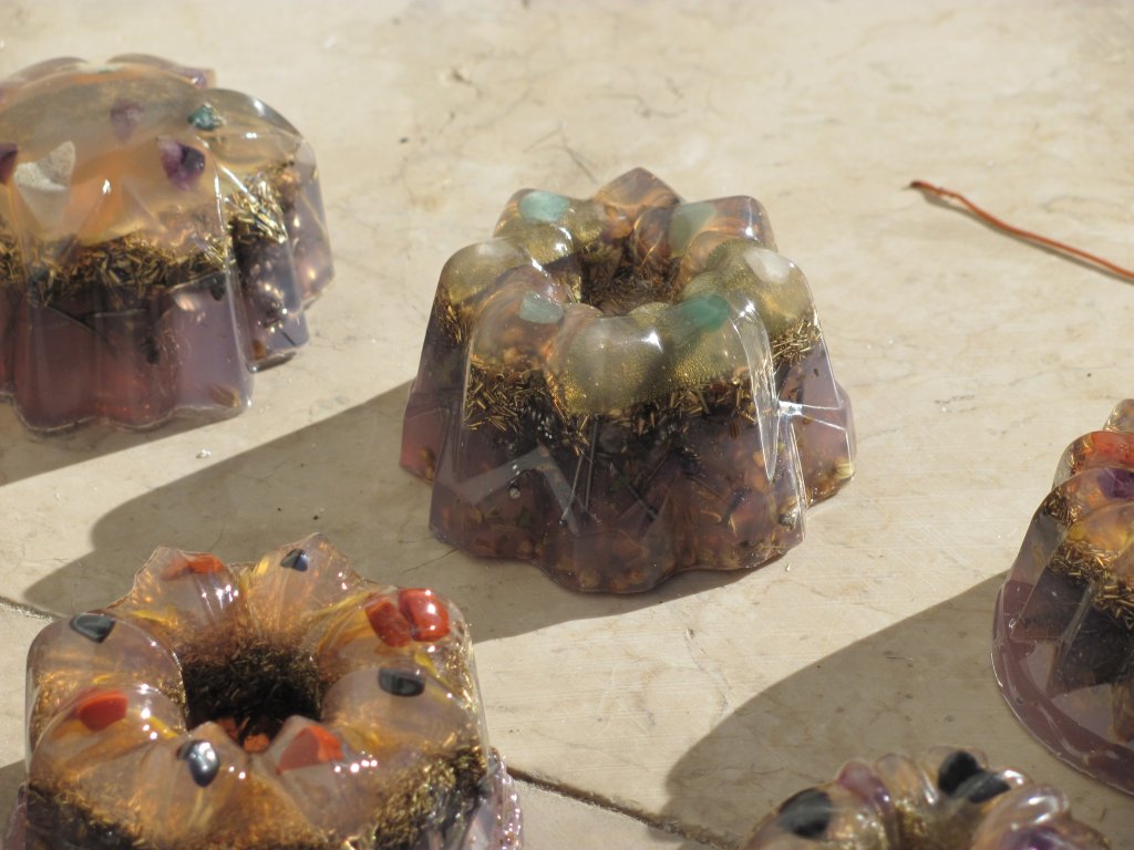 Neveni su zasjali na suncu, a meni je sinula ideja da stavim latice u TowerBustere i da ih tako malo uljepšam. U 12 TB-ova sam stavio sam latice nevena, kadulje i ostalih cvjetova s kristalićima na vrhu. Međutim, usljed topline koja se stvara kad smola stvrdnjava, izgubila se boja latica, a poliesterska smola se inače dosta zamuti i nije tako prozirna kao epoksidna, tako da nije ispalo baš naj naj, ali svakako bolje nego 'obični' TB. Ovih 12 sam namijenio za po kući, međutim, danas kad gledam, ostalo mi je 6 komada što hoće reći da sam ih pola dao. Inače skoro 80%, ako ne i više orgonita dajem rodbini, prijateljima, susjedima, tako da i na taj način 'giftam' okolinu.