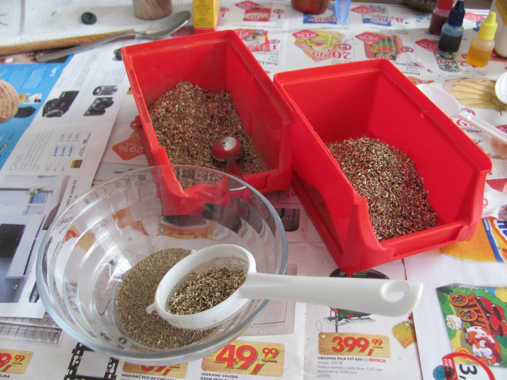 Inače za mobitelske botune sam koristio ultra sitnu piljevinu od mesinga koju sam dobio filtriranjem normalne piljevine s običnom cjedaljkom za čaj. A inače u svaki mali orgonitić stavljam i mješavinu ljekovitih biljaka,a za ovako male orgonite ih dodatno sameljem, tako da mi pružaju i ezoterične mirise dok radim.