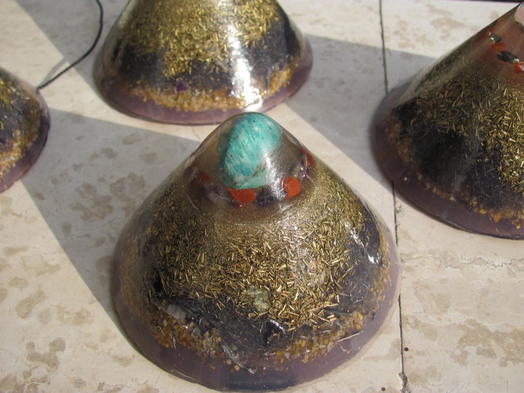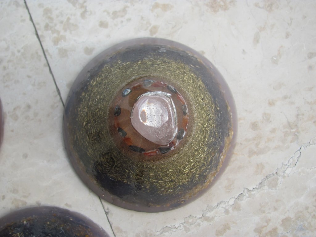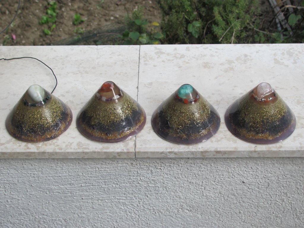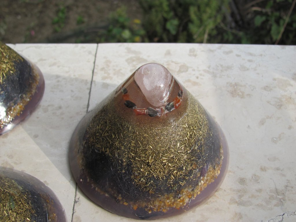 Skuhao sam nova četiri poliesterska HHG-a. Zanio sam se s epoksidnom smolom i s njom sam napravio vrhove ovih HHG-ova. Normalno epoksid se lijepi kao lud na staklene čaše koje koristim kao kalupe. Na svu sreću, postoji jedan fini trik s 'tvrdoglavim' kalupima koji 'ne puštaju' orgonite vanka: ostave se preko noći u friz i s laganim tuckanjem trebali bi izaći sutradan. Meni je to uspjelo s tri komada, ali četvrti se nije dao i puknuo sam čašu u nastojanju. Orgonit je izašao, čaša je skoro ostala čitava, jer je samo nogica pukla, pa je i dalje mogu koristiti. Savjet: epoksid nikako u staklene kalupe, a ako imate problema s vađenjem orgonita iz kalupa ostavite ga u friz preko noći, imate 90% šansi da bezbolno izađe.