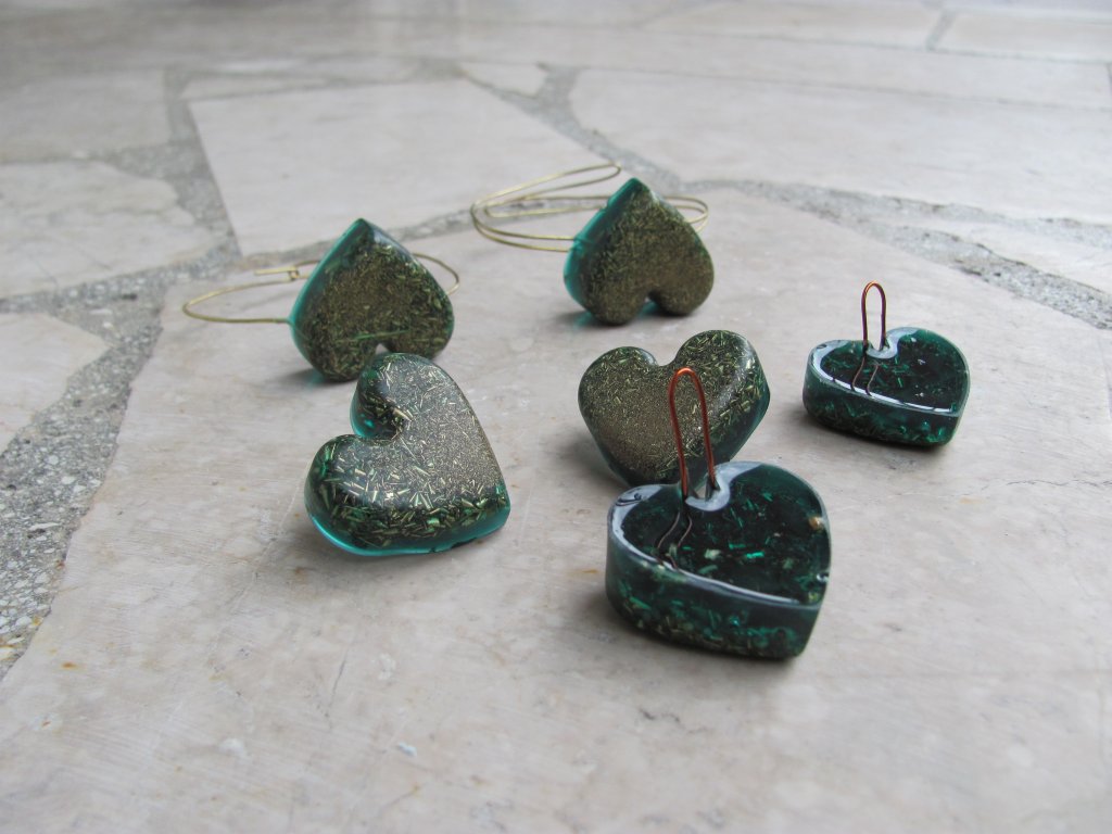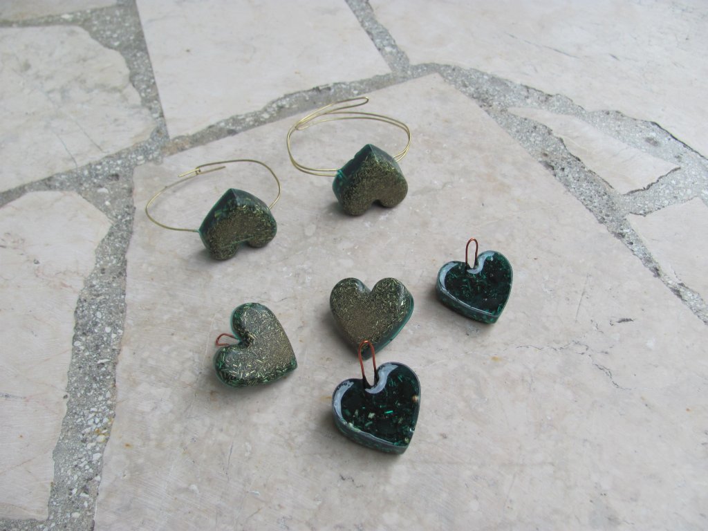 Pa rekoh ajmo to probati, međutim, osim same žice od mesinga htio sam i mali orgonitič, odlučio sam se za malo srce. Koristio sam mesing piljevinu, malo gorskog kristala i samo jedan veći komad hematita. Pošto je orgonit blizu zapešća gdje je koža najtanja i gdje su krvne žile najbliže površini kože ideja je da se i cijela krv lagano orgonizira s ovim malim orgonitom. Nosim ga već par mjeseci, ne mogu reći da sam osjetio ikakvu značajnu promjenu, ali volim ga osjetiti na ruci. Napravio sam dvije vrste narukvice: s duplom i jednostrukom žicom, te još par privjesaka. Sve je od epoksida.