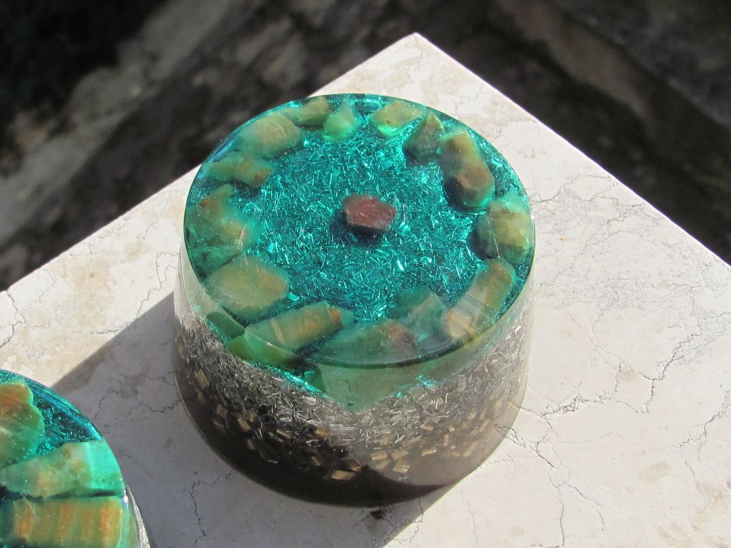 Nakon intezivnog giftanja, vrijeme je bilo malo da se posvetimo 'pecanju' orognita za po kući. Normalno od svih orgonita na slici, ja sam možda zadržao par komada, svi ostali su već nekako našli svog vlasnika, tzv. direct-human-gifting project. Da malo opišem svoje male svjetlonoše: radi se o skoro 40-ak poliesterskih TowerBustera orgonita. Crni su napravljeni od kombinacije gize i aluminija. Zelenkasti i jedan crvendač su napravljeni s kapicom od epoksidne smole (zato su tako fino prozirni). Kristali su razno-razni, ali svi imaju našeg domaćeg kalcita s Čiova koji odiše posebnom snagom. Sjećam se da sam prije tvrdio da svaki orgonit mora imati bar gorski kristal i da ne može imati samo kalcita, ali vrijeme da je promijenim taj stav, naime domaći kalcit ima po meni izrazito snažnu vibru, ipak je to moj zavičajni kamen.
