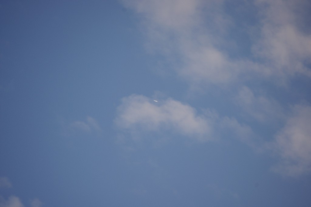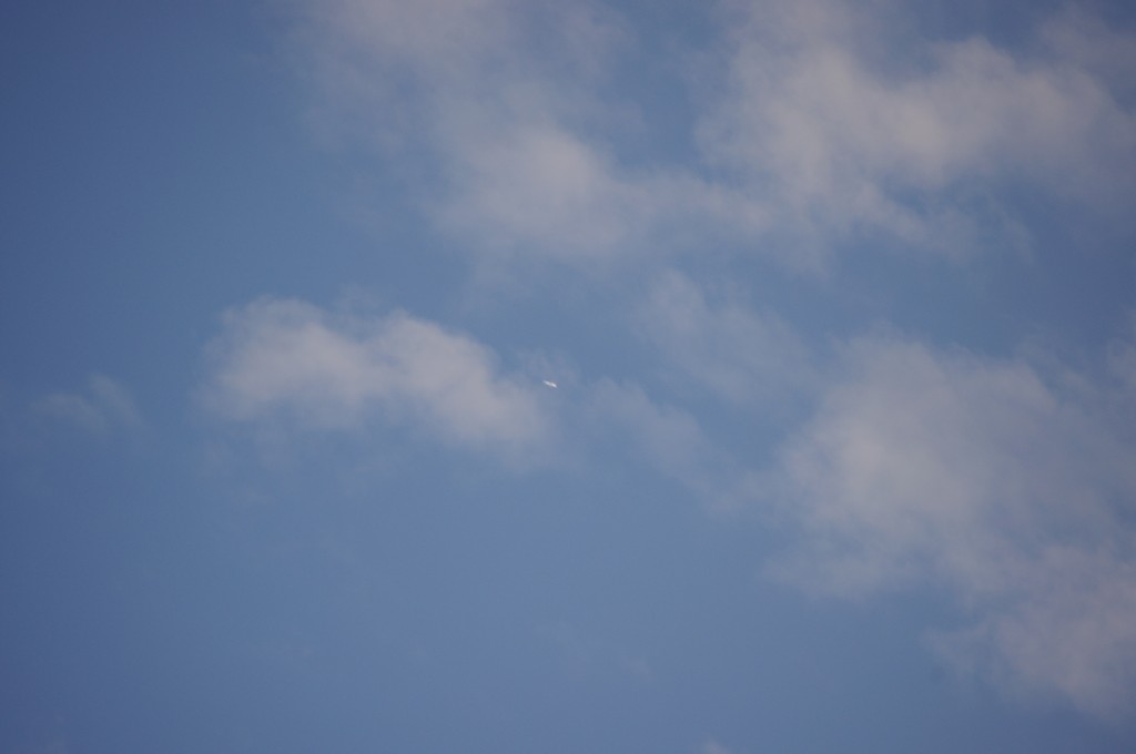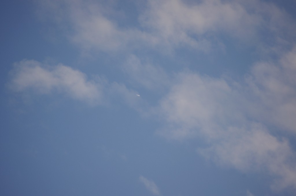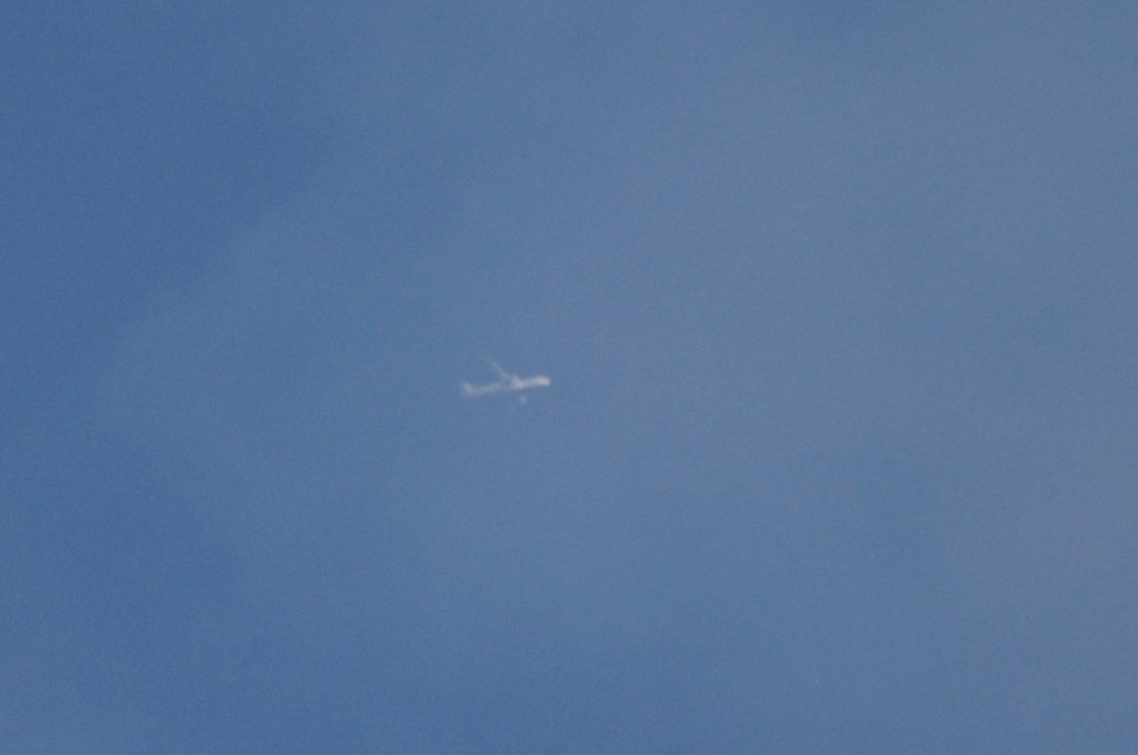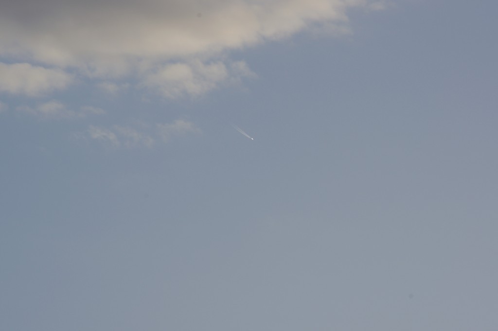 Leti odmah iza ovoga gore po istoj putanji, možda par km razmaka, dok sam još slikao ovoga gore, dođe mi i ovaj na nišan. I ovaj se ponaša isto kao ovaj gore, ali pušta trag dobro sakriven iza oblaka, tako da sam ga uhvatio tek kad je izašao iz oblaka s punim tragovima. Nažalost, opet sam sve slikao izvan fokusa, pa dajem full resize slike da se fino vidi kako ide bez traga, onda paf, praši ko lokomotiva.