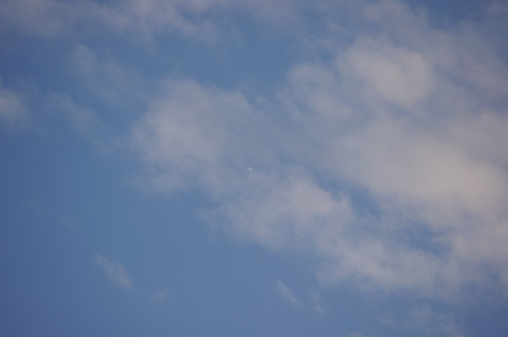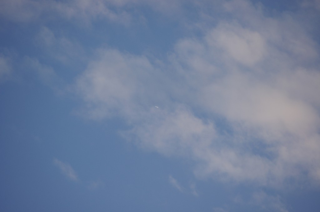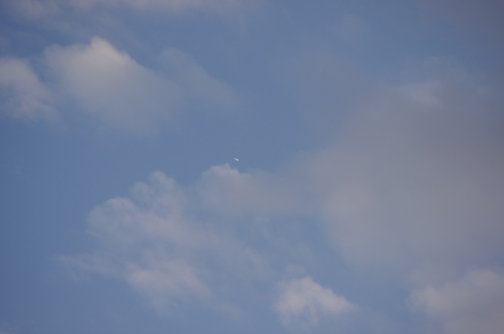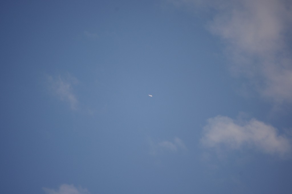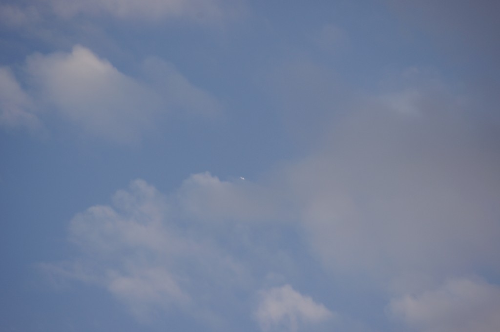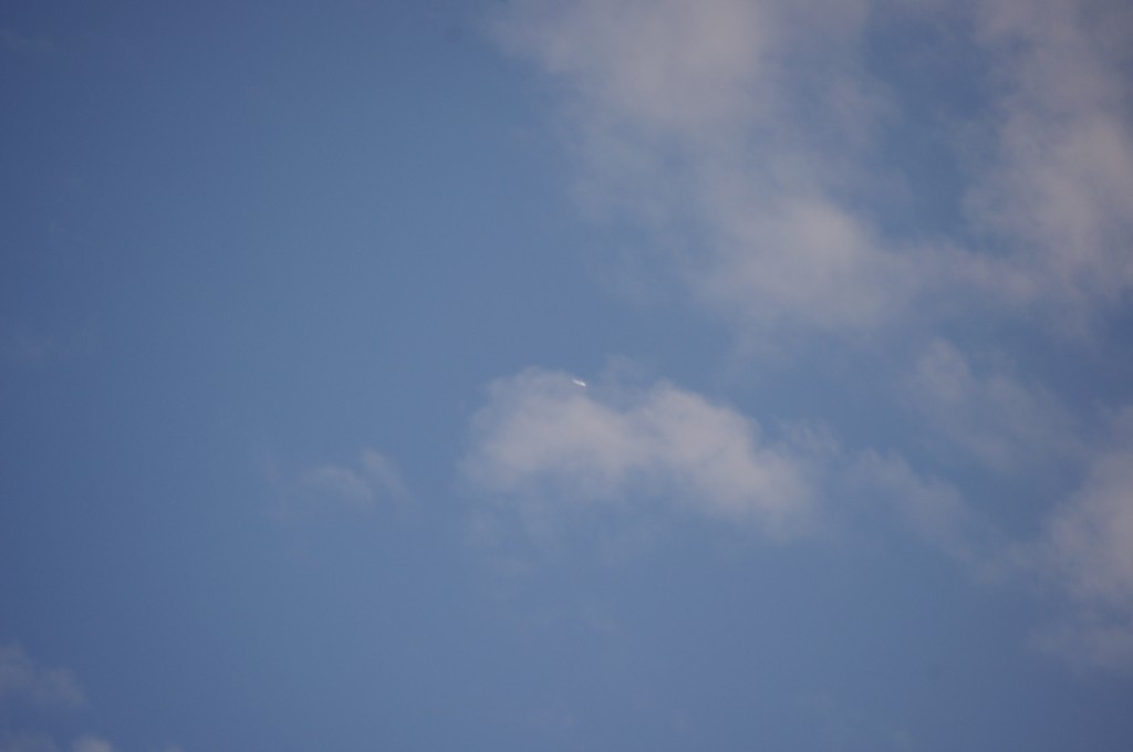 Leti odmah iza ovoga gore po istoj putanji, možda par km razmaka, dok sam još slikao ovoga gore, dođe mi i ovaj na nišan. I ovaj se ponaša isto kao ovaj gore, ali pušta trag dobro sakriven iza oblaka, tako da sam ga uhvatio tek kad je izašao iz oblaka s punim tragovima. Nažalost, opet sam sve slikao izvan fokusa, pa dajem full resize slike da se fino vidi kako ide bez traga, onda paf, praši ko lokomotiva.