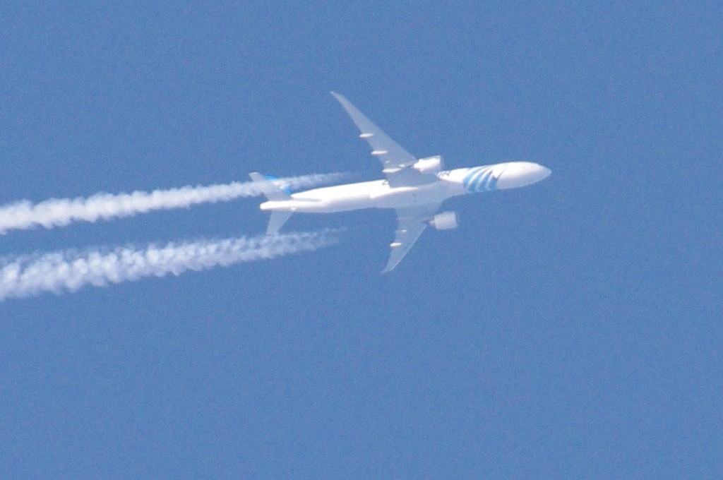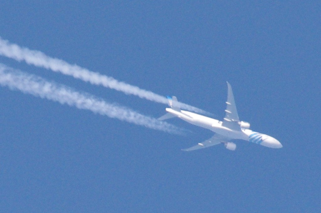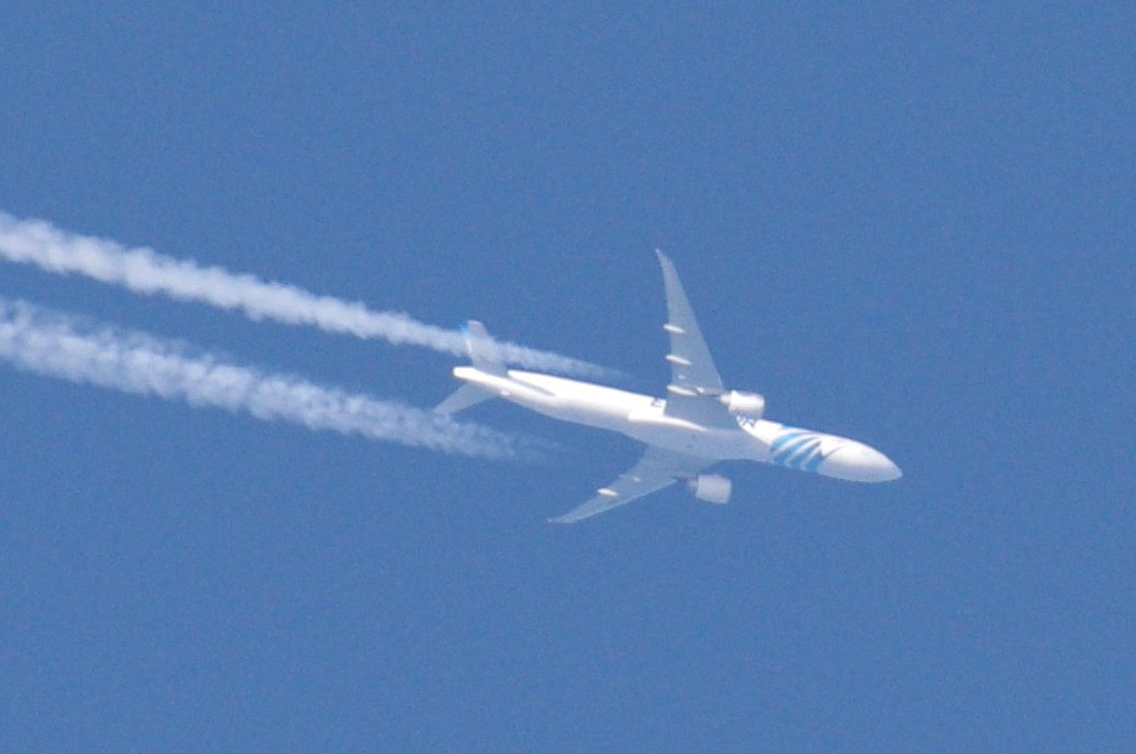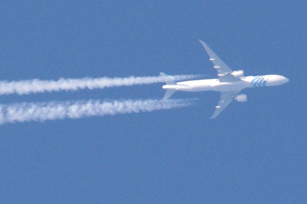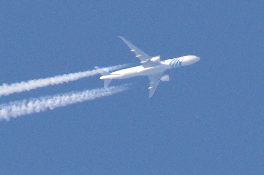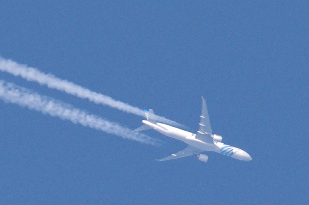 Danas je bilo vrlo prometno. Opet sam uhvatio BEZOLOVNI avion kako ide bez ikakva traga, a odmah iza njega prašinar na nižoj visini i to opet egipatski iz EGYPTAIR-a. Da ponovim: ovo je dokaz da civilne avio-kompanije sudjeluju u zaprašivanju s kemikalijama. Pa krenimo.