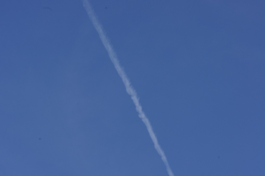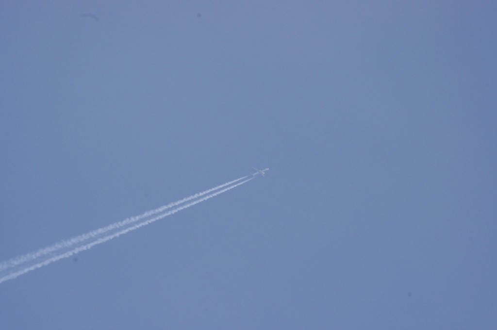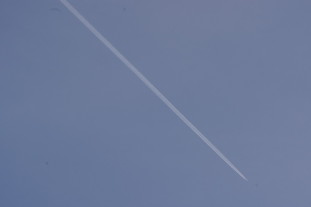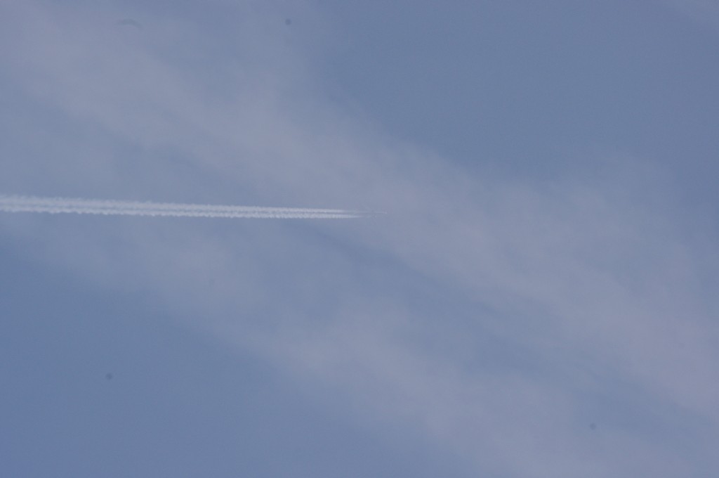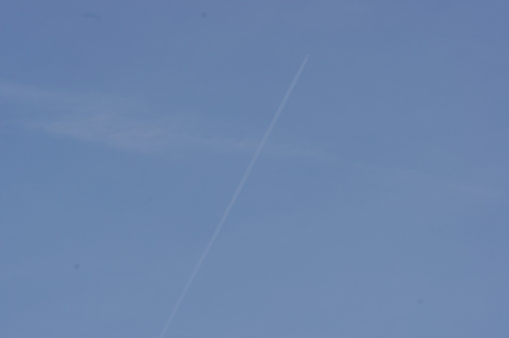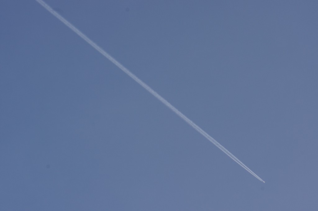Smjer N->S. Vrijeme 16.36h. Po motorima na 'guzici' pretpostavljam da je neka verzija Douglasa. Ovo je tzv. BEZOLOVNI avion, tj. avion koji ne ispušta ama baš nikakav trag iza sebe. Ovakvi avioni su prava rijetkost na nebu, a pružaju 100% dokaz da svi ostali avioni koji praše, a lete na istima ili manjim visinama u perfektnim vremenskim uvjetima, ispuštaju iz sebe kemikalije. Drugog objašnjenja nema. Jedino je čudno zašto i ovaj ne praši, a to može biti: ova kompanija ne sudjeluje u operaciji zaprašivanja ili mu je nestalo kemikalija.