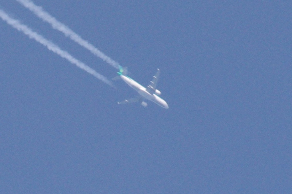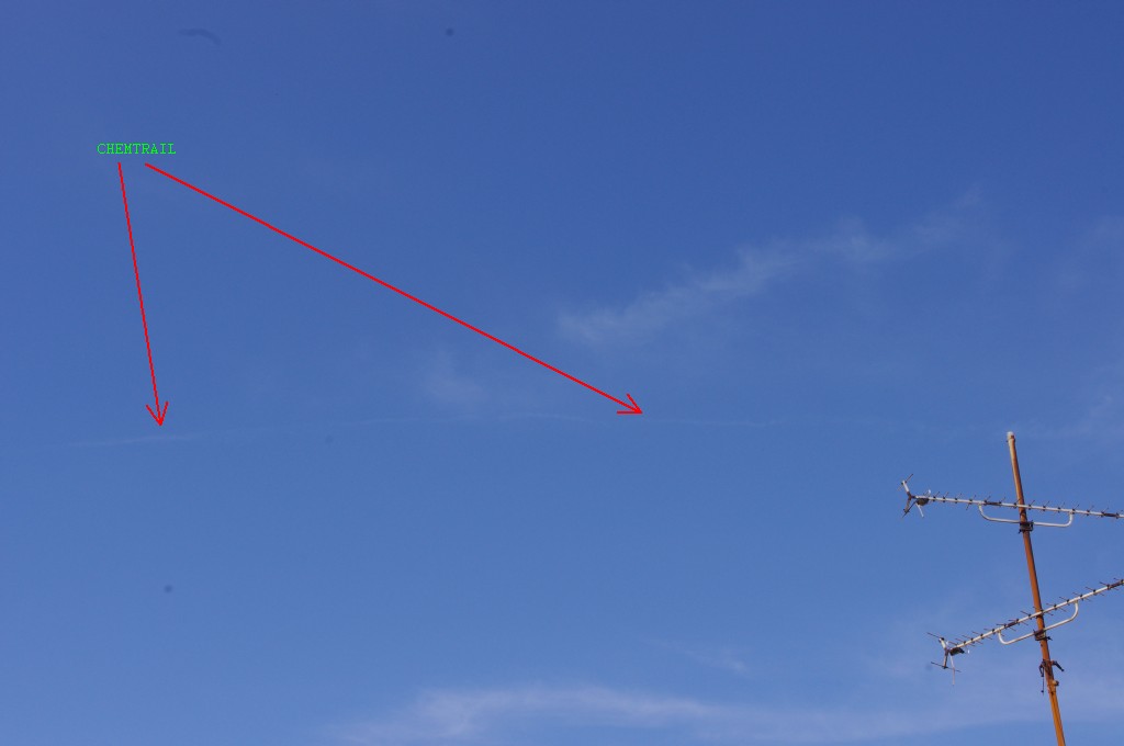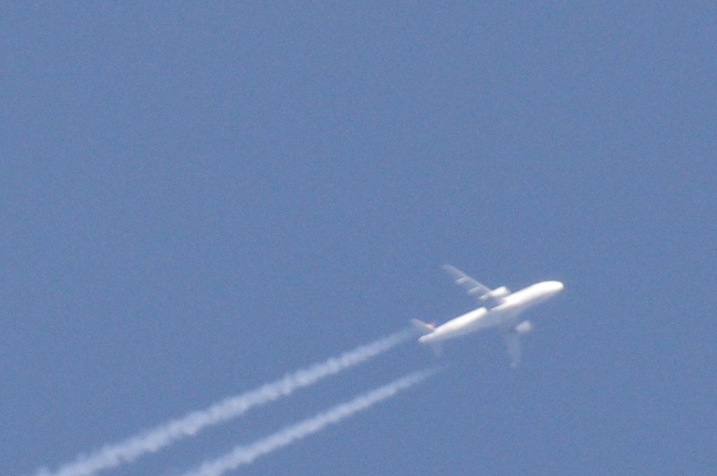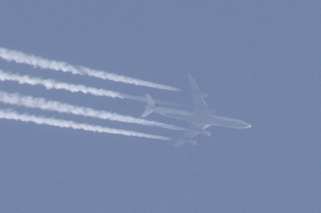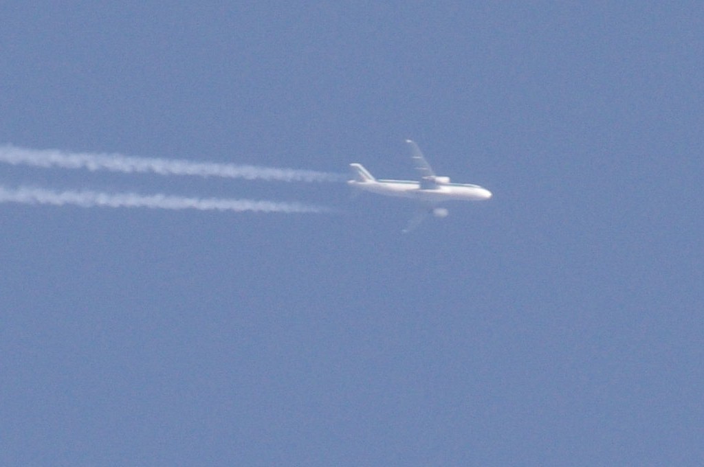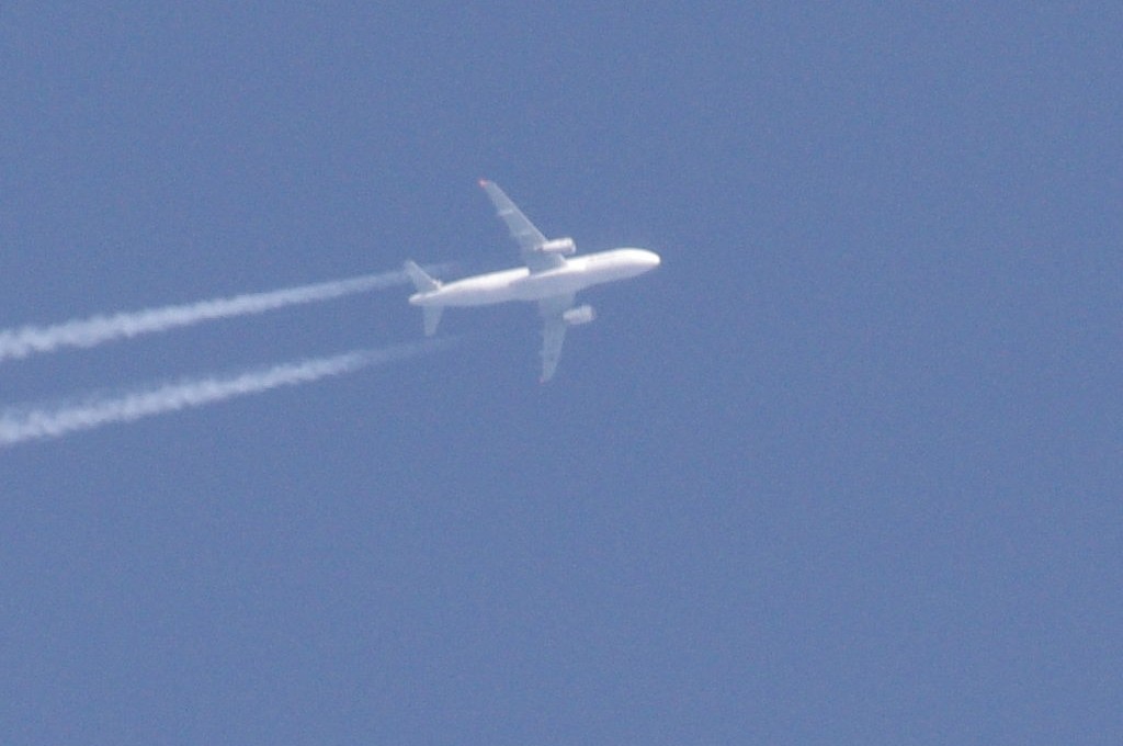 Smjer N->S. Vrijeme 16.36h. Po motorima na 'guzici' pretpostavljam da je neka verzija Douglasa. Ovo je tzv. BEZOLOVNI avion, tj. avion koji ne ispušta ama baš nikakav trag iza sebe. Ovakvi avioni su prava rijetkost na nebu, a pružaju 100% dokaz da svi ostali avioni koji praše, a lete na istima ili manjim visinama u perfektnim vremenskim uvjetima, ispuštaju iz sebe kemikalije. Drugog objašnjenja nema. Jedino je čudno zašto i ovaj ne praši, a to može biti: ova kompanija ne sudjeluje u operaciji zaprašivanja ili mu je nestalo kemikalija.