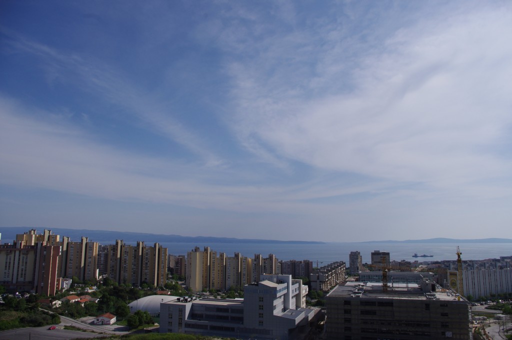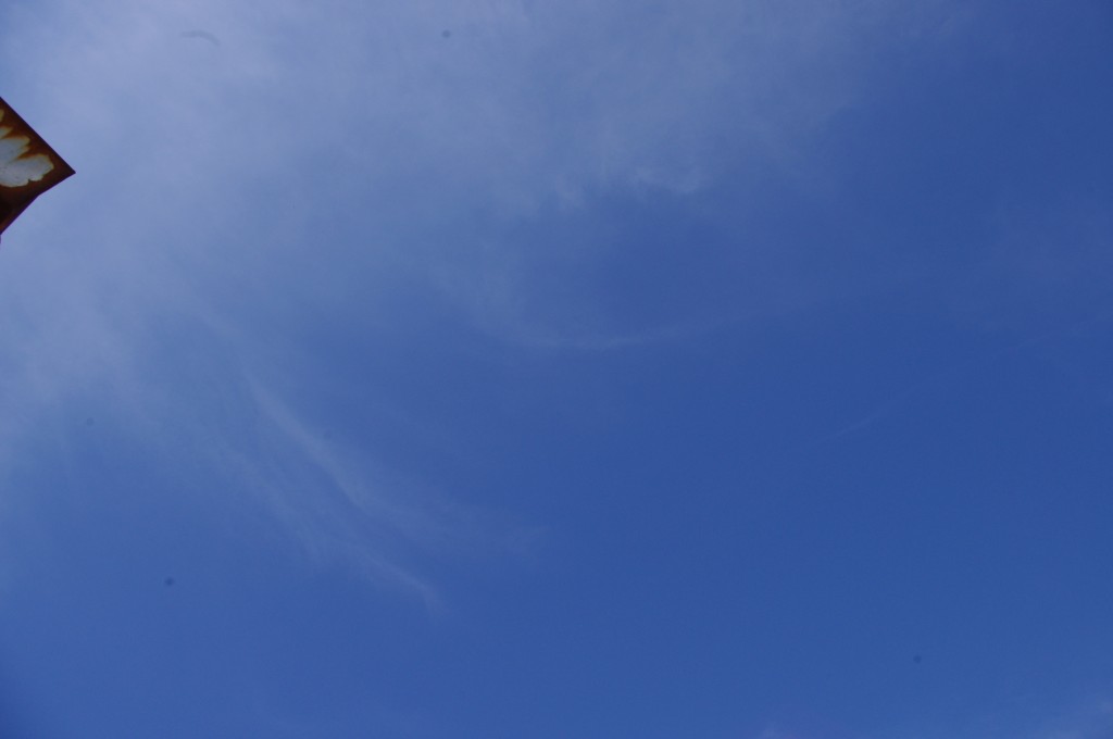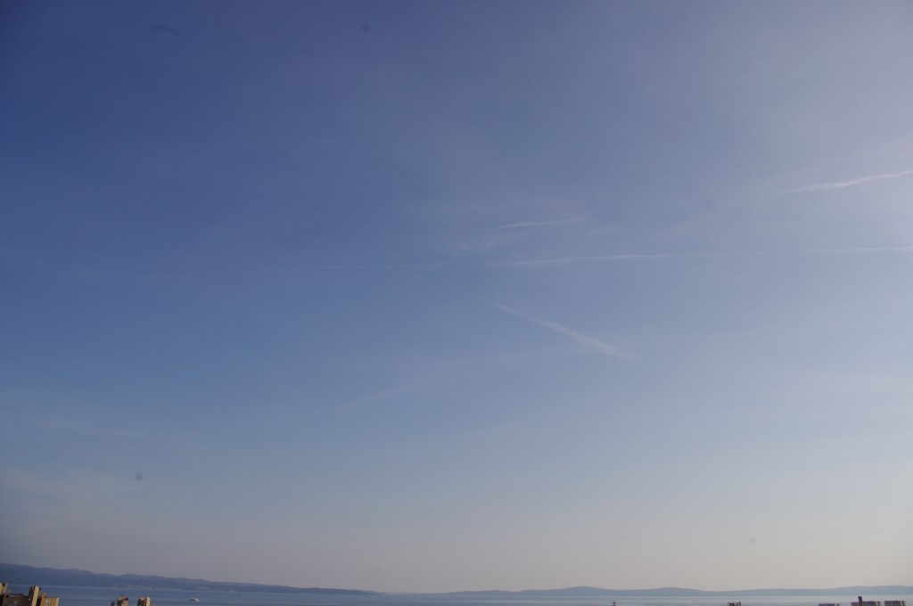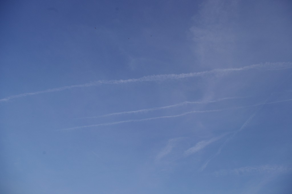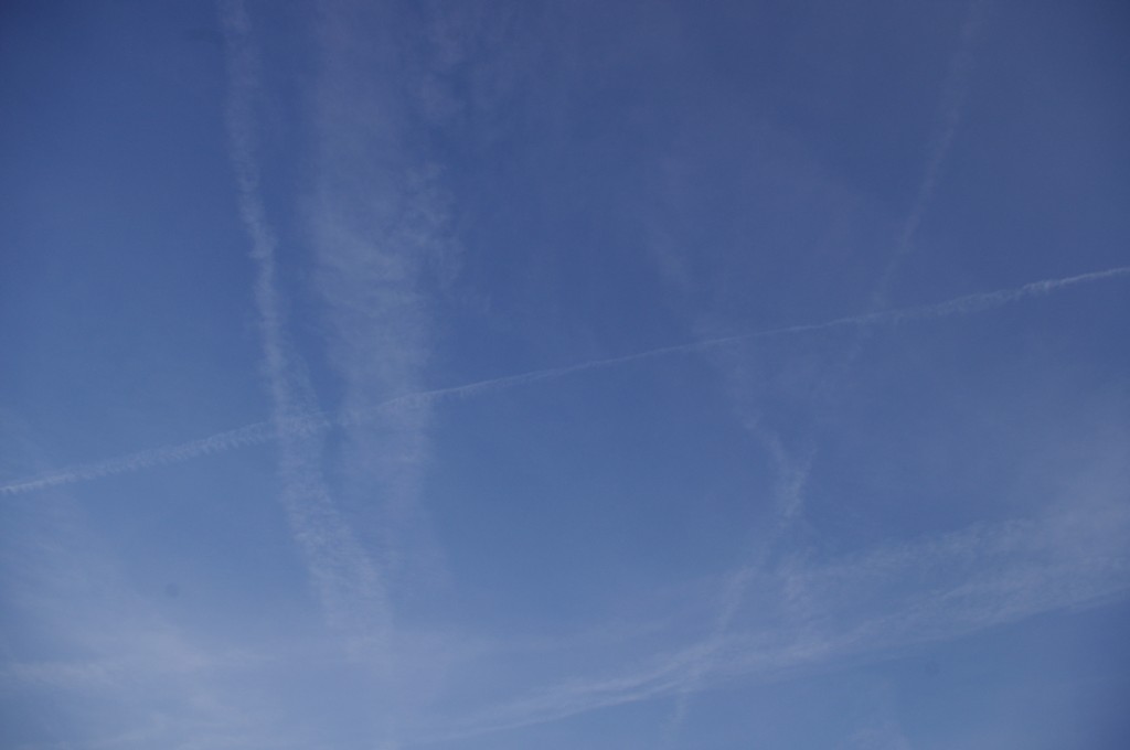 Izvukao sam 18mm objektiv, što inače izbjegavam, ali nebo je nakon ovih zadnjih 5 aviona bilo toliko zagađeno da sam jednostavno to morao uhvatiti s široko-kutnim objektivom. Pa evo panoramskog prikaza neba nakon djelovanja neprijateljske avijacije. Znači sve što se vidi na nebu je KEMIJSKI TRAG! Na sedmoj slici se jasno vide ukupno 6 tragova: 3 su E->W, a 3 su N->S, te tako tvore rešetkati pattern. Ja sam 'uhvatio' kako je nastalo 5 tragova, a ovaj jedan smjera N->S je očigledno malo stariji jer se već 'podebljao' i raširio, po debljini sudim da je star negdje oko 20-30 minuta.