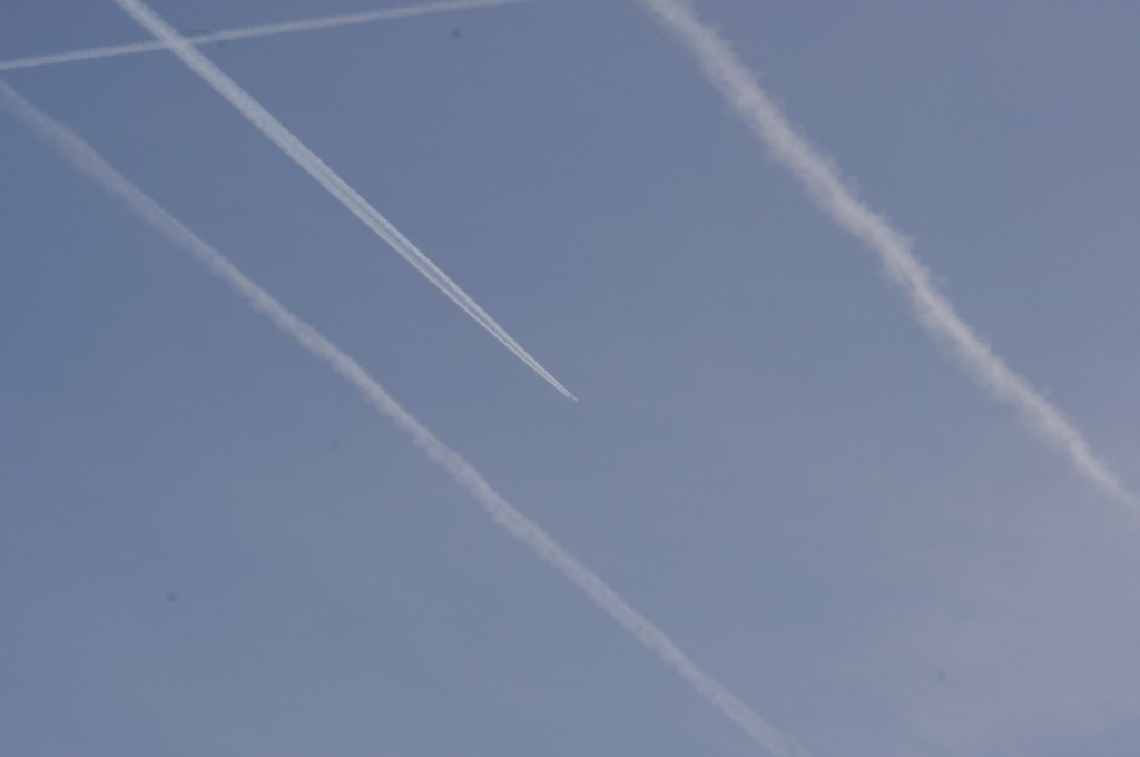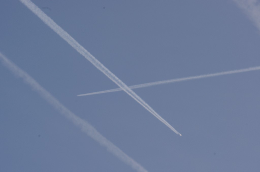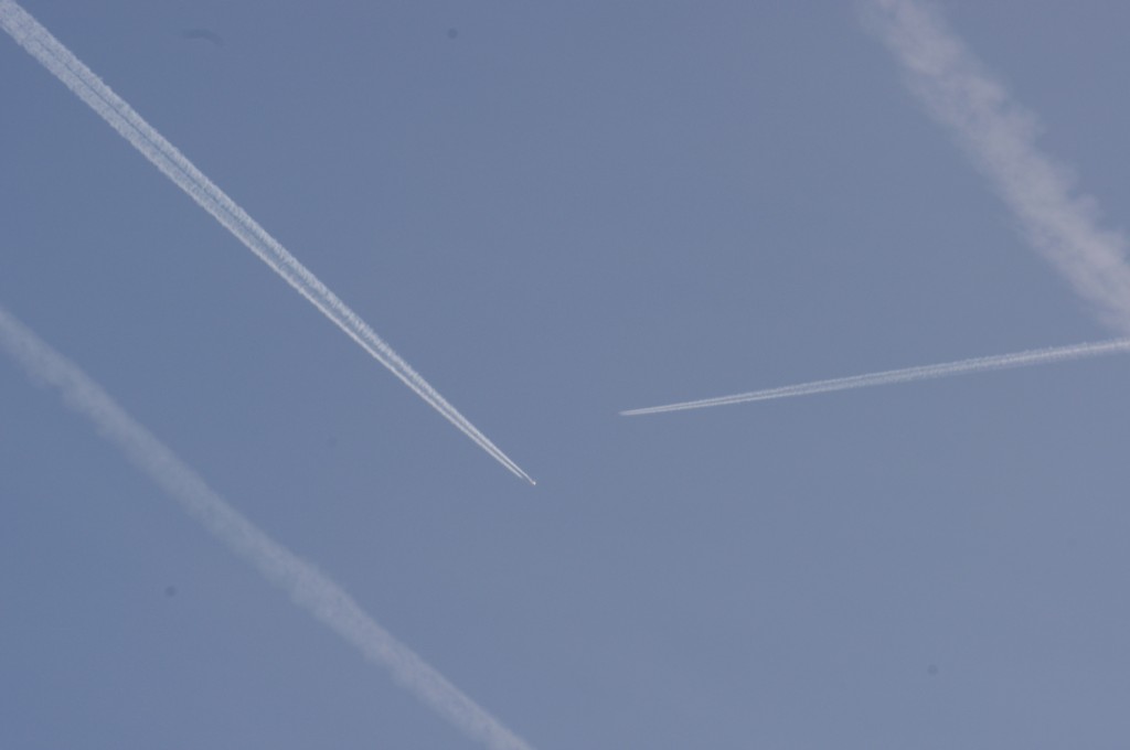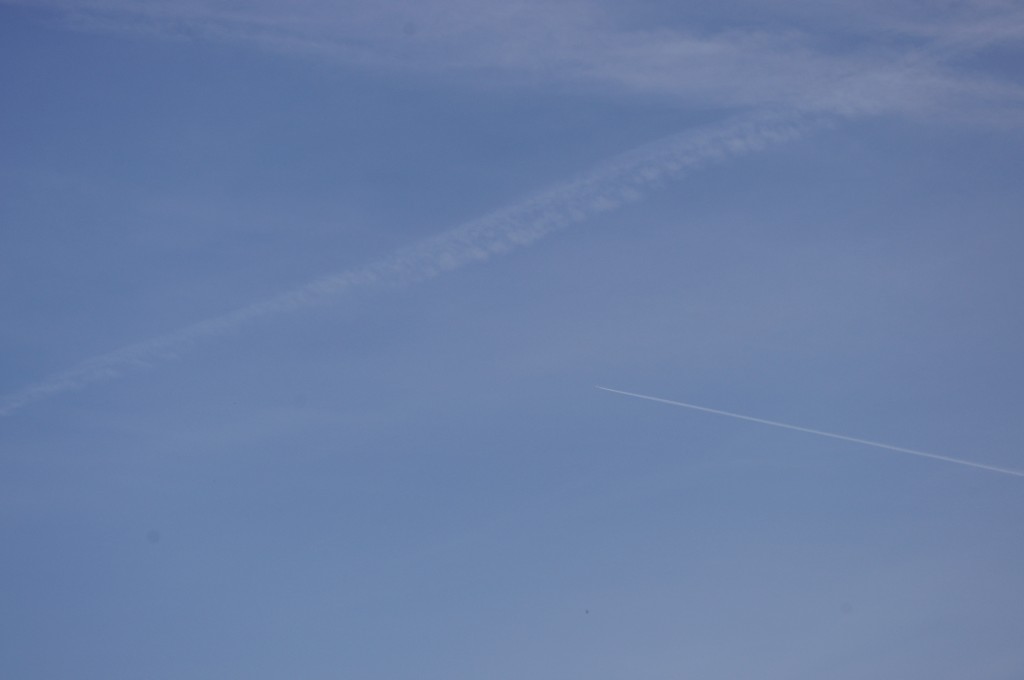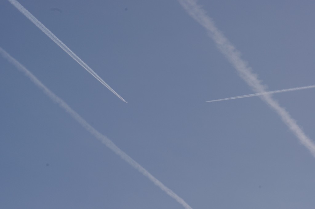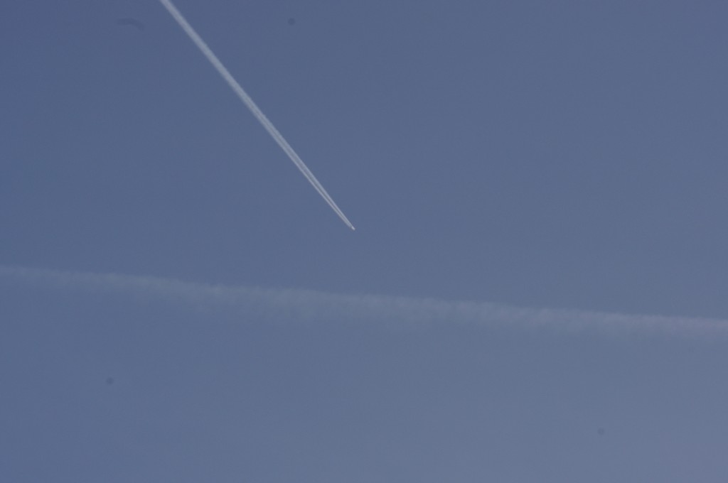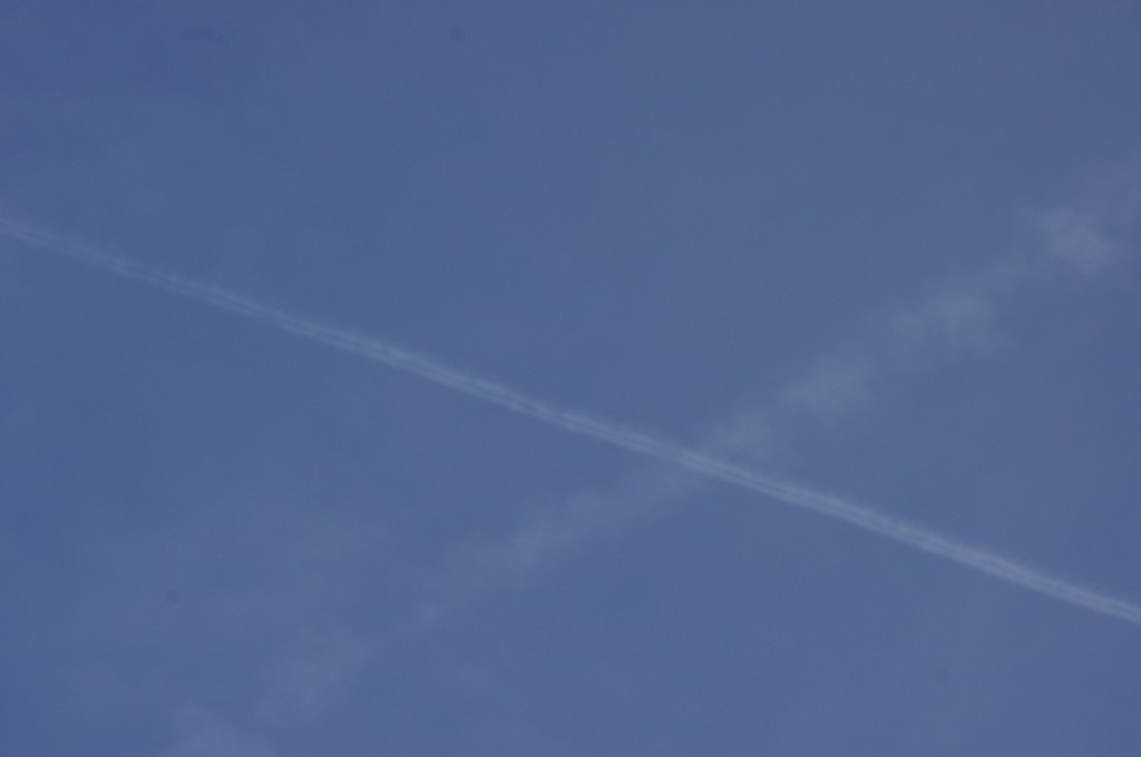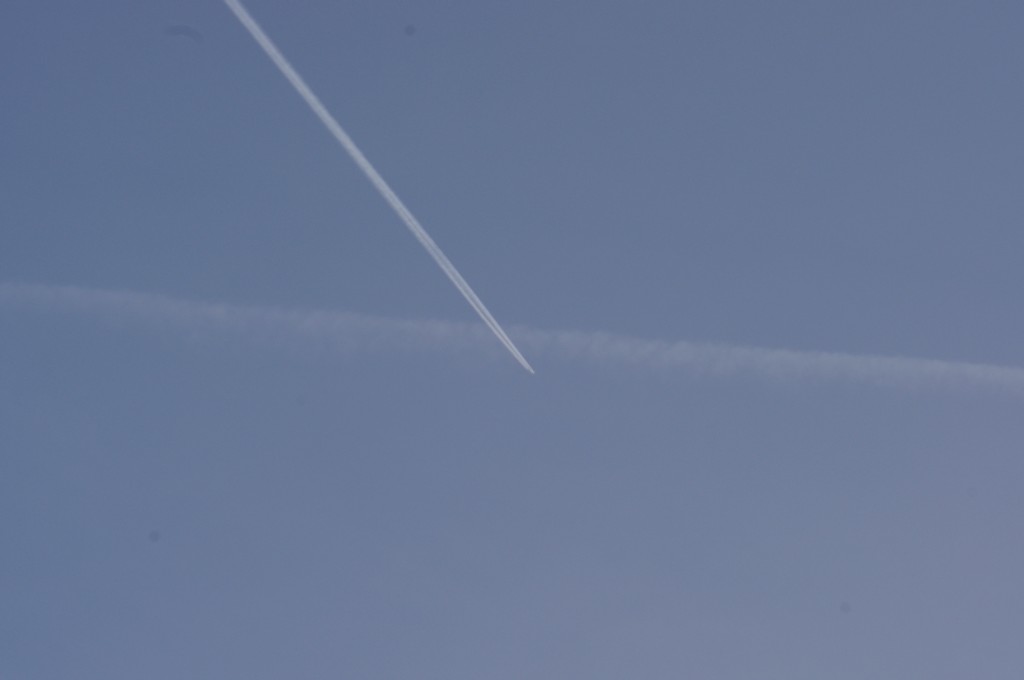 Ovo je moj dosada najbolje snimljeni križ uživo. Svaka im čast, ovi nisu pičkice, prošli su za dlaku jedan od drugoga unutar 1-2sekunde. Ova četiri traga: 3 paralelna od istoka k zapadu i ovaj križni od sjevera prema jugu će ostati do kraja dana i lagano se rasipati i potiho padati po nama, ubijajući nas jednog po jednog. Mamicu vam prašinarsku, sada sam vas uhvatio u nedjelu.