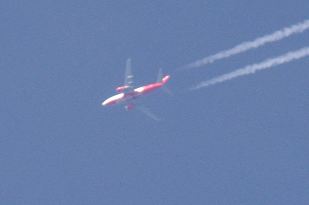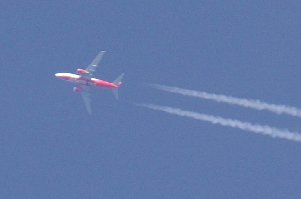 Smjer NW->SE. Vrijeme 16.54h. Nakon malo više iskustva, s 99% sigurnošču mogu reći da je ovo Boeing 737, a najviše se razaznaje po okruglim crnim točkama na trbuhu koji su u biti uvučeni kotači. Praši li ga praši. 100% prašinar u to nema sumnje.