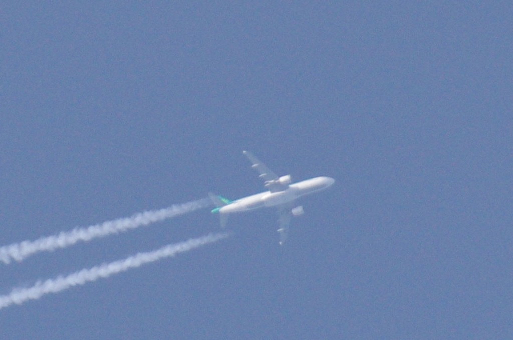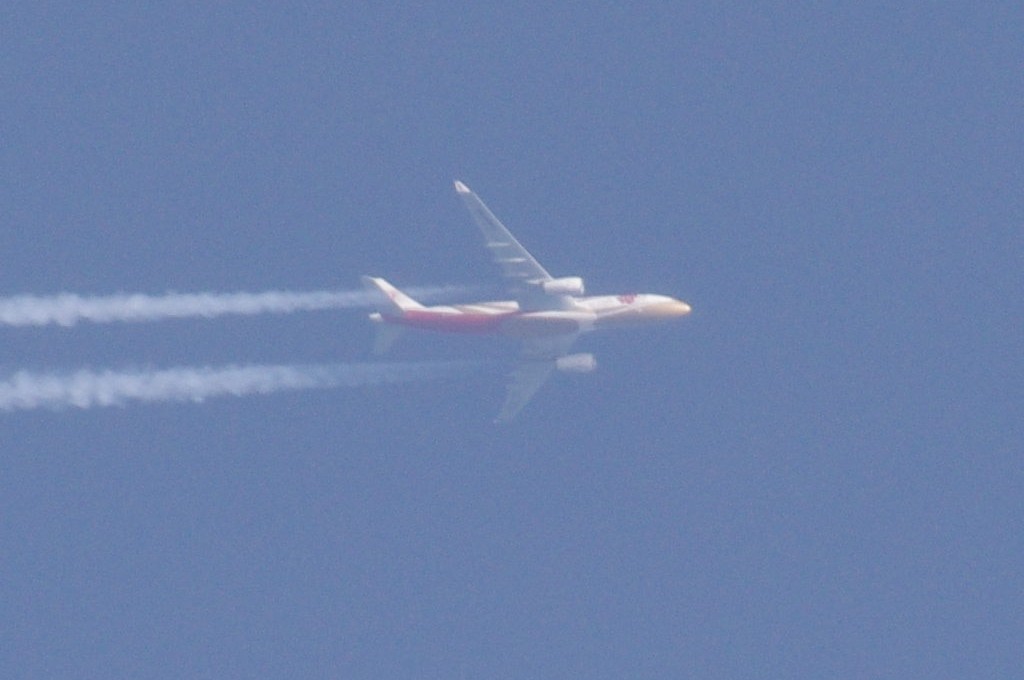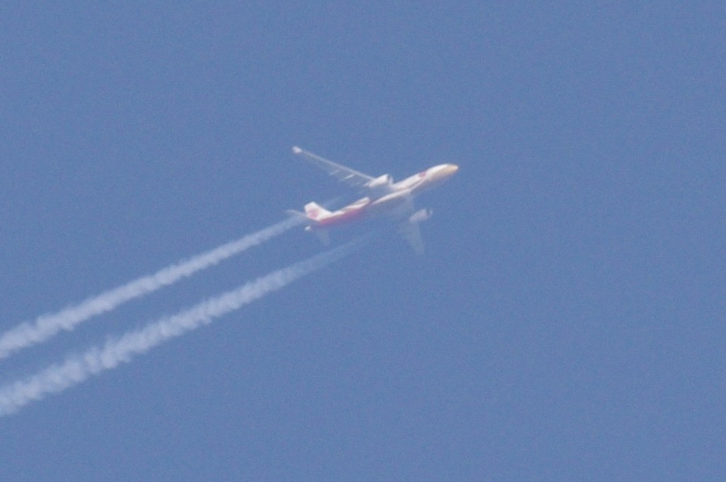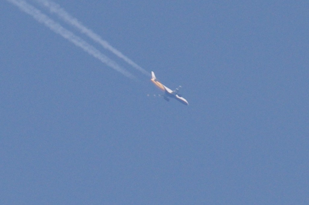 Smjer E->W. Vrijeme 18.33h. Odmah iza Talijanca, ide i ovaj prašinar. Mislim da je AirBus u pitanju, a prišio sam mu nadimak zlatno-guzi radi čudnih boja na trupu. Iskreno rečeno, prvi put ga vidim na nebu. Ide PARALELNO s tragom od prethodna dva aviona, dapače ide istom visinom i točno između tragova koje su ostavili njegovi prethodnici, tako tvoreći savršen prekrivač kemikalija.