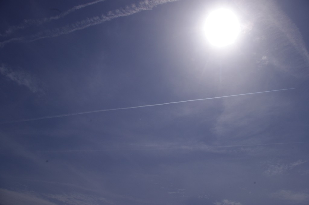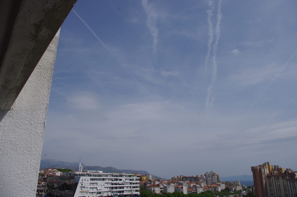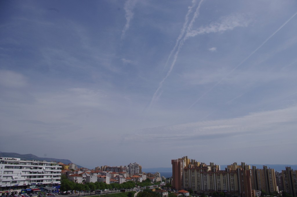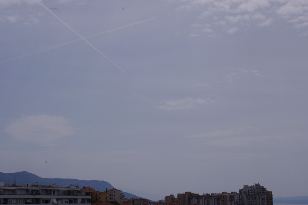 Prve tri slike su oko 6.30 ujutro snimane. Kao što se vidi zaprašivači rano počinju svoje ture, dapače, pitanje jeli uopće staju preko noći. Ostale snimke su nastale negdje oko 9-10sati, a zadnjih 8 oko 14-15h.Čak i u ovih par navrata što sam bezveze slikao nebo s kamerom, uhvatio sam stvaranje križa, probijanje procijepa po umjetnim oblacima (dark beam), te linijsko zaprašivanje ispod sunca koje zaprašivaćima očigledno najviše smeta.